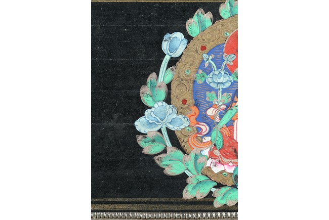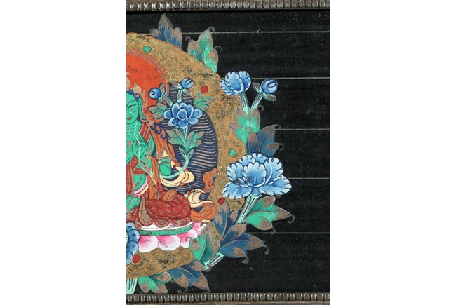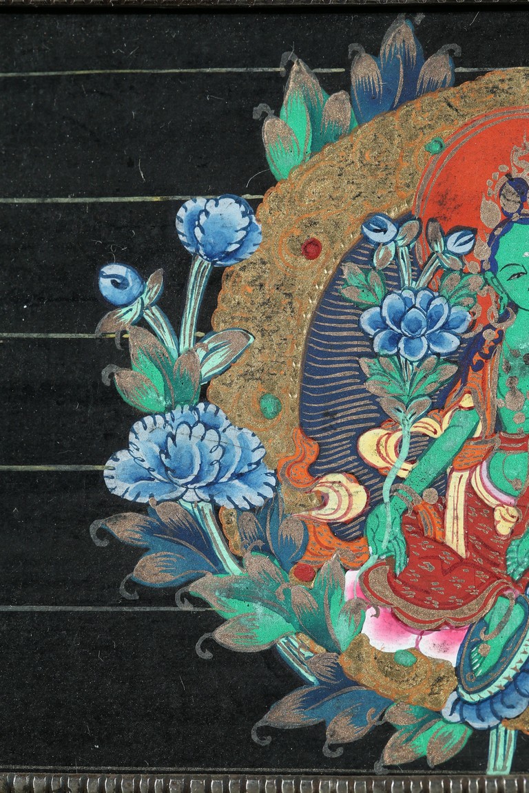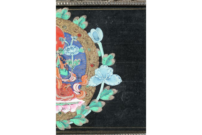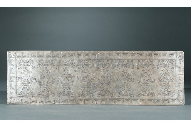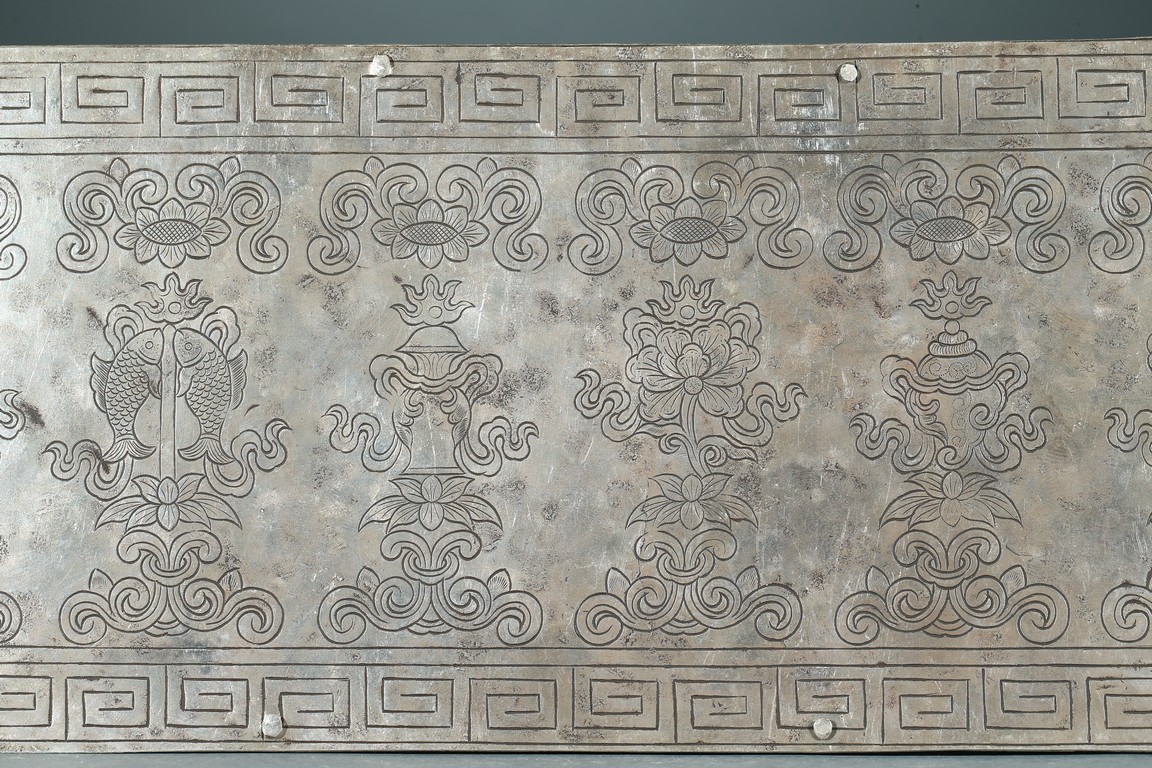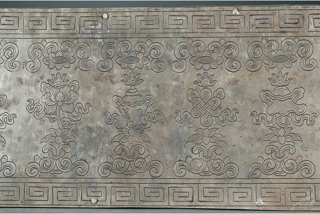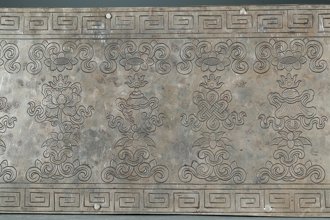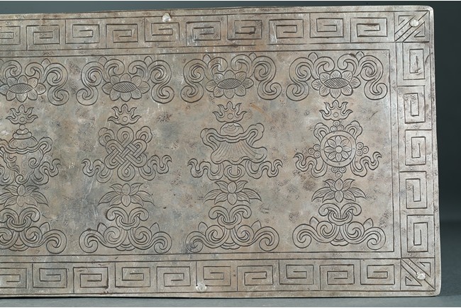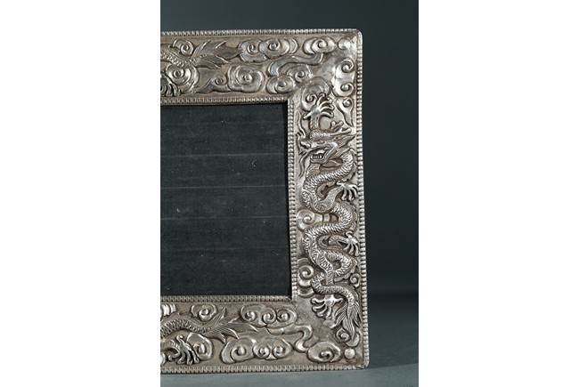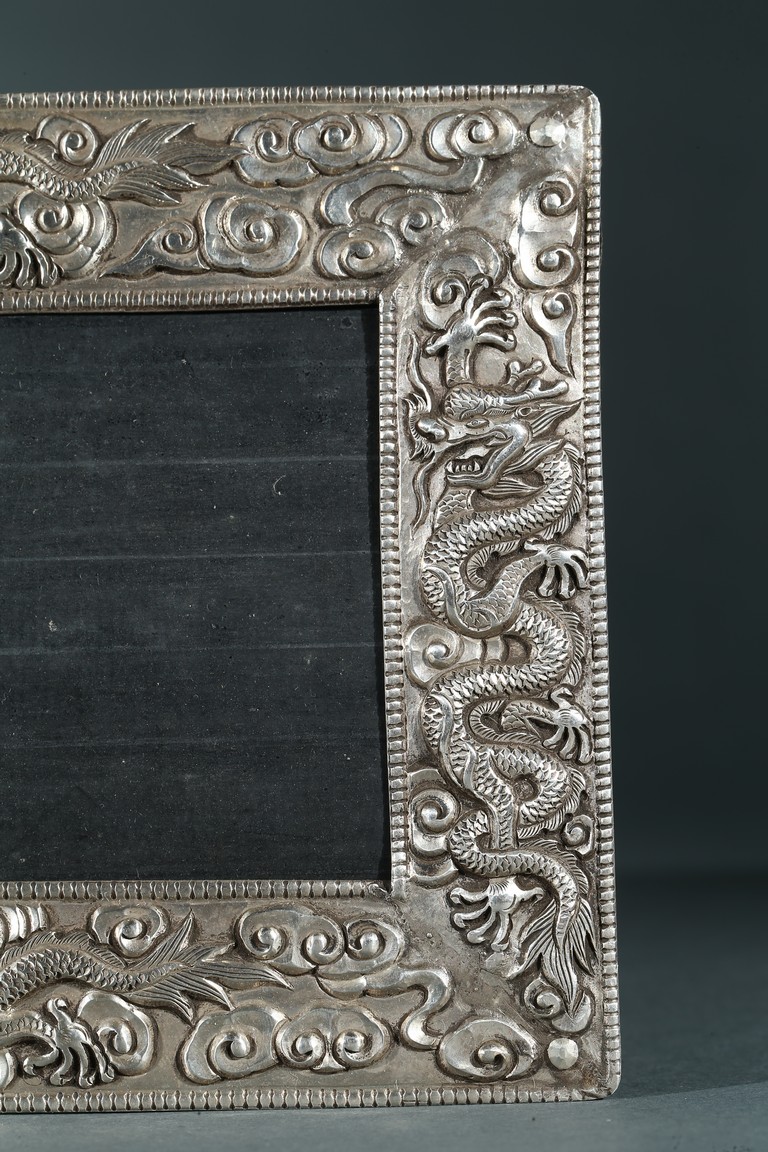 Each manuscript cover painted to the center with a bodhisattva medallion in various pigments, the silver border cast with sinuous confronted five-claw dragons chasing flaming pearl, the reverse incised with the eight buddhist emblems. Qing Dynasty period.