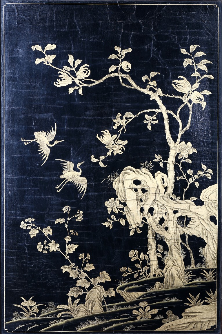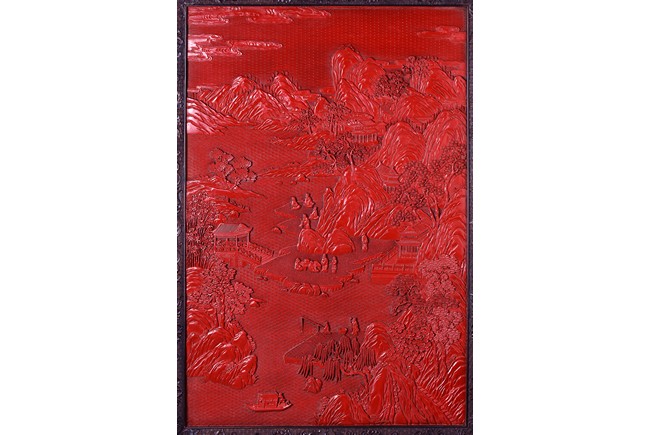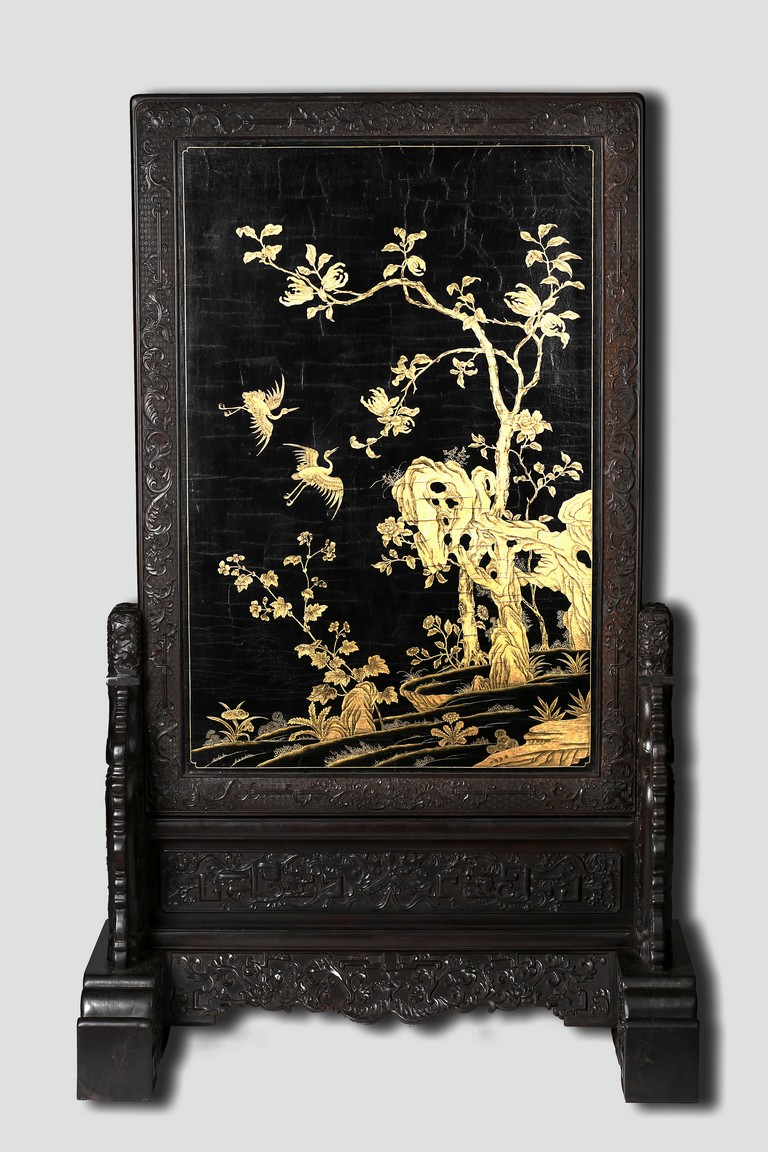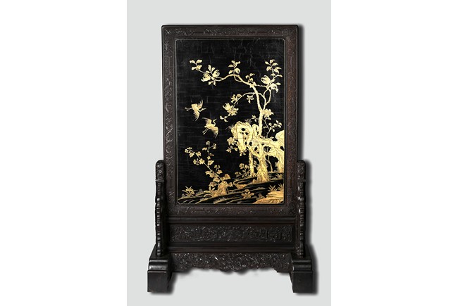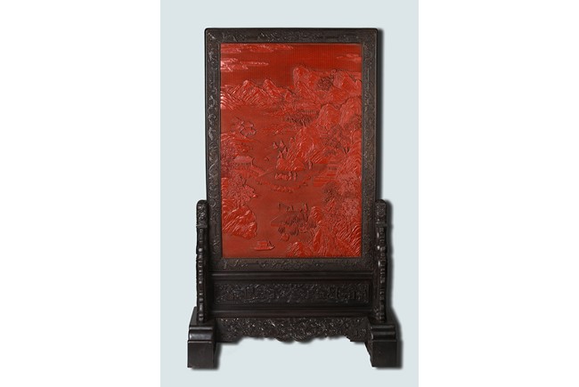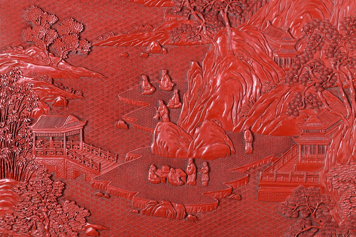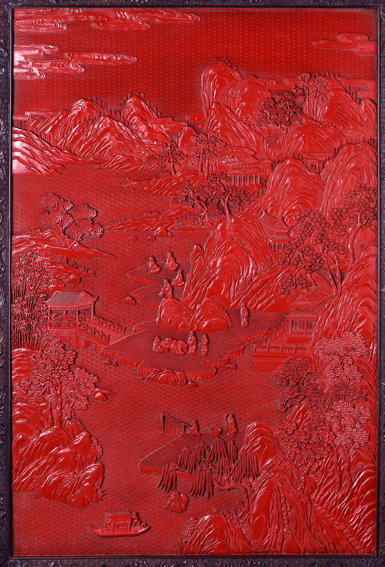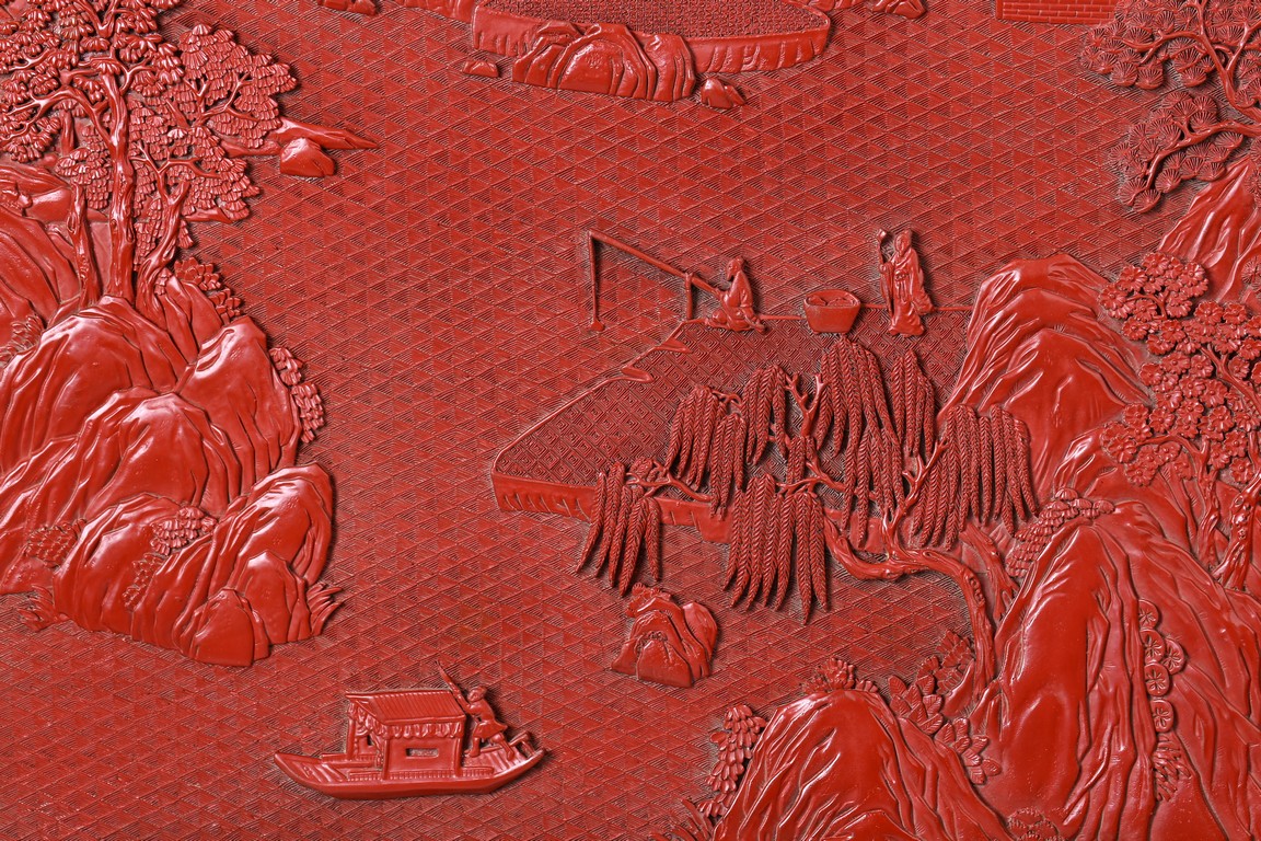 The rectangular screen intricately carved on one side with groups of scholarly figures attended by acolytes in mountain settings with walled pavilions standing on rocky shore, on the bottom part depicting a boatman standing on a covered raft in a river estuary setting facing a large overhanging cliff face with pine, bamboo and willow trees growing from the crags, and a fisherman sitting along the shoreside accompanied by an elder scholar, all enclosed in finely carved wood border, the reverse gilt-painted with flower and bird scene. Republic period.
