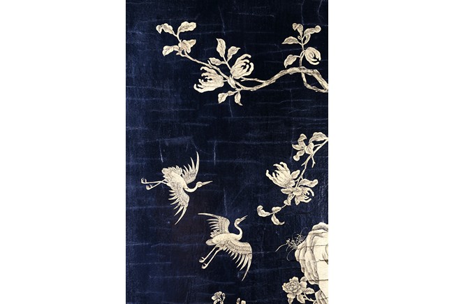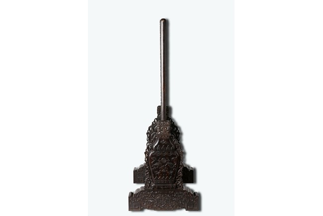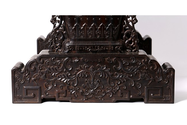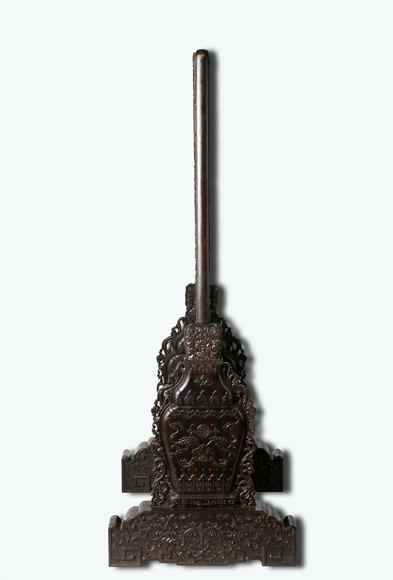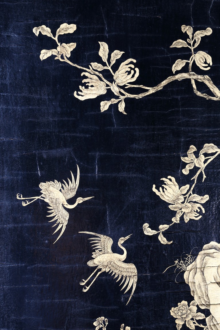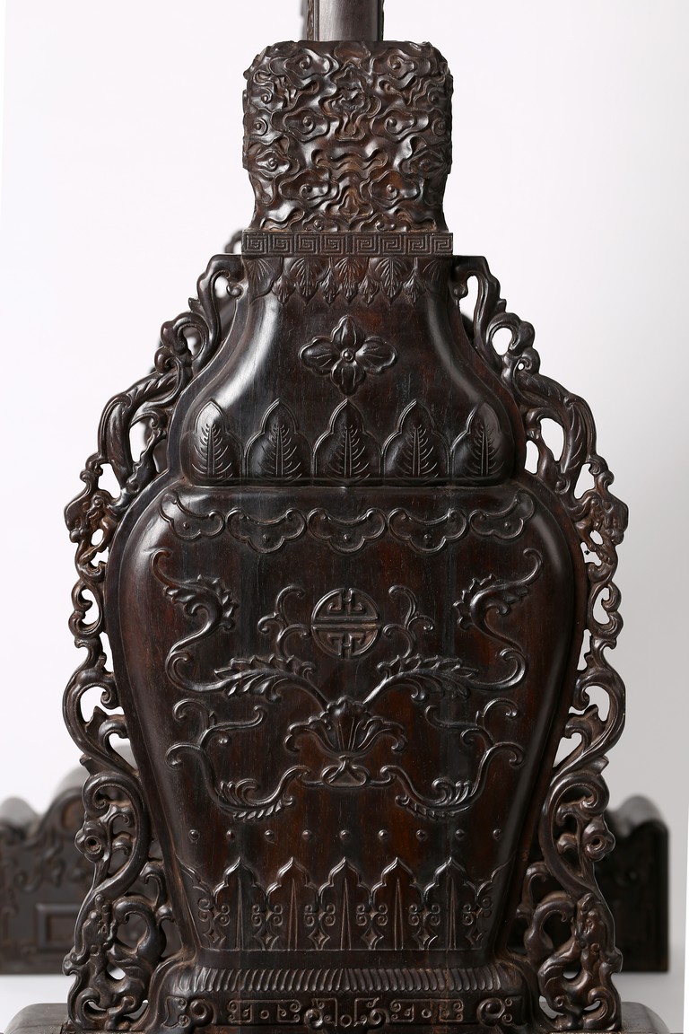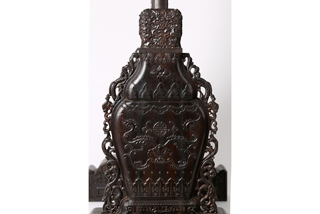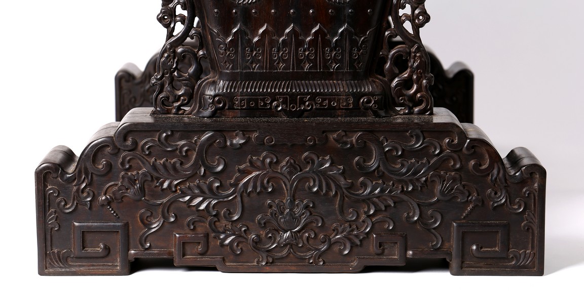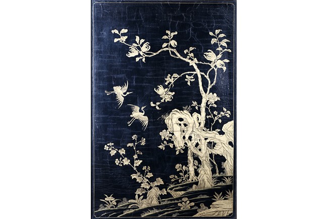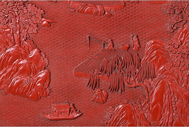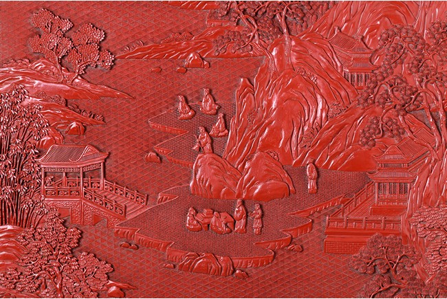 The rectangular screen intricately carved on one side with groups of scholarly figures attended by acolytes in mountain settings with walled pavilions standing on rocky shore, on the bottom part depicting a boatman standing on a covered raft in a river estuary setting facing a large overhanging cliff face with pine, bamboo and willow trees growing from the crags, and a fisherman sitting along the shoreside accompanied by an elder scholar, all enclosed in finely carved wood border, the reverse gilt-painted with flower and bird scene. Republic period.