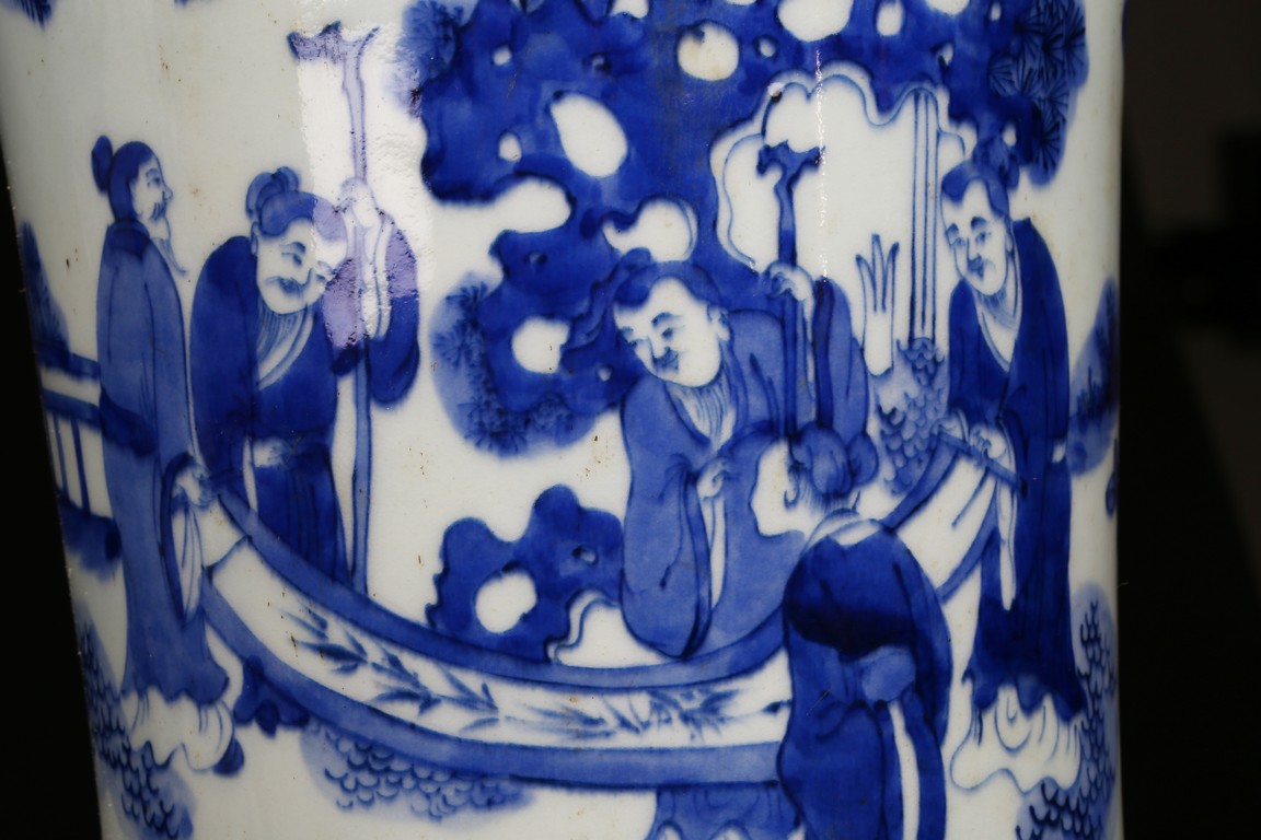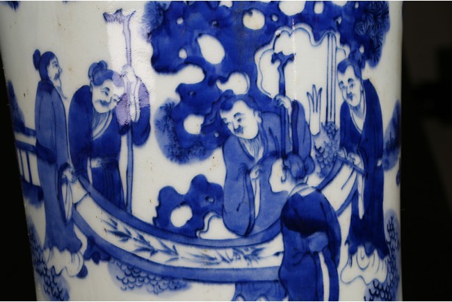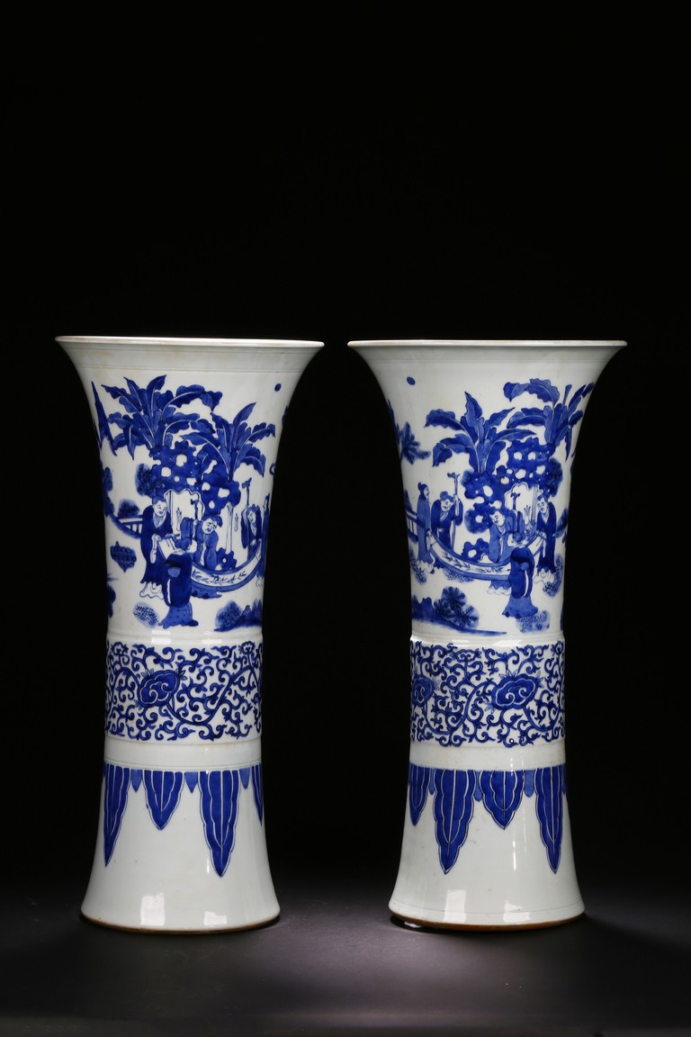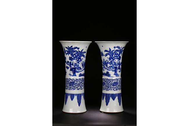 Each of flared rim, the top main part fainly painted group of elder officials appreciating a flower painting under tall trees in a garden setting, the middle section decorated with band of meandering lotus and auspicious ruyi emblems, the bottom section with band of floral lappets. 20th century.