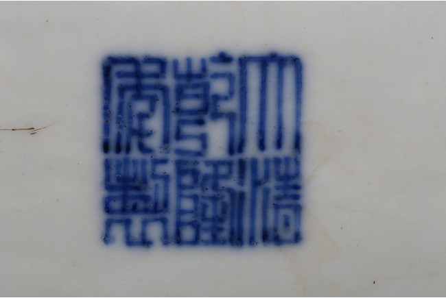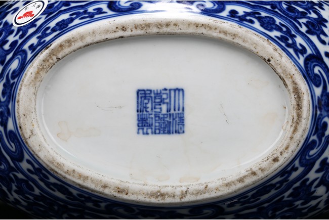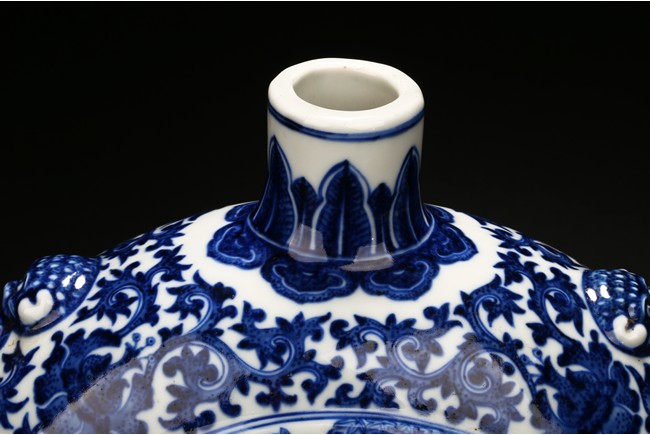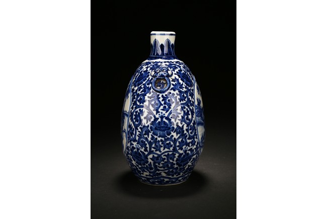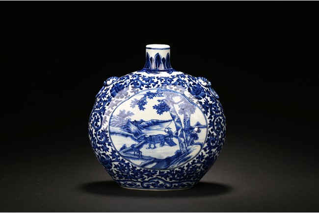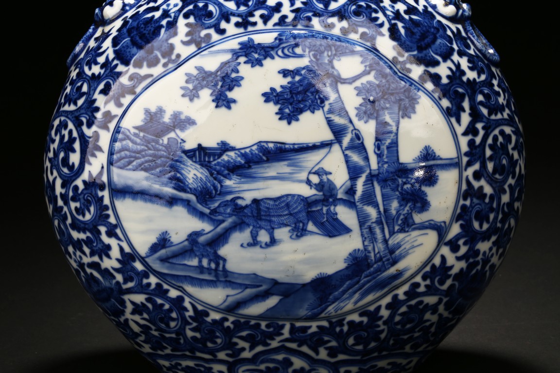 The flattened circular body rising to a small straight neck decorated with band of floral lappet, flanked by a pair of beast mask on the high shoulders, in the similar oval panel depicting a farmer holding a whip to drive the cattle move ahead in a mountain setting, all reserved on scrolled lotus ground, the base with a six character mark.