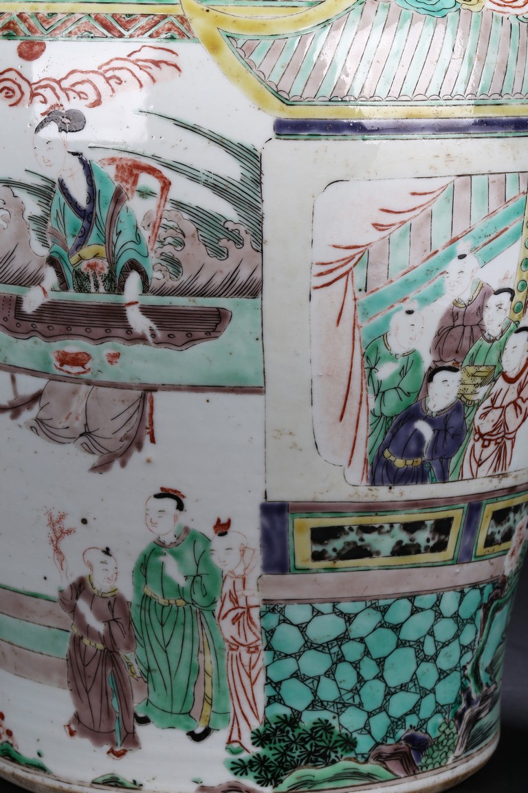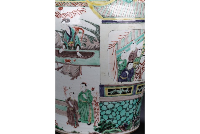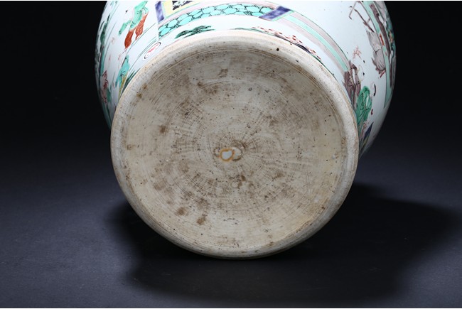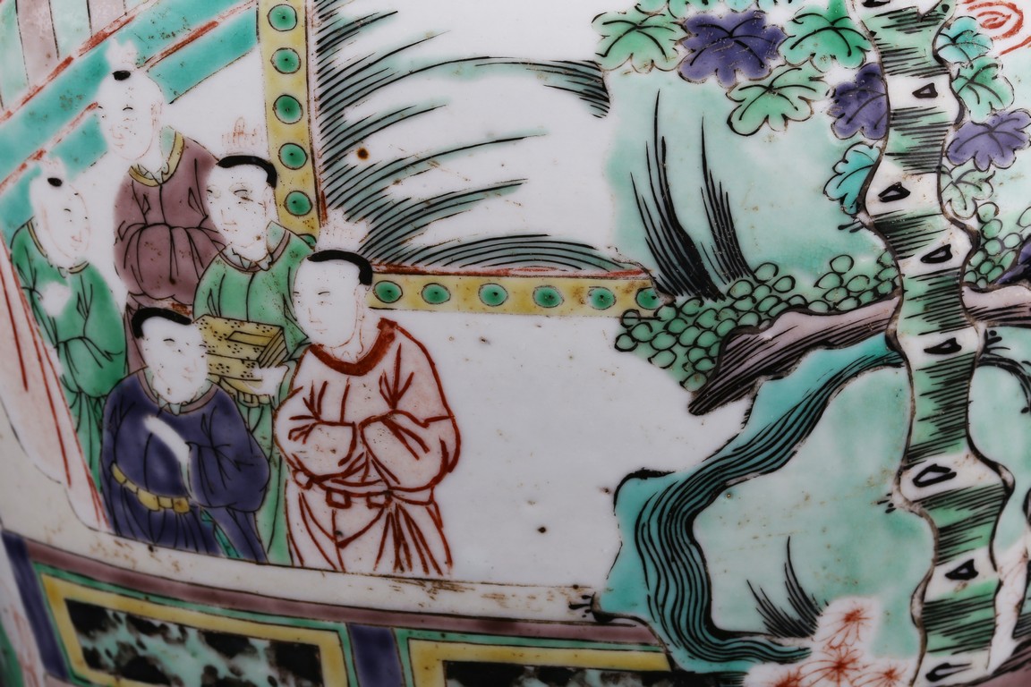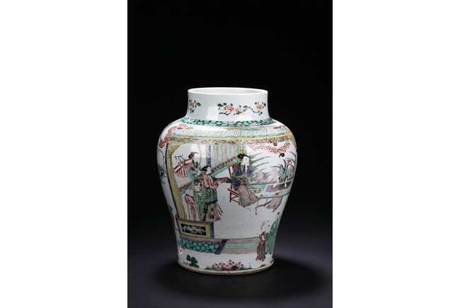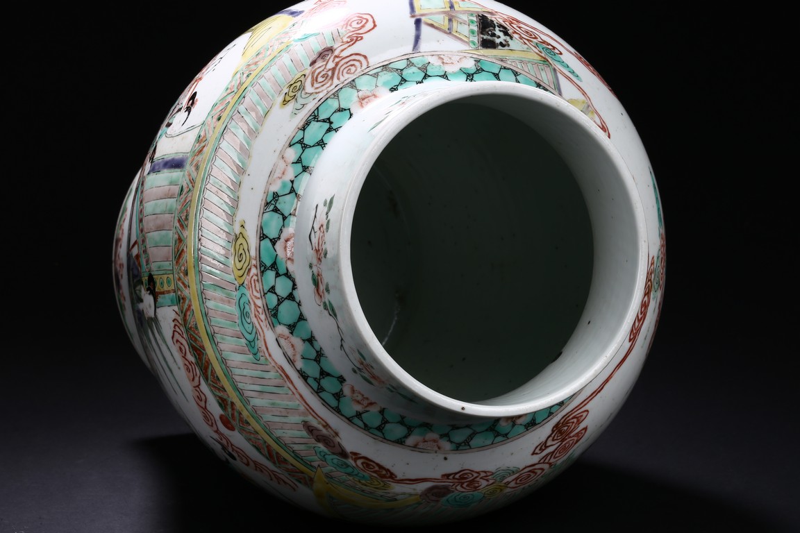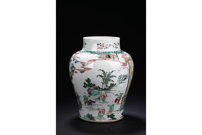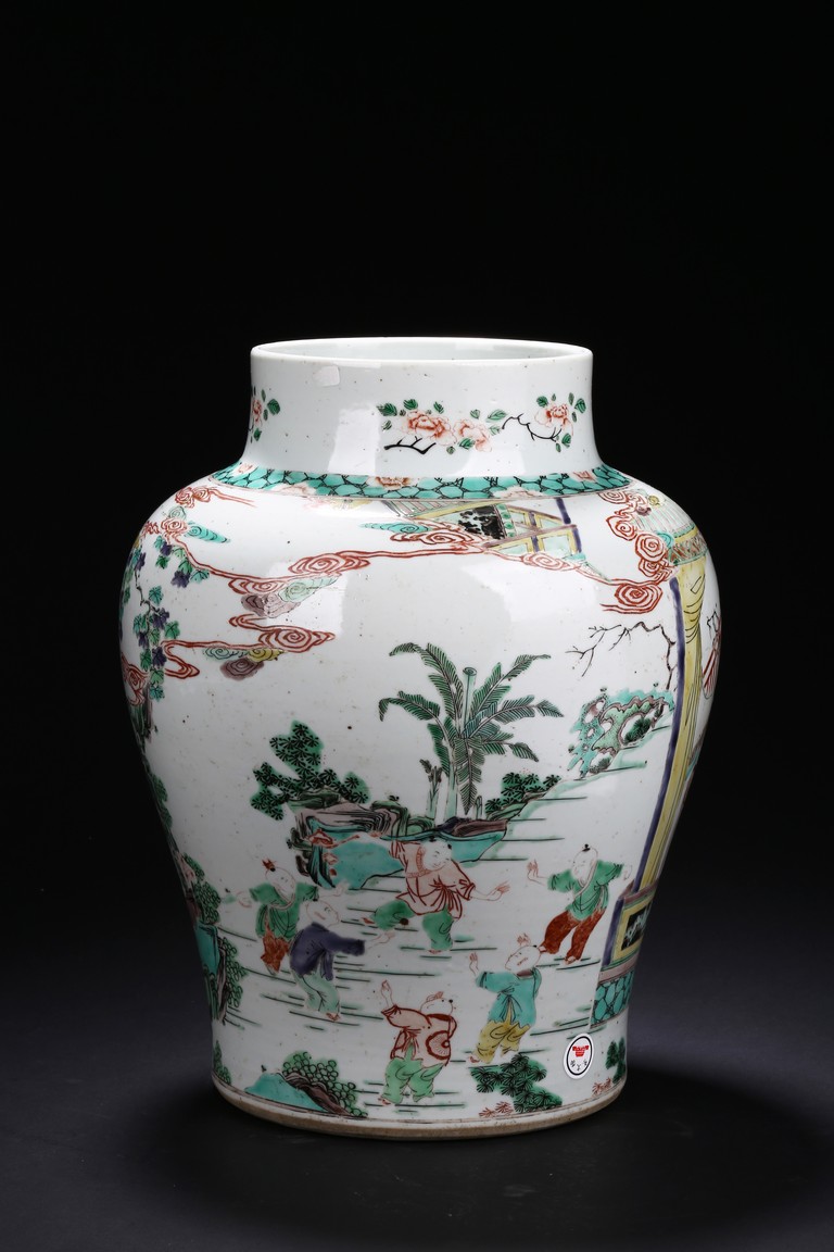 The jar rising to a high shoulder with a broad straight neck decorated with peony branch, the front body deftly painted beauties and children gathering together to appreciate ancient zither, the other side with scene of group of naughty children playing in a garden setting.