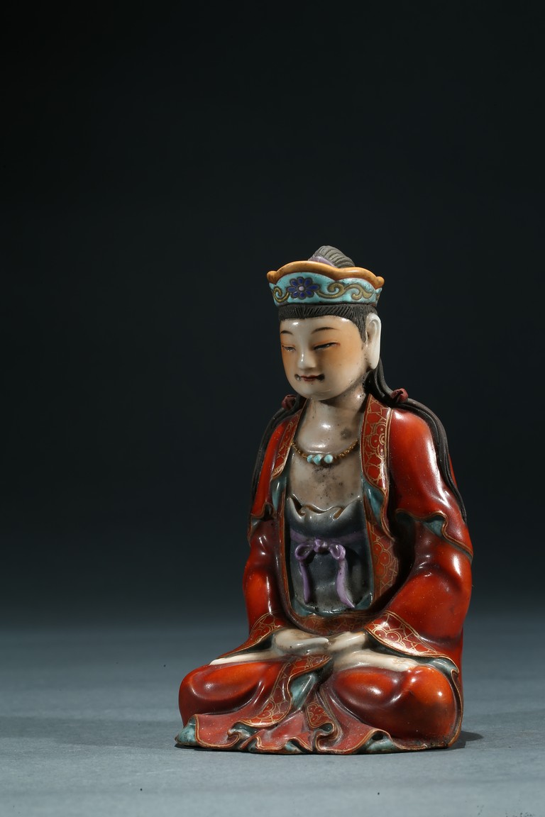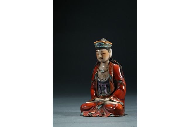 The well modelled ceramic figure is shown seated with hands held together rested upon feet, wearing red-glazed long robe revealing chest, face with serene expression. Late Qing Dynasty period.
