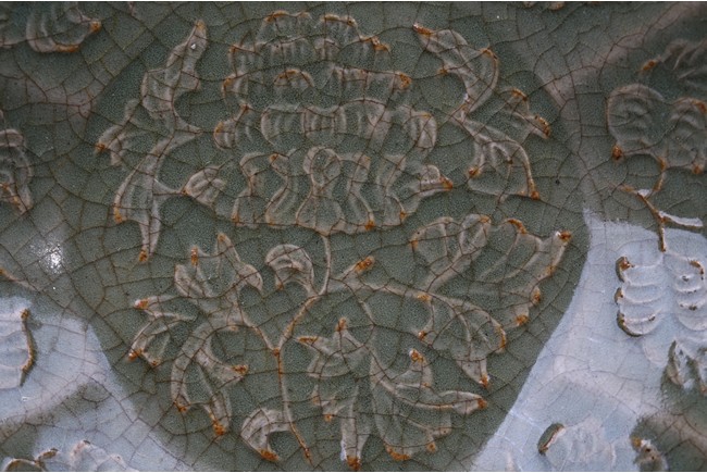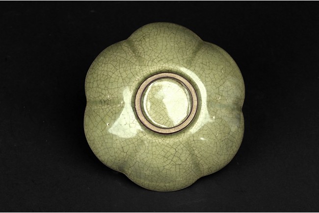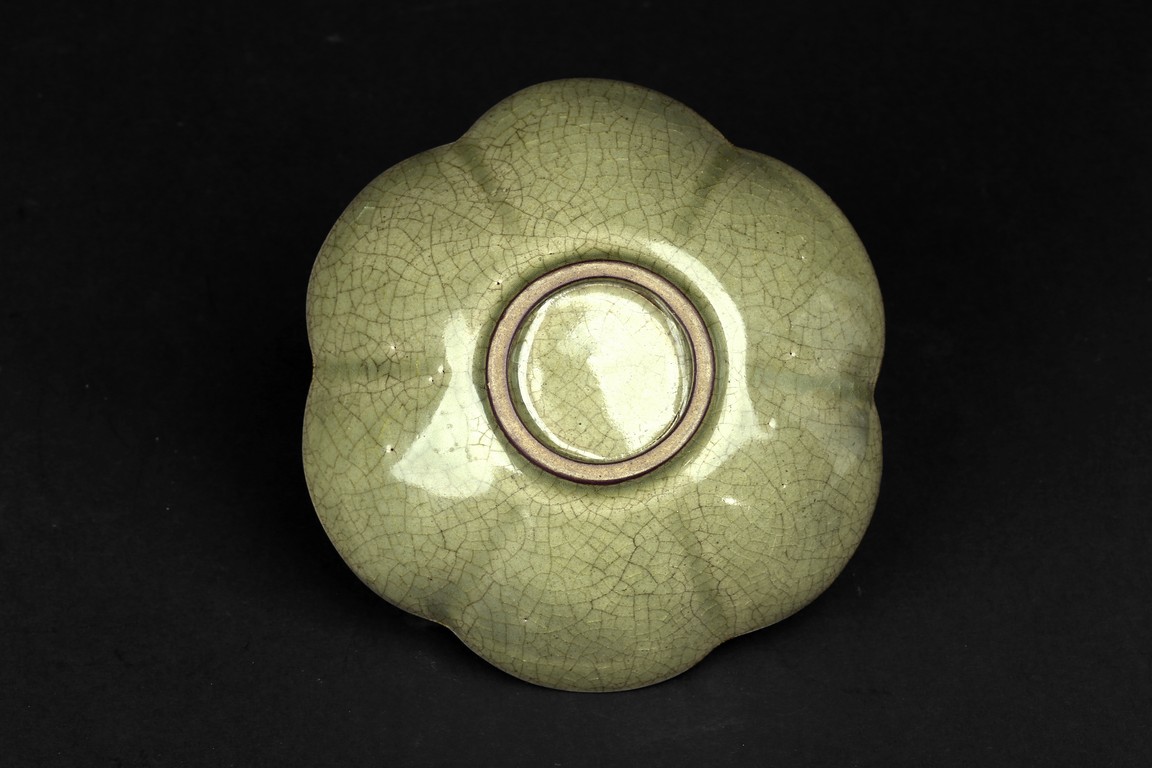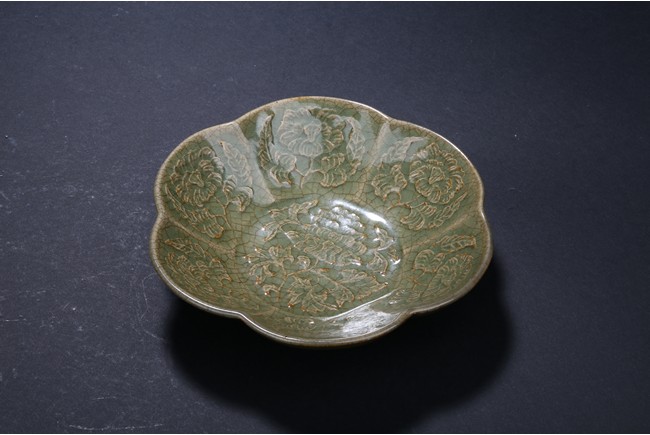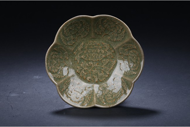 Of six lobe, overall celadon glazed and carved with floral design.