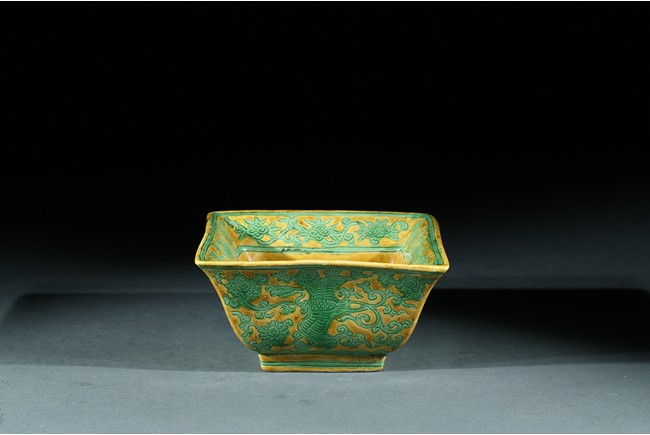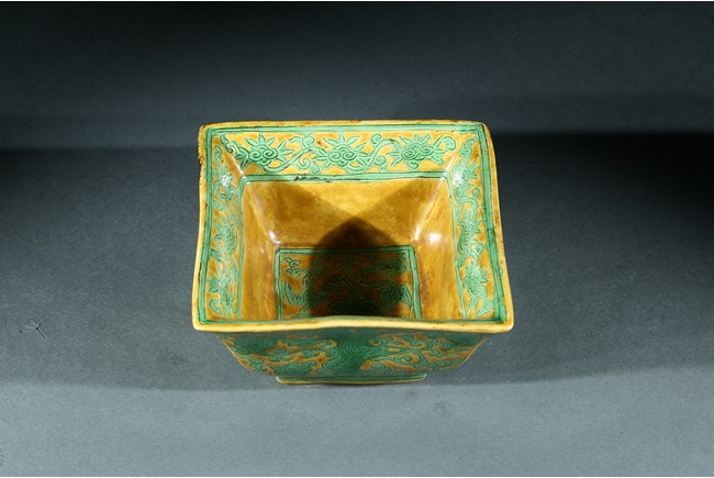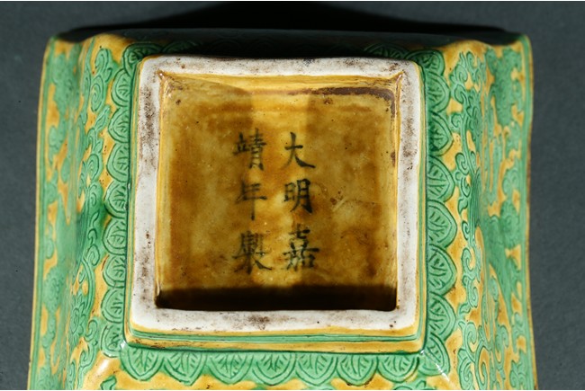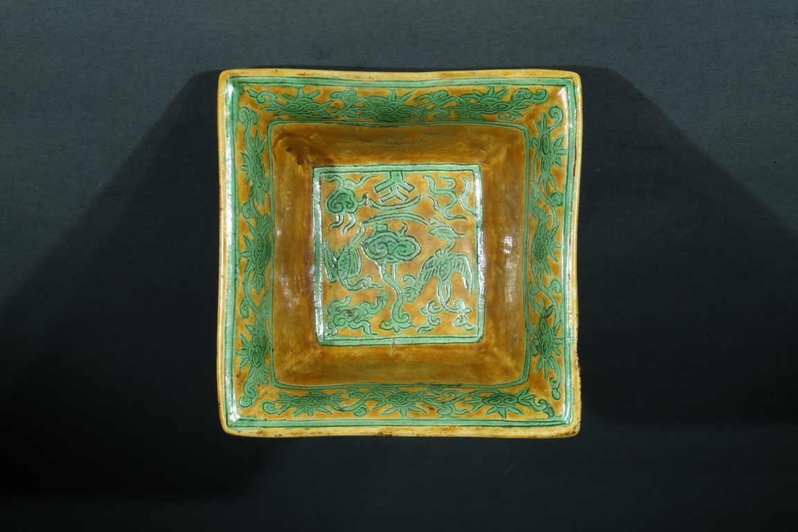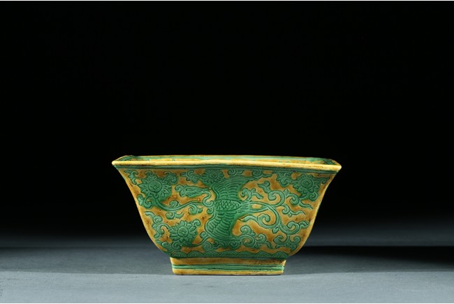 Well-potted and of square section, the exterior with green-enameled and incised with alternating panels of flying phoenix amidst clouds and flowers, the interior base with lingzhi sprig flanked by a phoenix and crane, the rim with a wide band of incised floral scrolling, all decorated in green enamel on a yellow ground, the base with a six-character Jiajing mark. Ming Dynasty period.