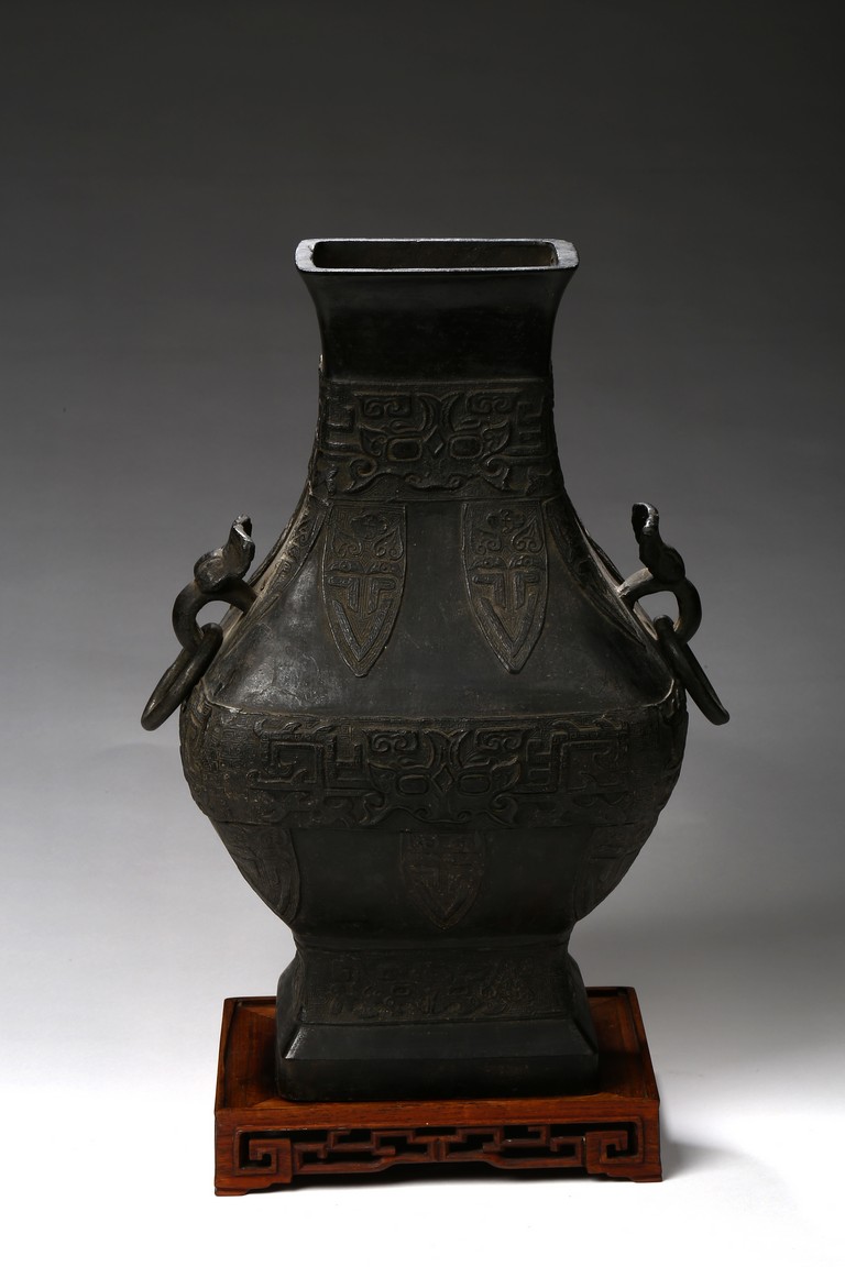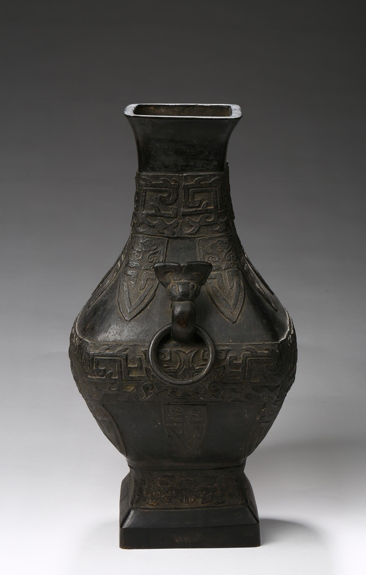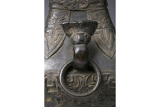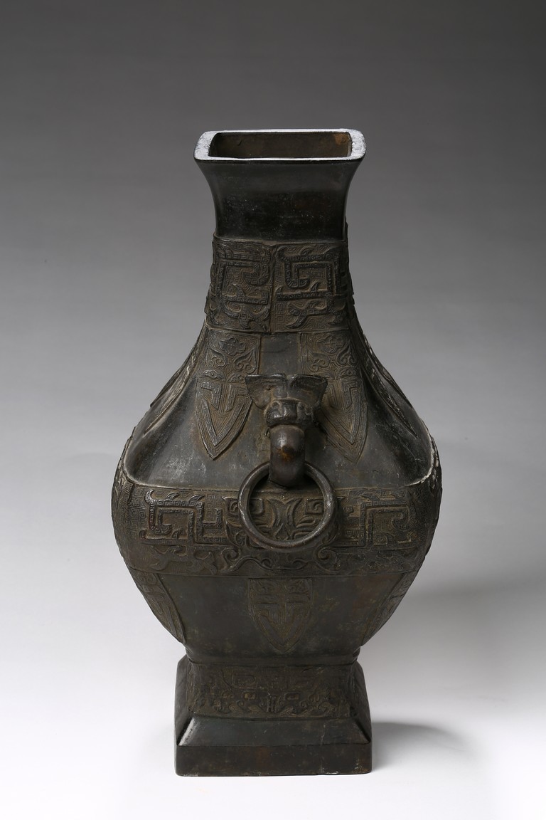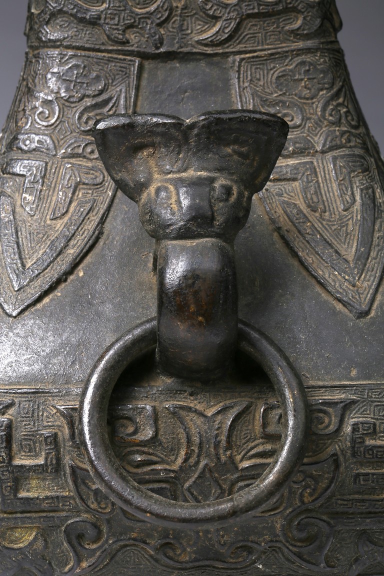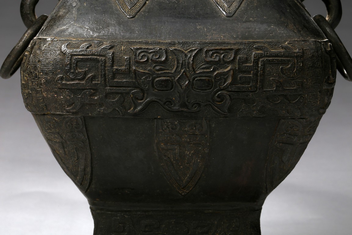 Of similar pear shape with a wide rectangular mouth, supported on a square splayed foot, cast with bands of archaistic taotie mask motif, confronted leiwen pattern entwined beaste masks and scrolls, the shoulders set with opposing taotie mask loop handles suspending loose rings. Ming Dynasty period.