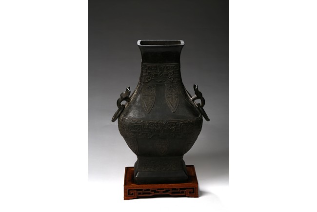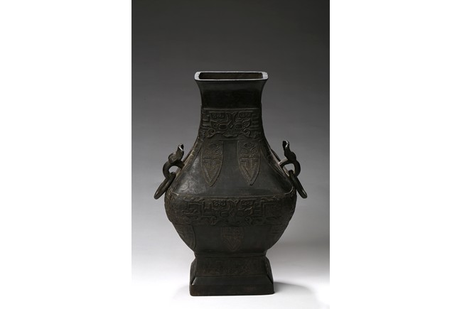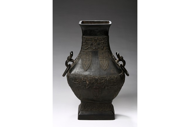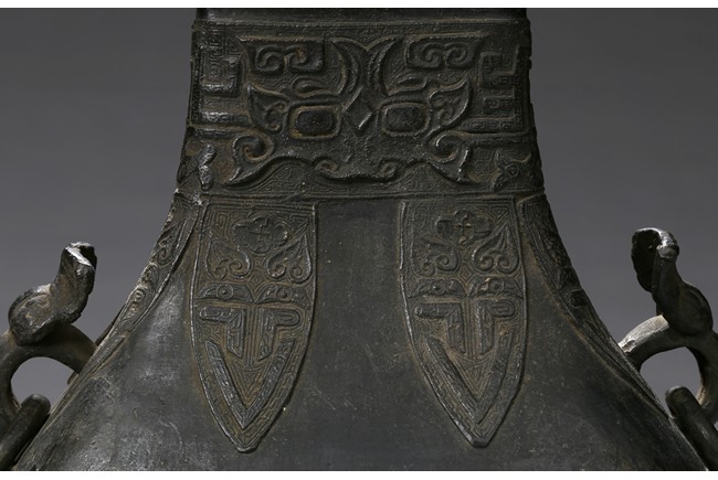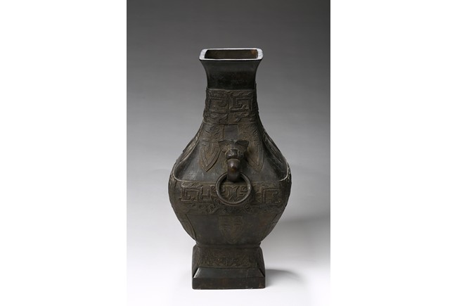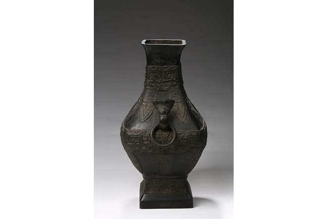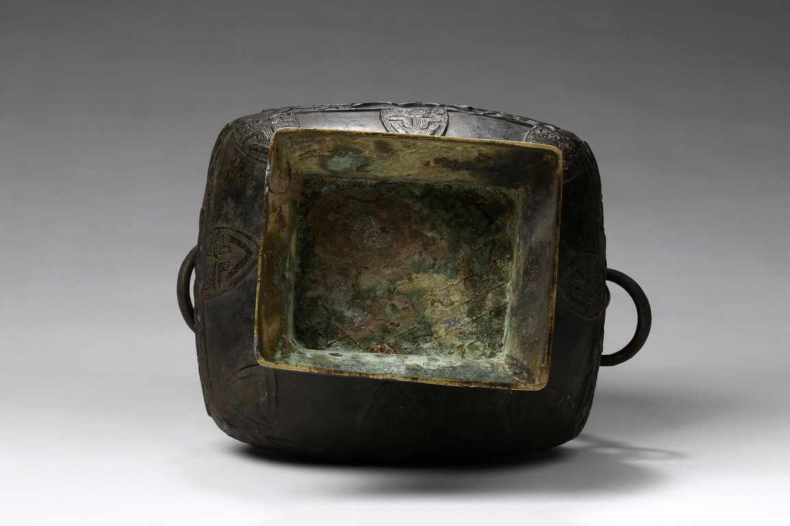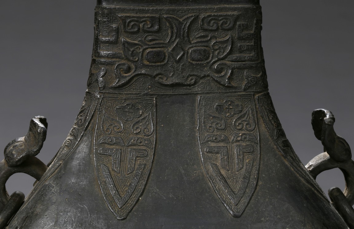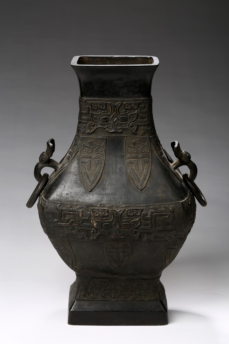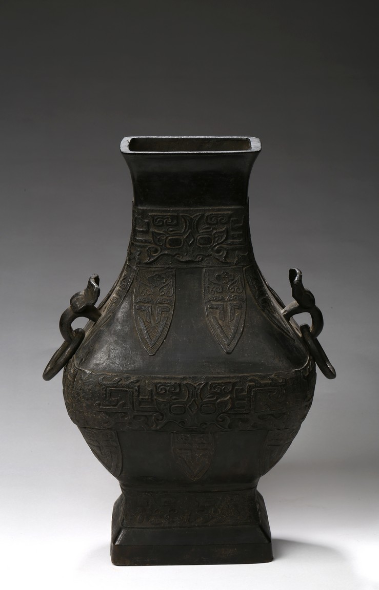 Of similar pear shape with a wide rectangular mouth, supported on a square splayed foot, cast with bands of archaistic taotie mask motif, confronted leiwen pattern entwined beaste masks and scrolls, the shoulders set with opposing taotie mask loop handles suspending loose rings. Ming Dynasty period.