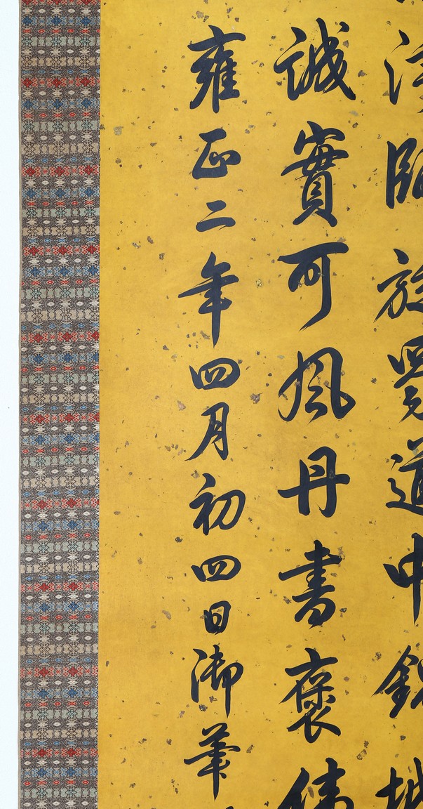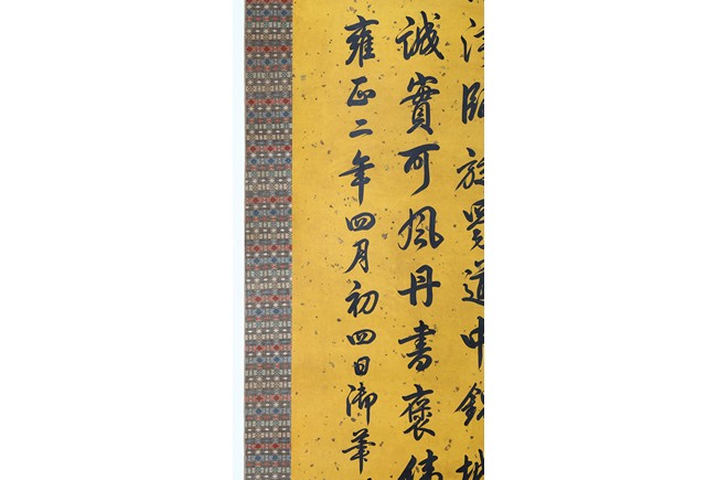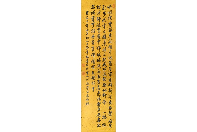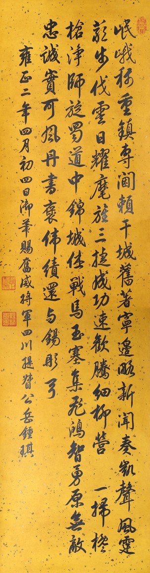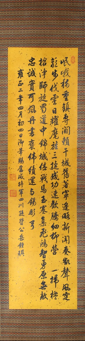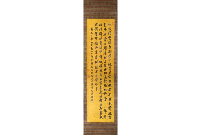 Ink on paper. Running script calligraphy. Hanging scrolling. Signed and with three seals of the artist.
