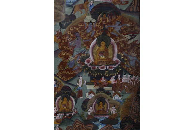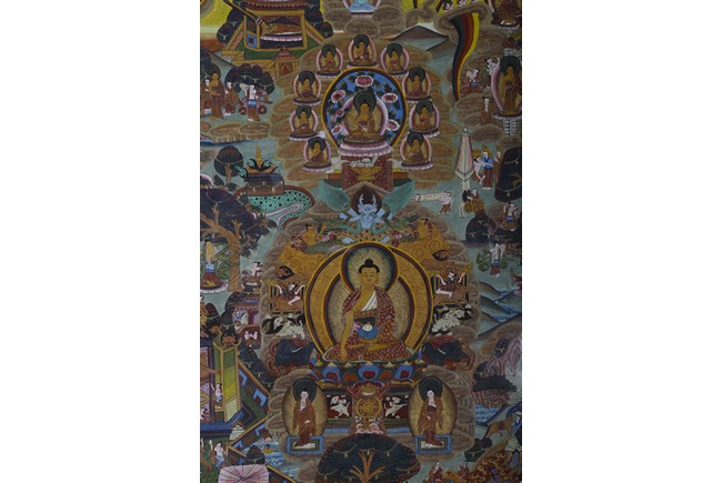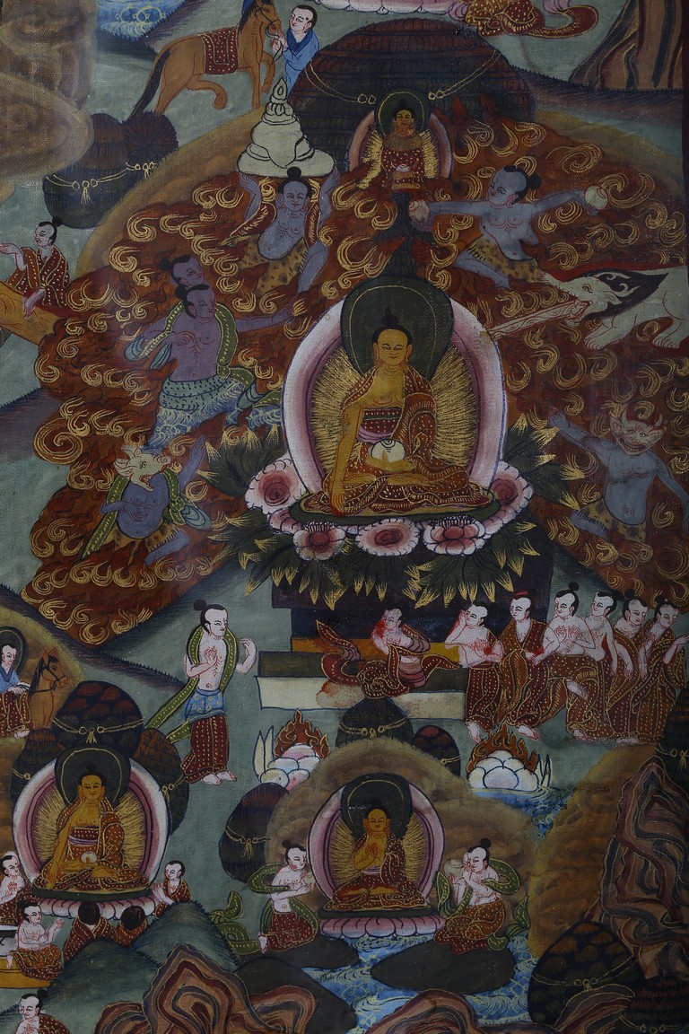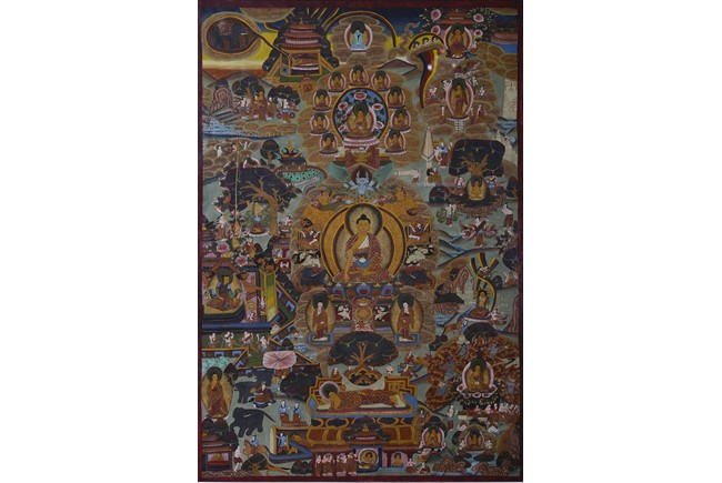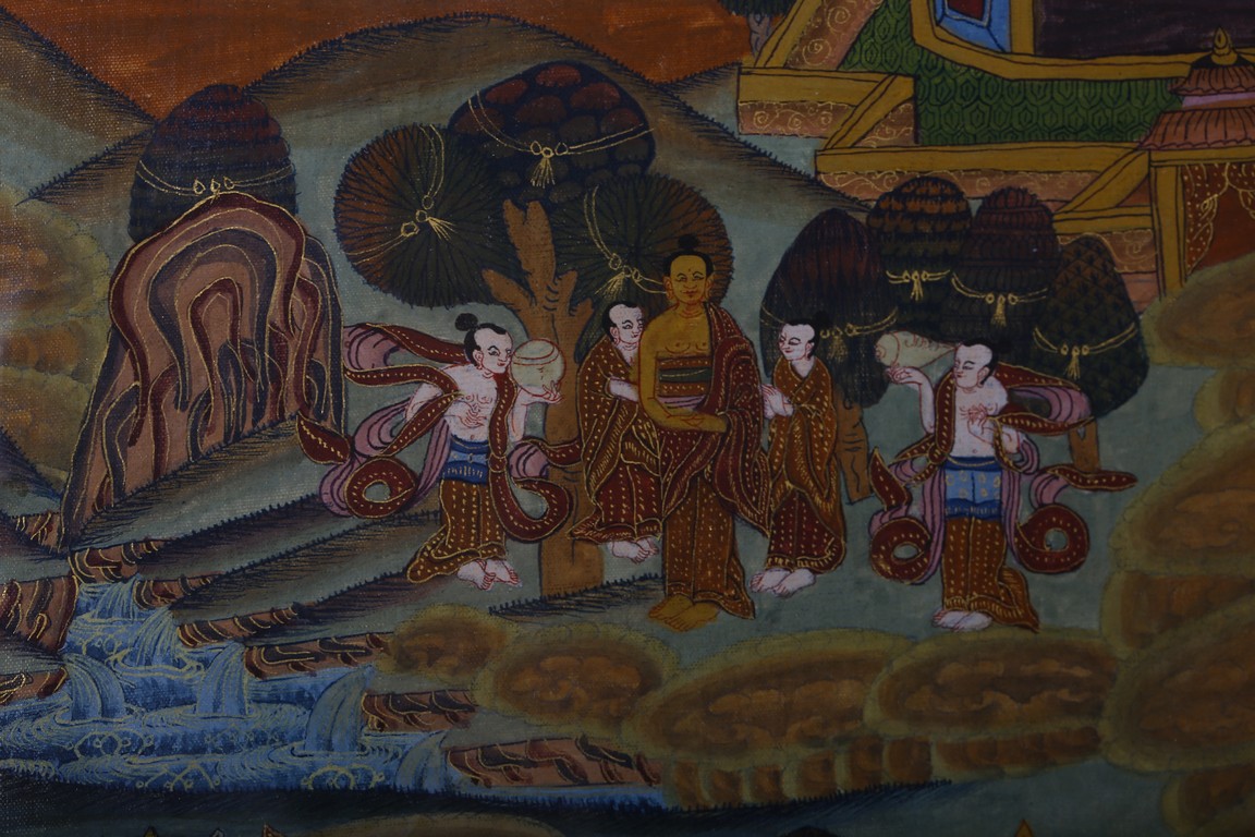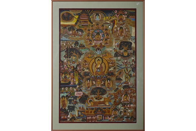 Framed. Elaborately painted with the scene of shakyamuni and various deities and guardians around him.