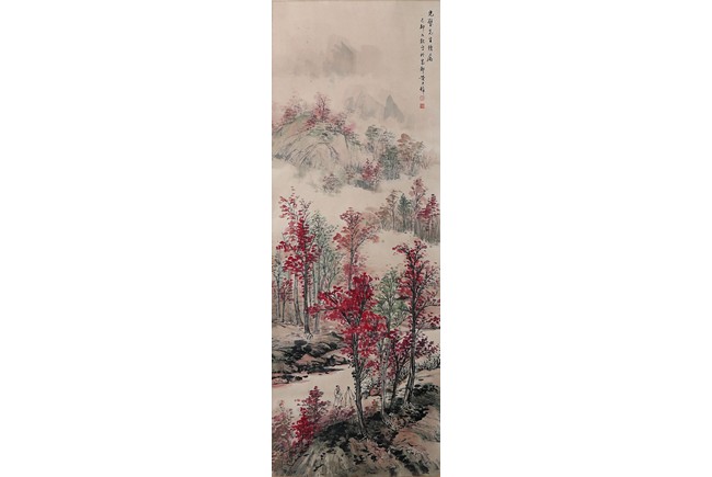 Color and ink on paper. Hanging scrolling. Mountain landscape. Inscribed, signed Huang Junbi with two seals of the artist.