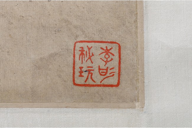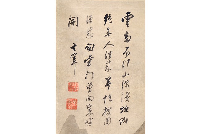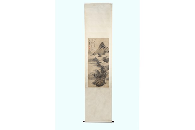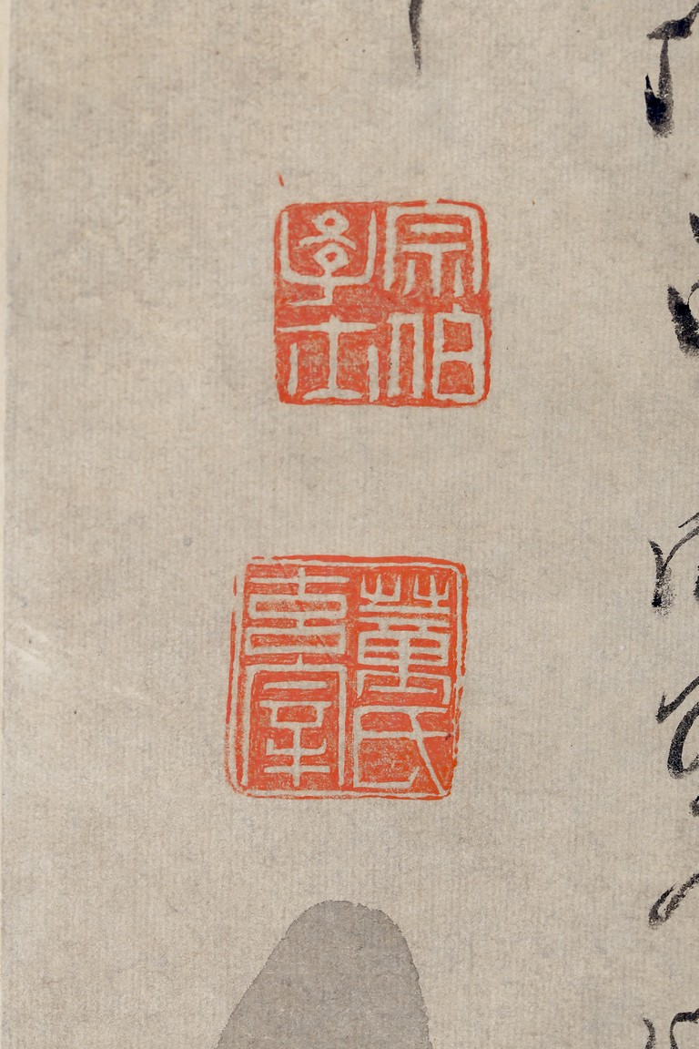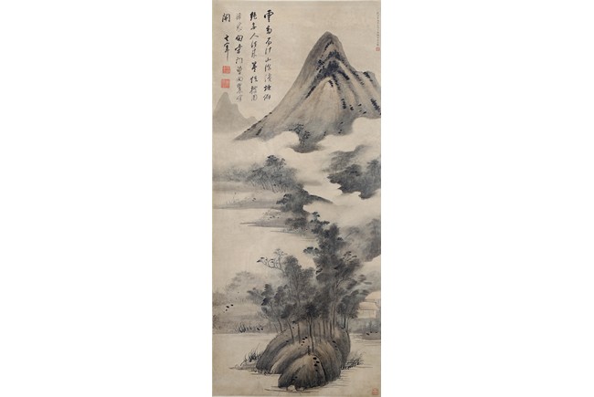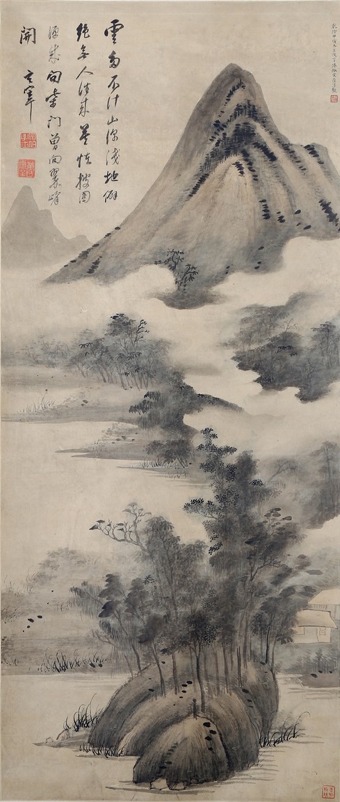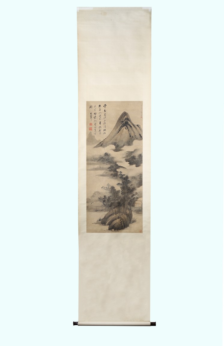 Ink and color on paper. Landscape. Hanging scrolling. Signed Dong Qichang and with three seals of the artist and one seal of collector.