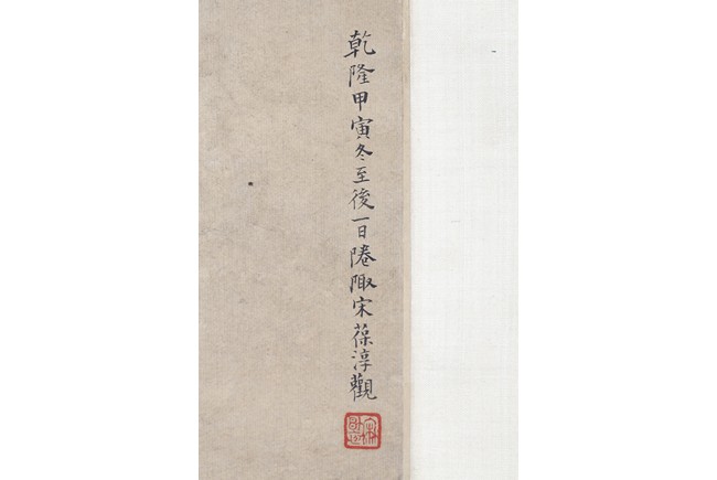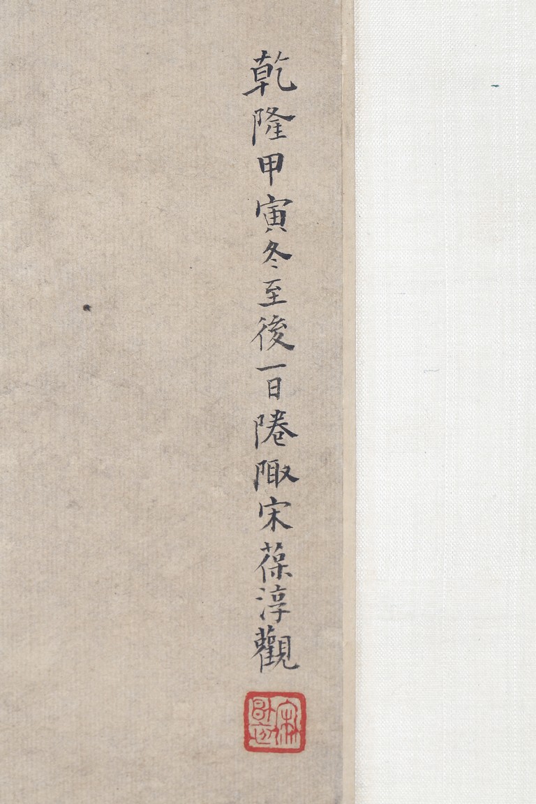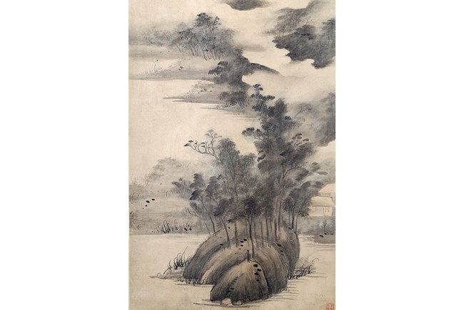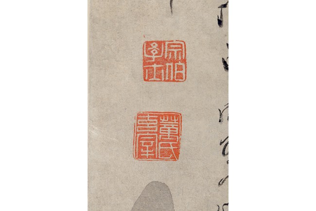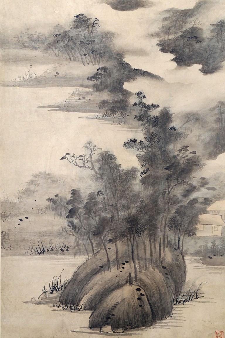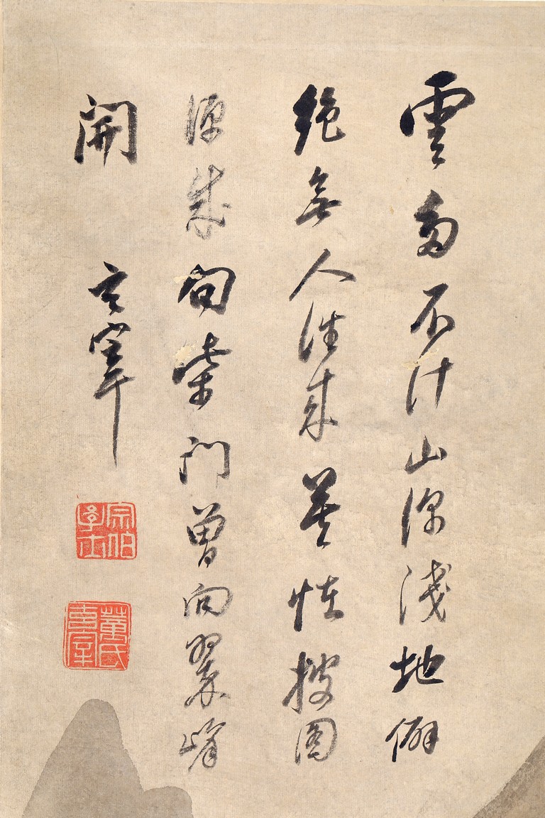 Ink and color on paper. Landscape. Hanging scrolling. Signed Dong Qichang and with three seals of the artist and one seal of collector.