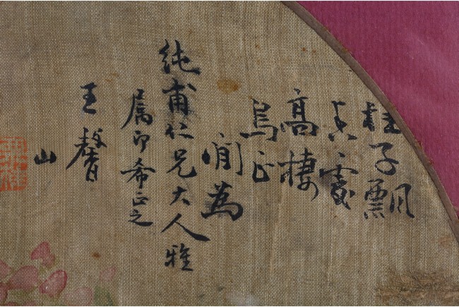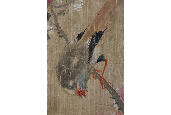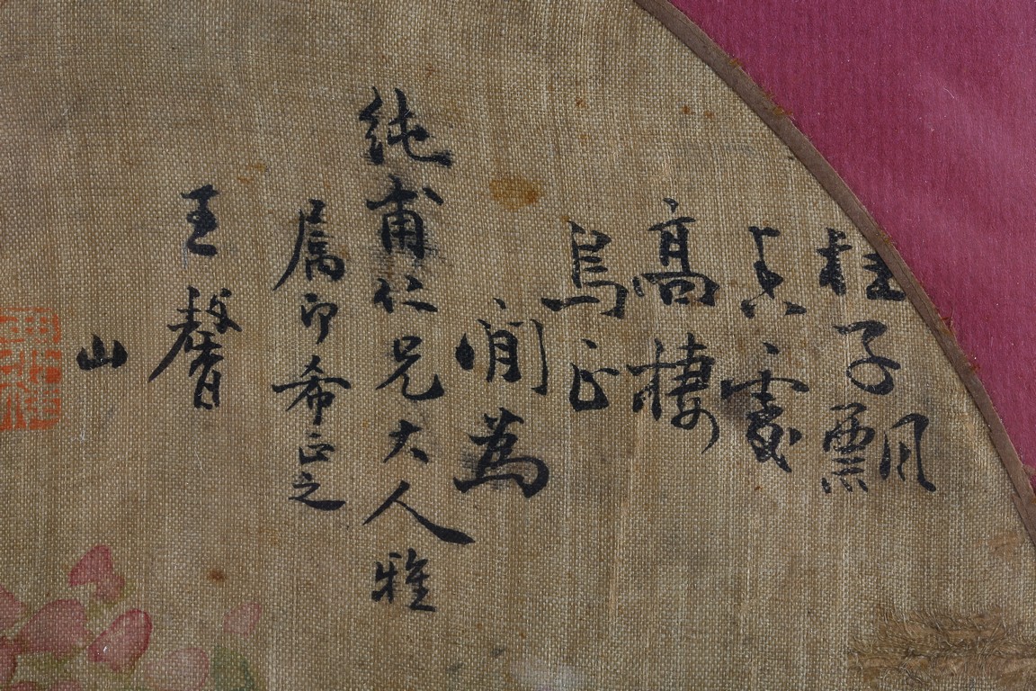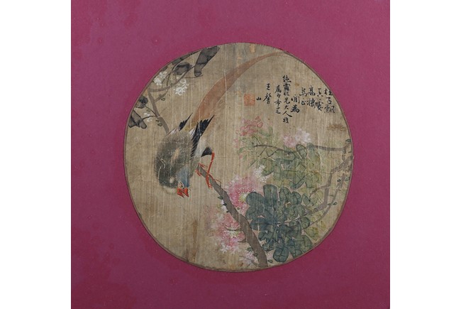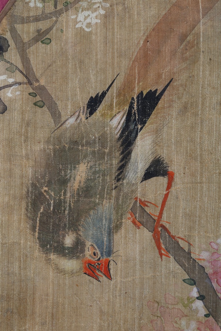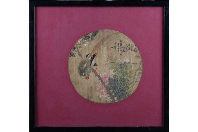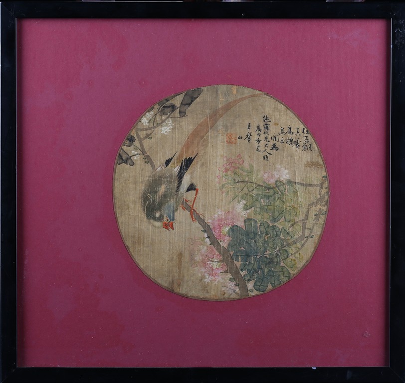 A COLOR AND INK ON SILK 'BIRD AND FLOWER' PAINTING 王聲 花鳥 扇面 鏡心