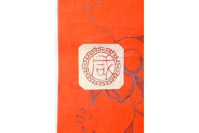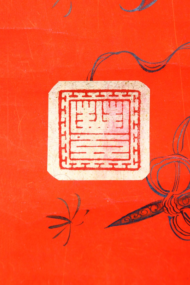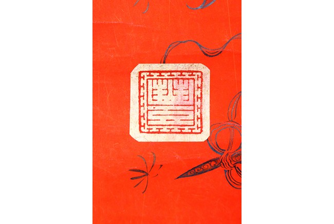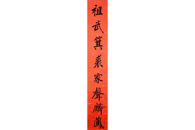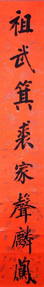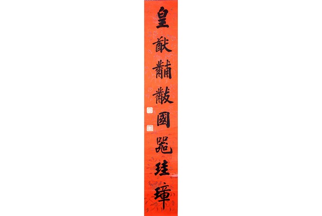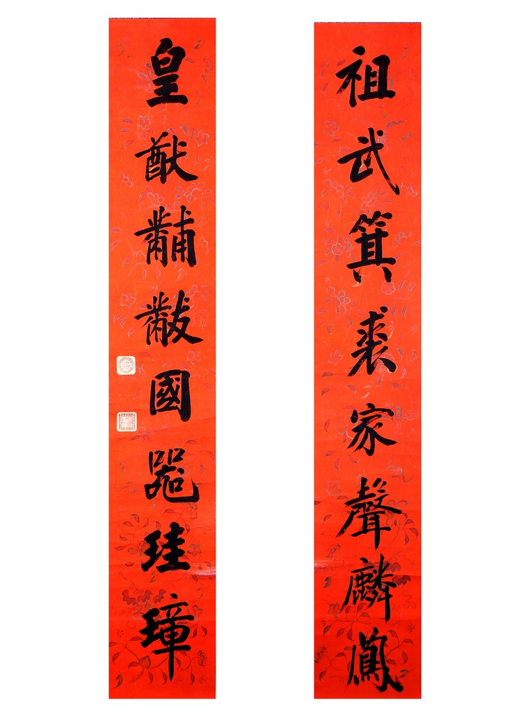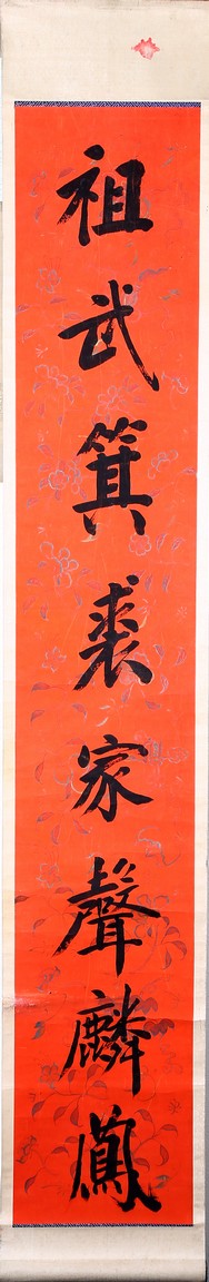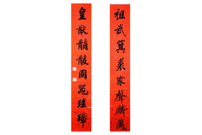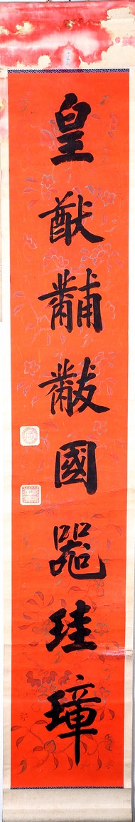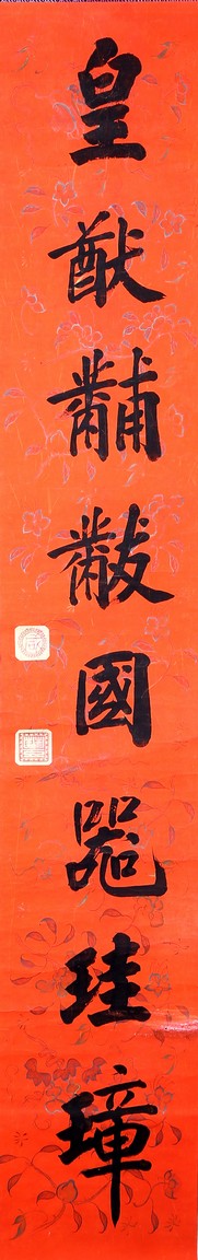 Ink on decorated paper. Regular script eight character couplet. Hanging scrolling. With two seals of the emperor Xianfeng.