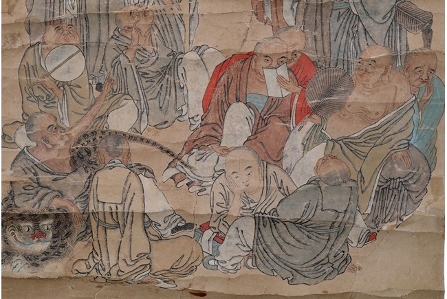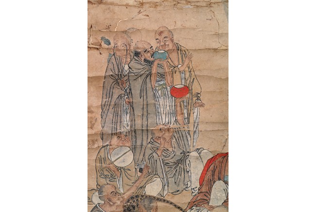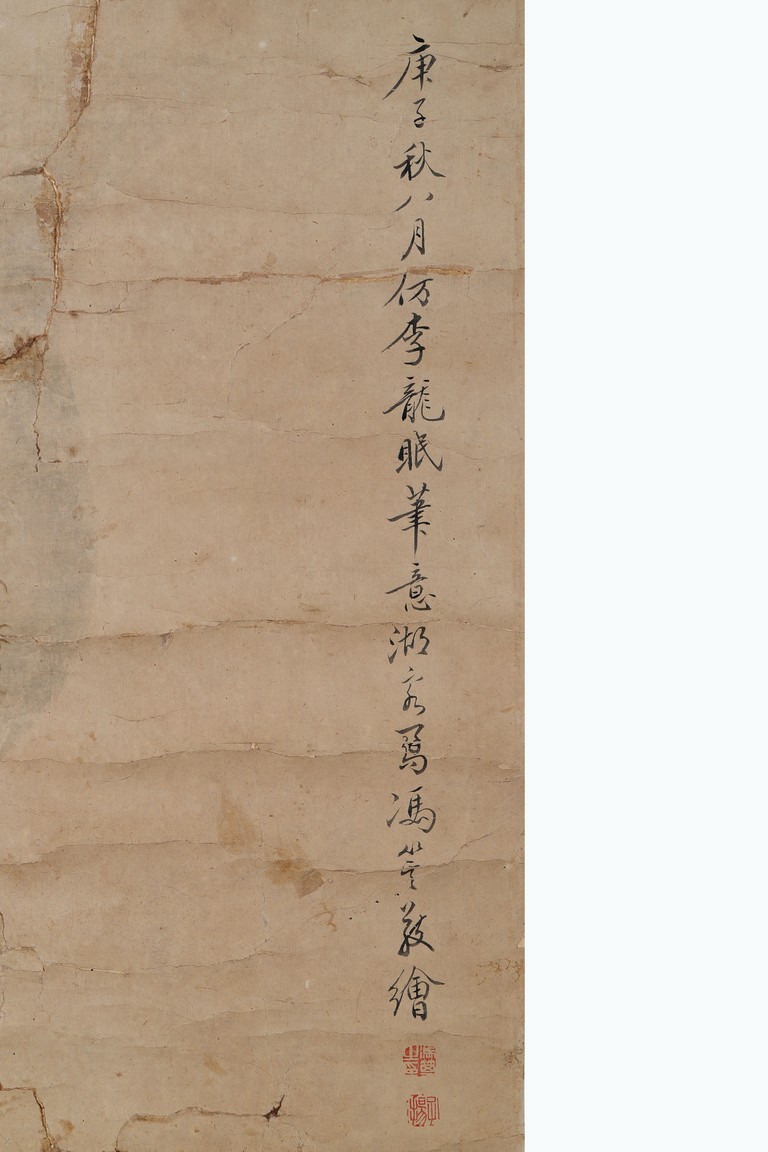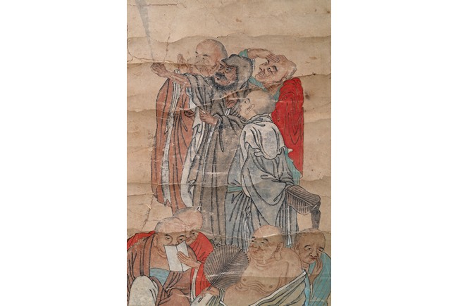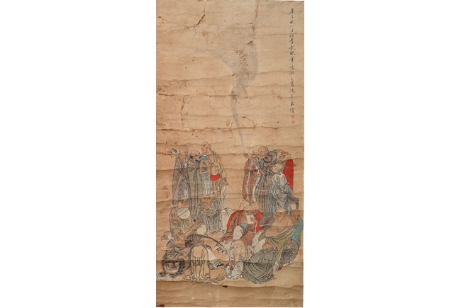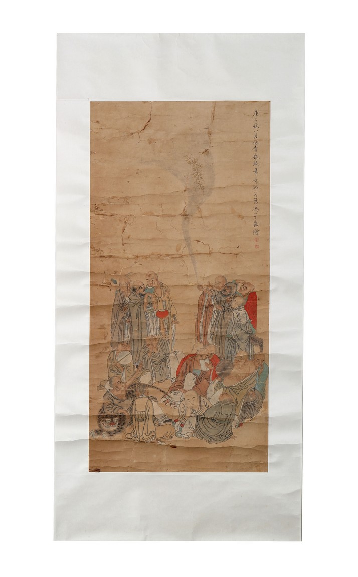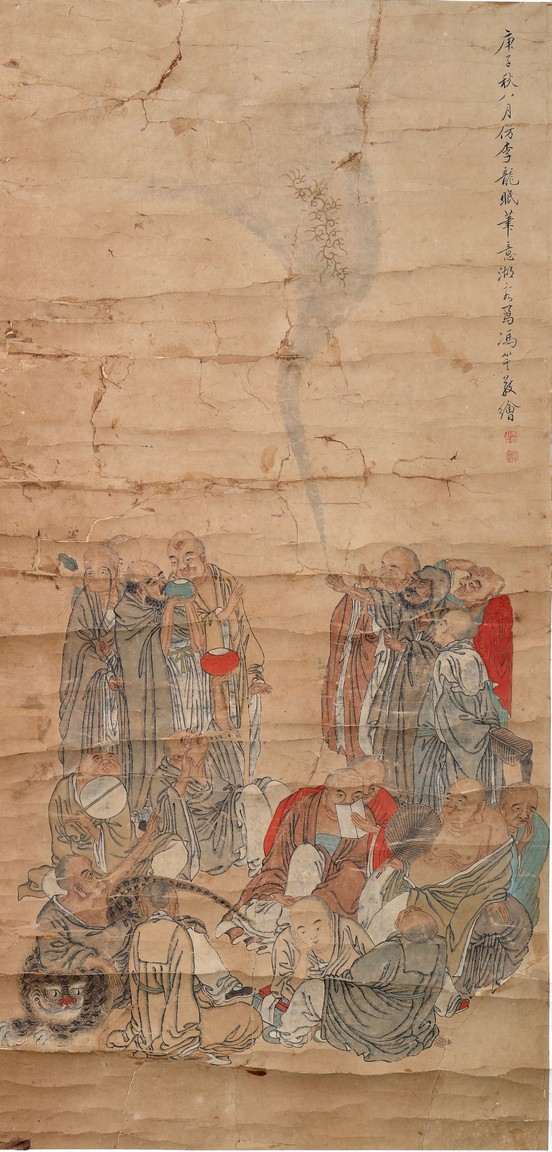 Color and ink on paper. Hanging scrolling. 'Eighteen luohan' Inscribed and signed 'Feng Qi', with two seals of the artist. Dated to 1840 autumn.