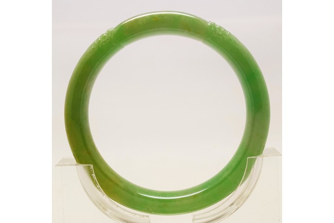 This hand carved translucent jadeite jade bangle features two dragon heads symbolize blessing from heaven and good luck, in bright green coloration with yellow patches. An unique and rare collection. The bangle has been recently tested at Hong Kong Jade & Stone Lab to confirm it’s a 100% natural untreated type A Jadeite jade without any resin (test certificate accompanied). Qing Dynasty period.