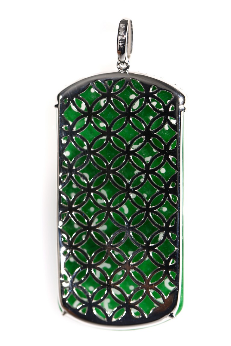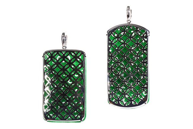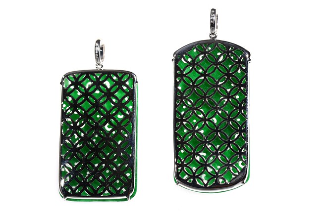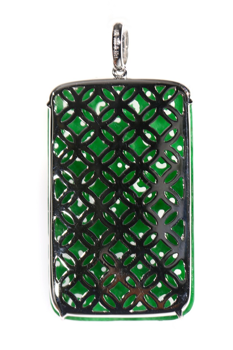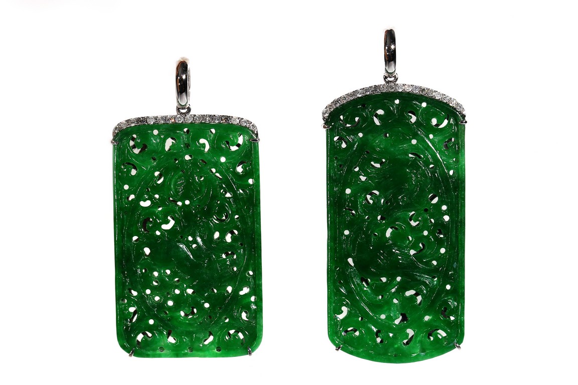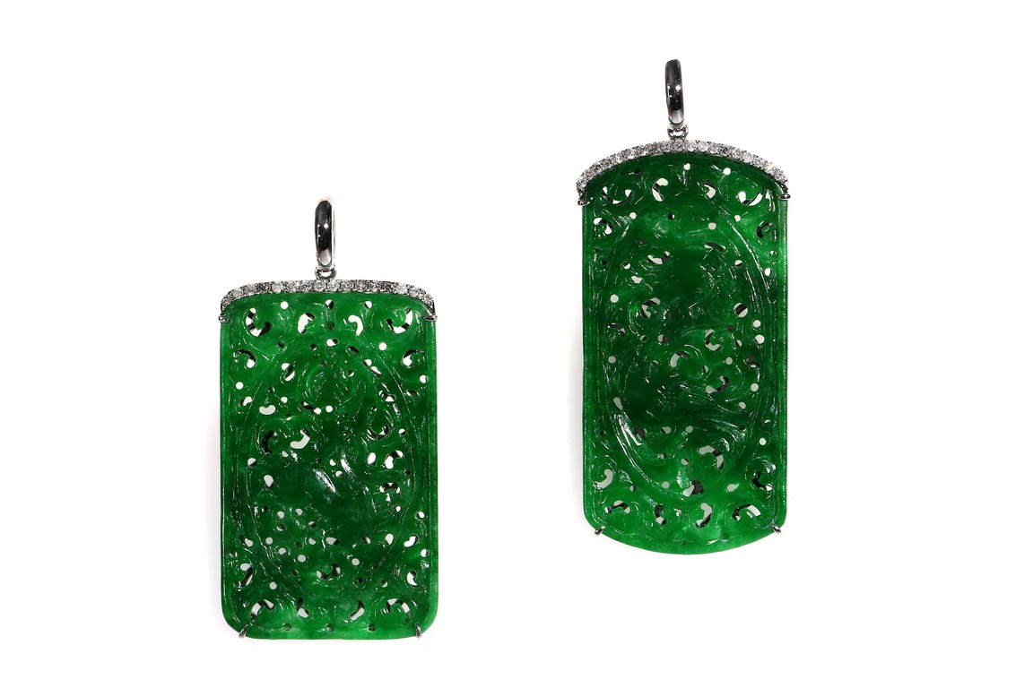 Each suspending a highly translucent green jadeite of similar flattened rectangular plaque form, enhanced by diamond-set frame on front top part, to the reverse fitted with reticulated rounded silver pattern.