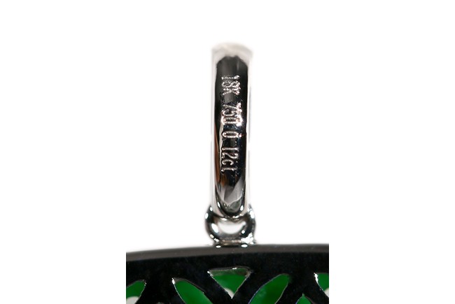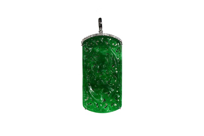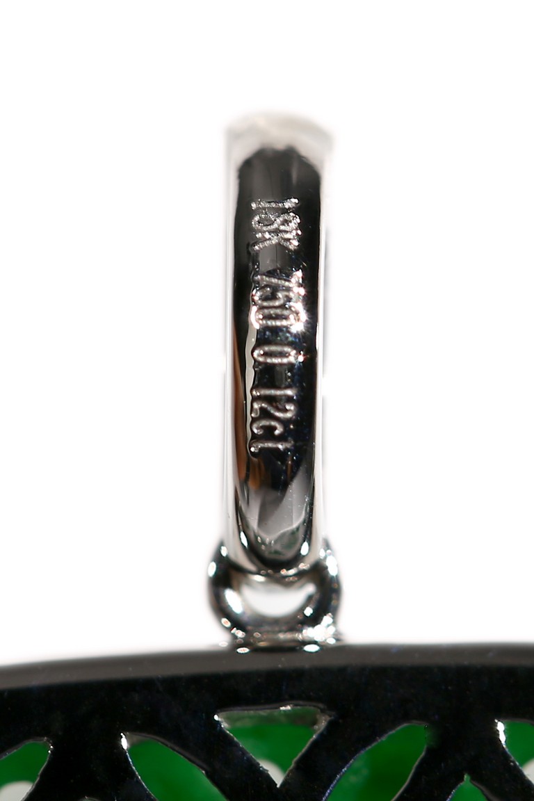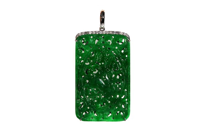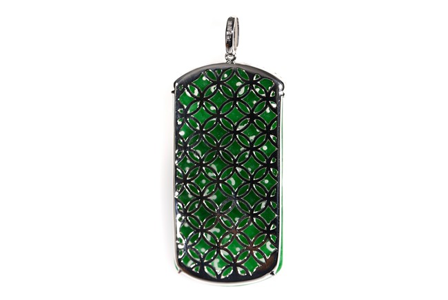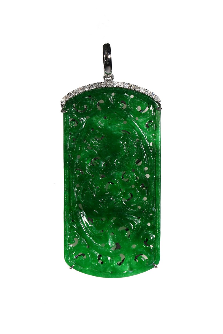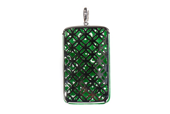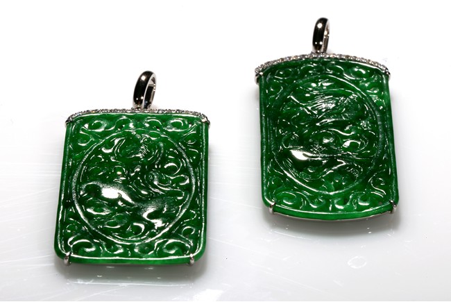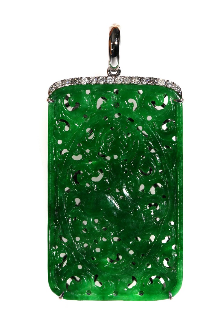 Each suspending a highly translucent green jadeite of similar flattened rectangular plaque form, enhanced by diamond-set frame on front top part, to the reverse fitted with reticulated rounded silver pattern.