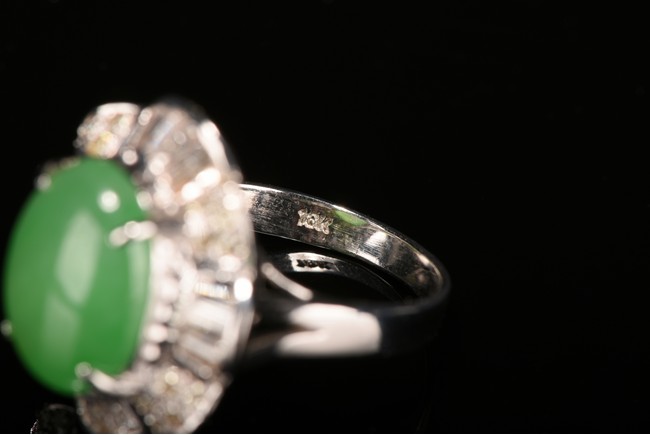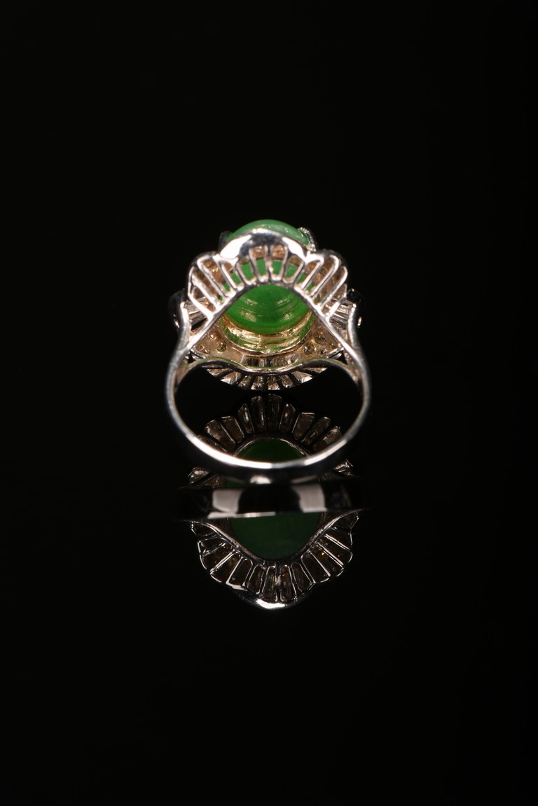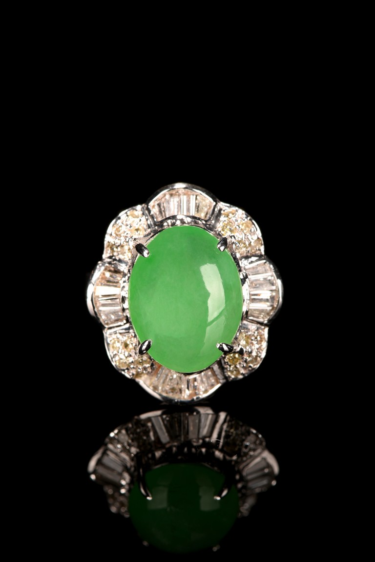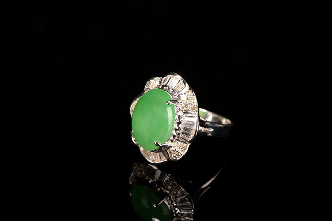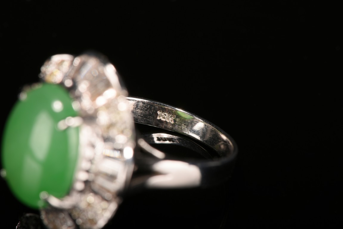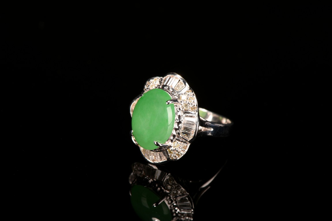 The center of the ring is a beautiful bright apple green natural jadeite jade cabochon approximately 12.74 mm x 9.84 mm around it is paved by micro diamond fitted in the eight petals shaped silver borders. Accompanied by a certificate from American International Gemological Laboratories indicating natural jadeite and natural diamond .This one is for woman.