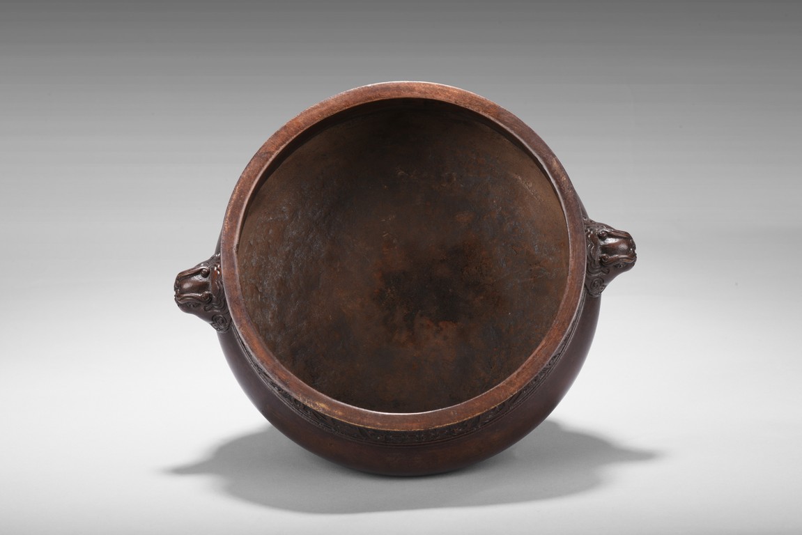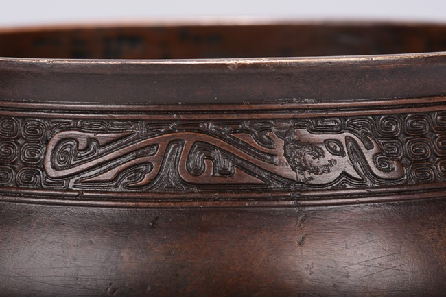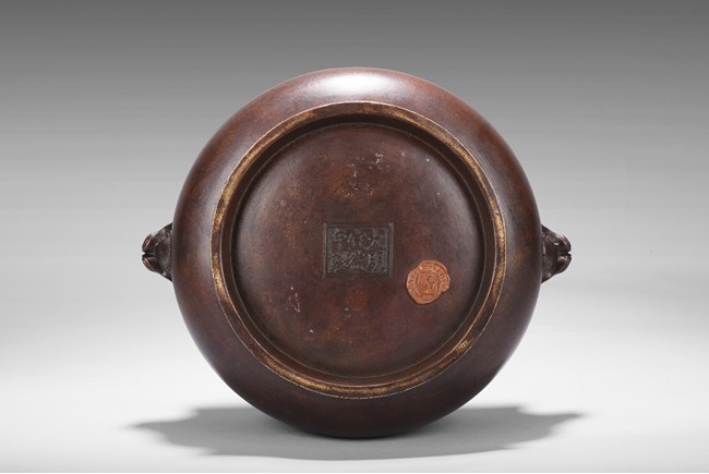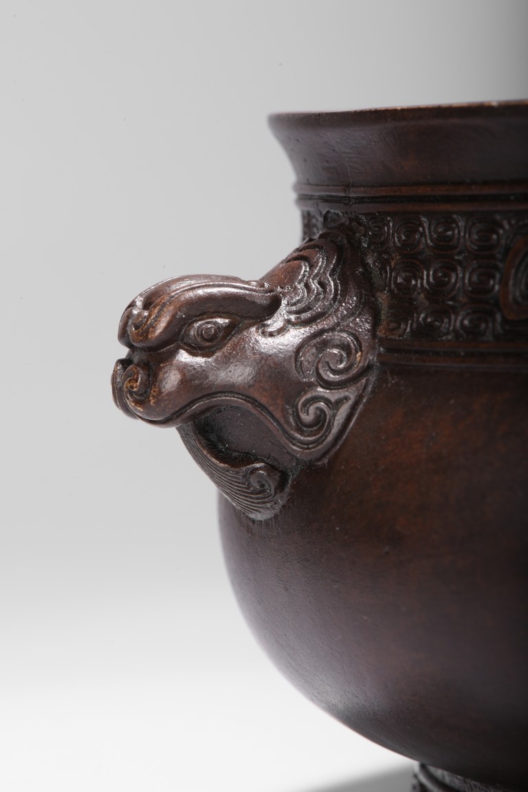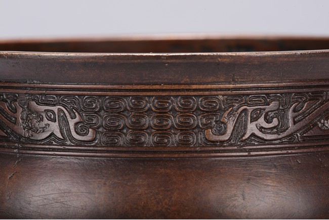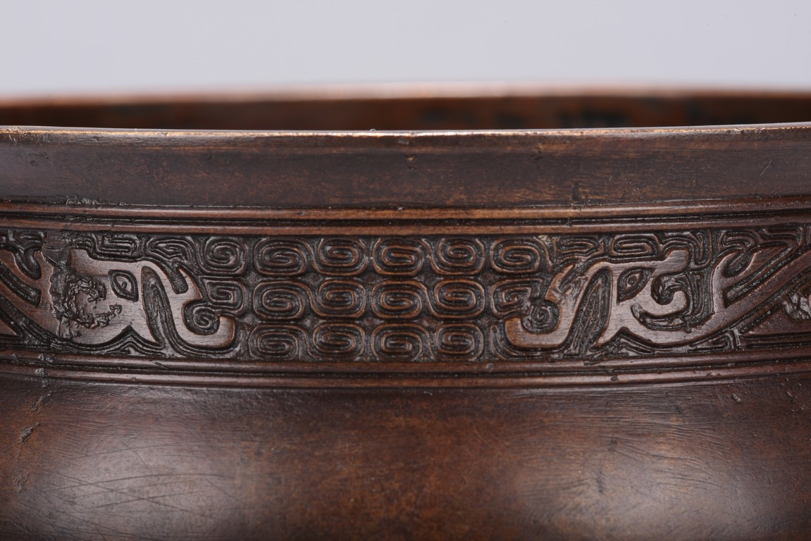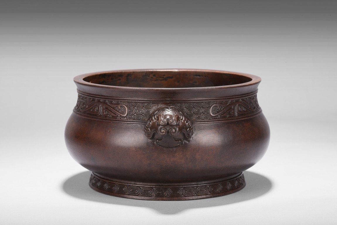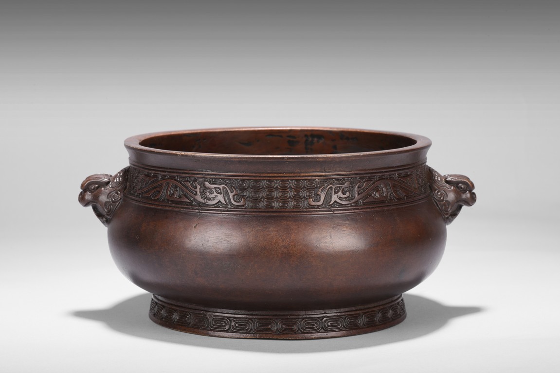 Finely cast, the body rising from a spreading foot to a flared rim, flanked by a pair of mythical beast mask handles, the neck encircled by a band with a pair of confronting chilong reserved on a leiwen ground, the foot with a stylized key fret border, the base impressed with a six character 'XUANDE' mark. Qing Dynasty period.