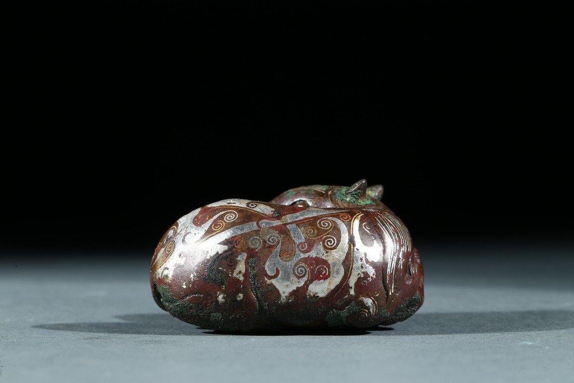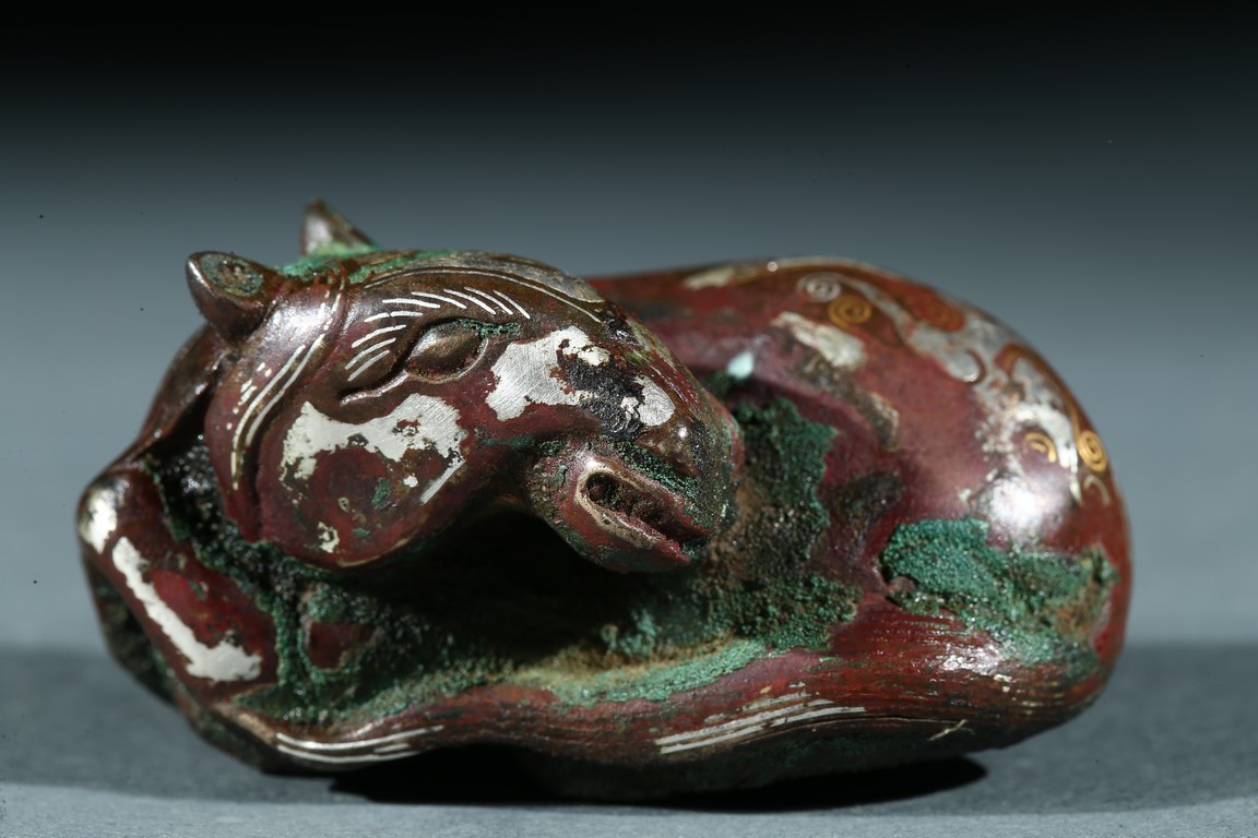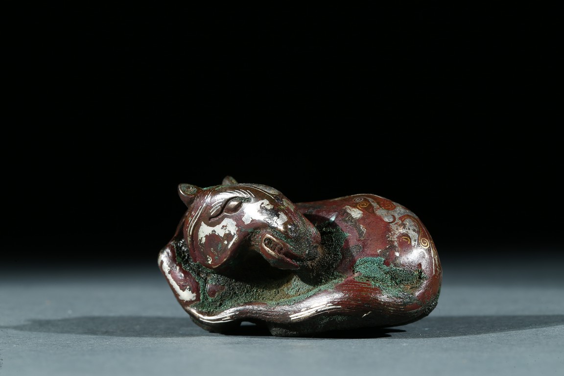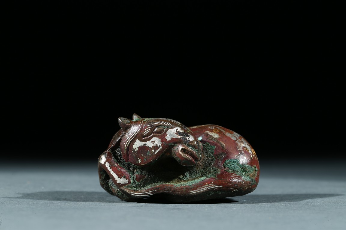Naturalistically cast the recumbent horse with its head turned towards its tail, detailed with alert eyes of almond shape and well-groomed mane, the elegant body finely inlaid in gold and silver with stylized pattern, the metal of dark red tone with slightly green patina encrustation. Han Dynasty period.