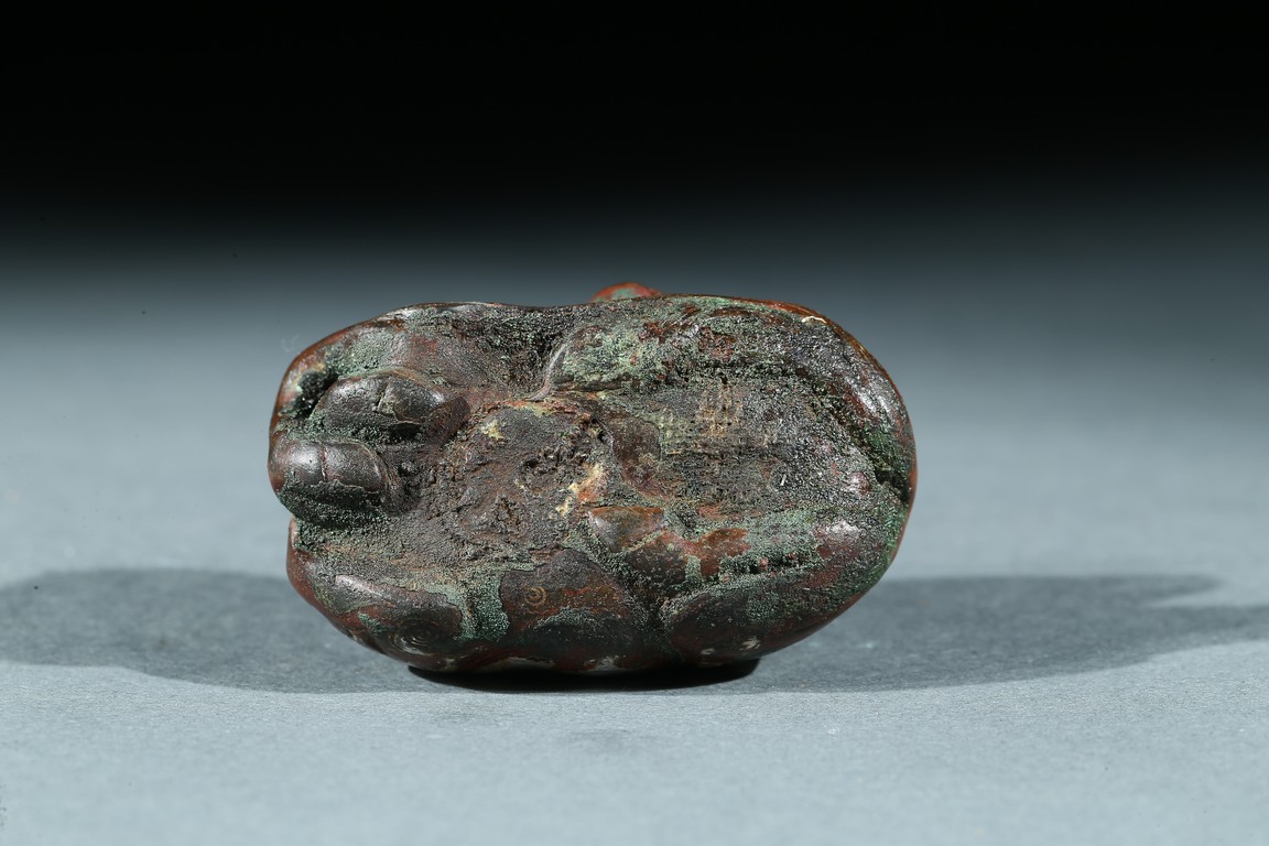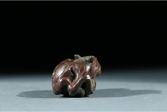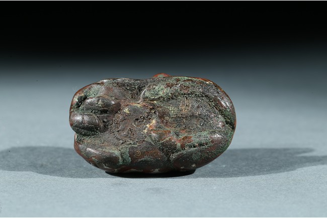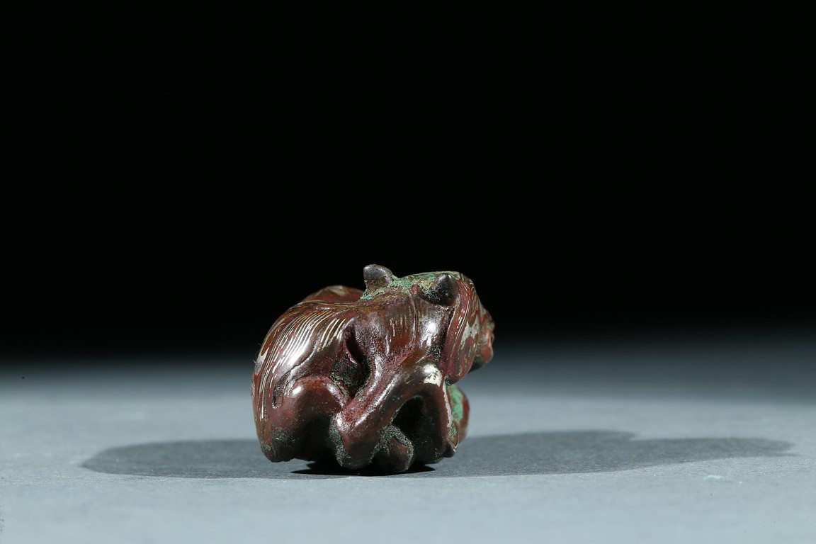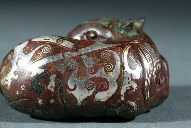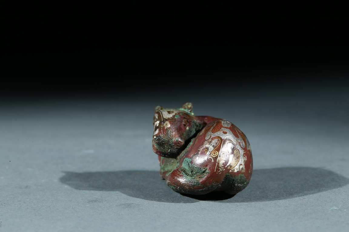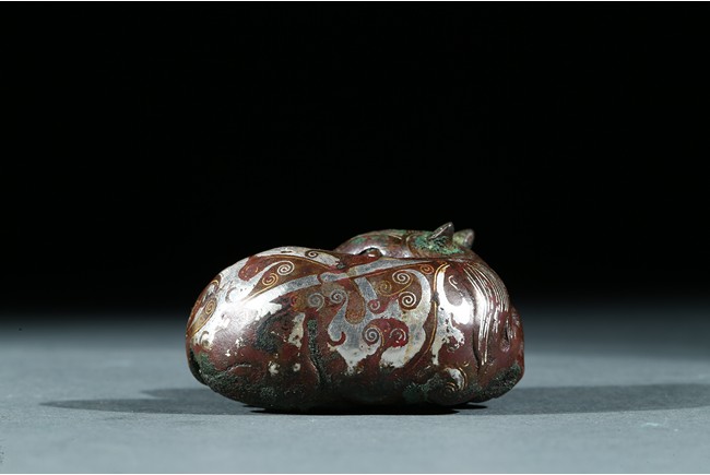 Naturalistically cast the recumbent horse with its head turned towards its tail, detailed with alert eyes of almond shape and well-groomed mane, the elegant body finely inlaid in gold and silver with stylized pattern, the metal of dark red tone with slightly green patina encrustation. Han Dynasty period.