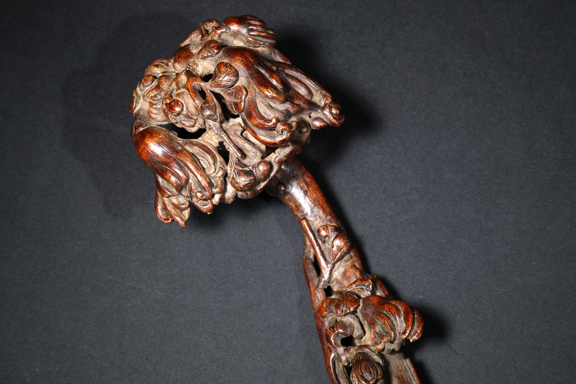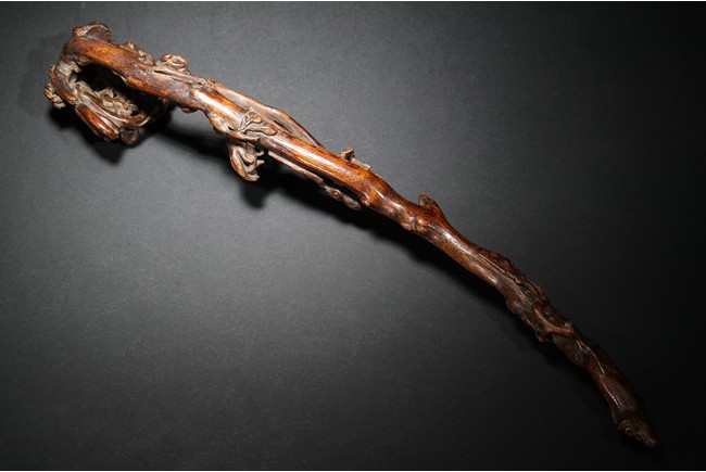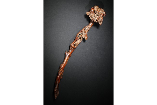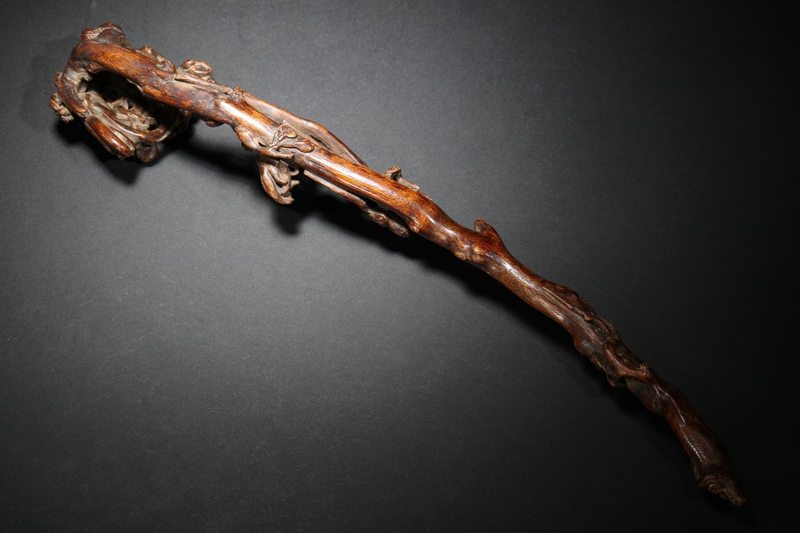 Naturalistically carved in high relief to depict a gnarled wood branch as shaft, the ruyi head carved in the form of leafy fingered citron clusters. The agarwood is of high oily texture with characteristic aroma. Qing Dynasty period.