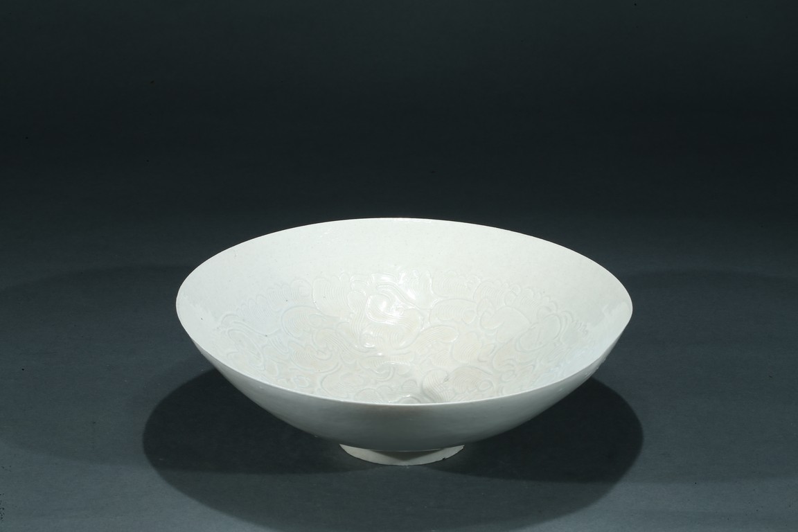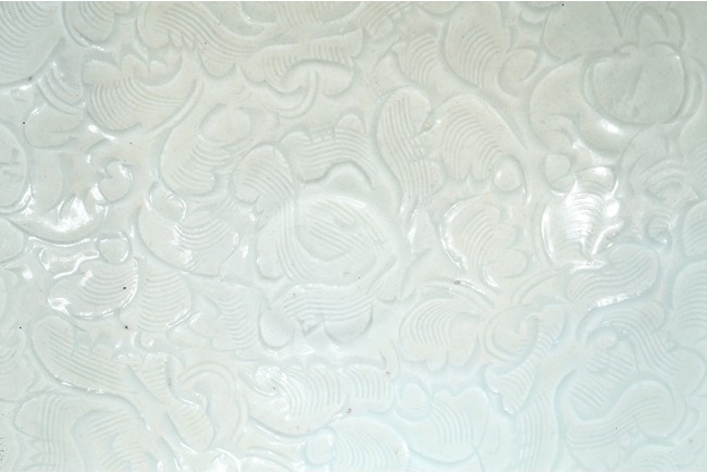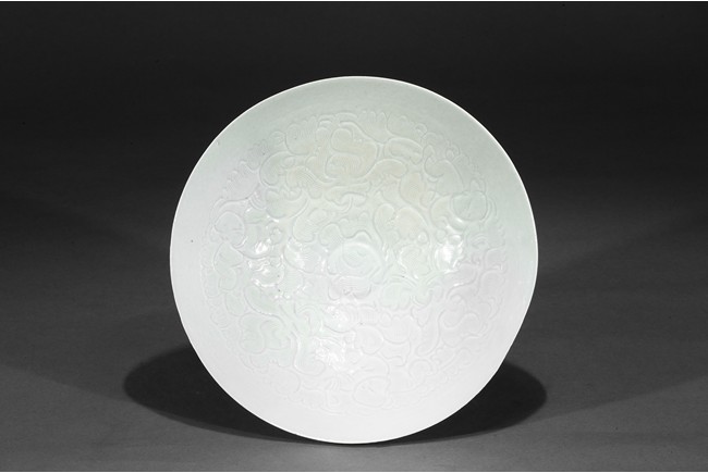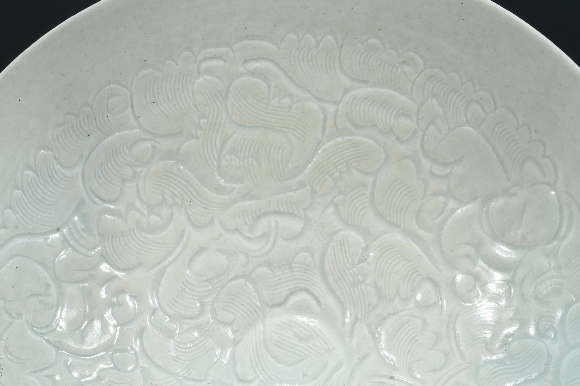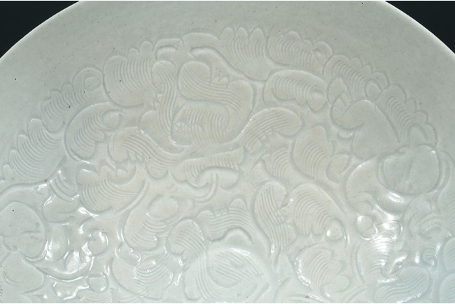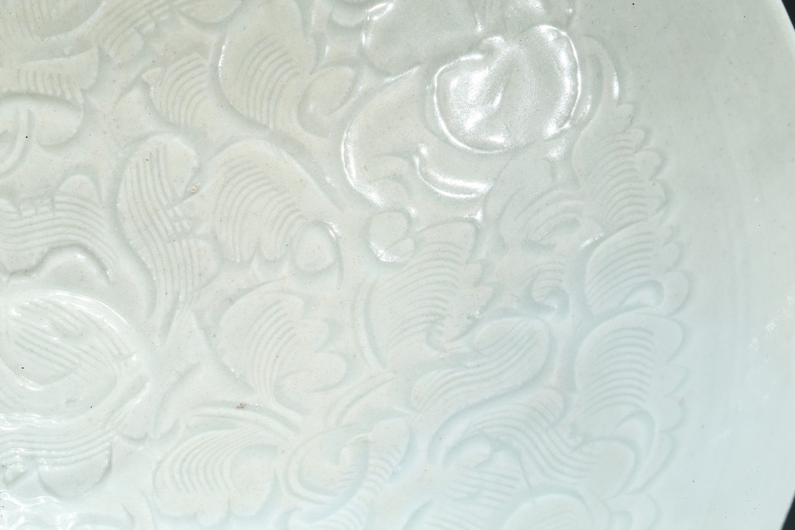 Of rounded sides rising from circular foot, the interior carved with dense peony scrolls, overall covered with a pale blue-green glaze. Yuan Dynasty period.