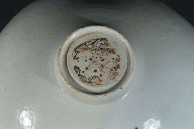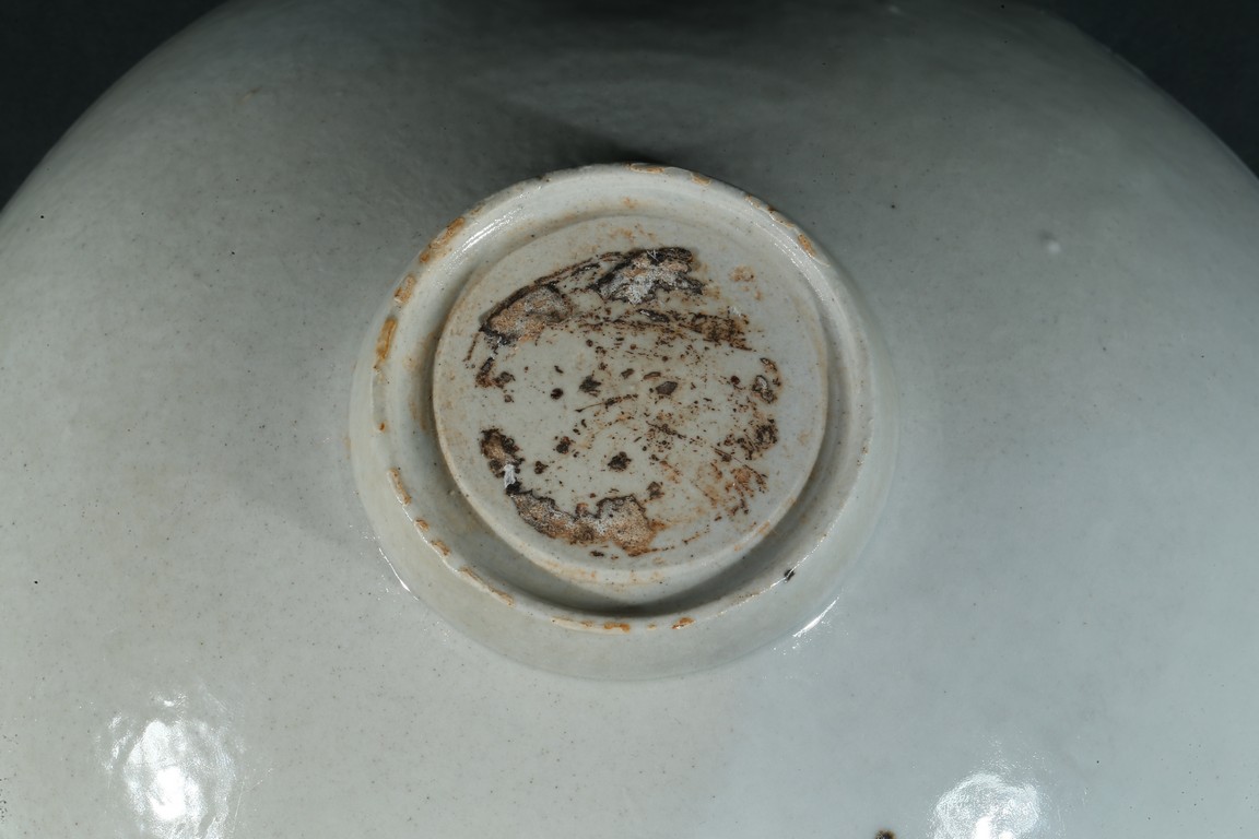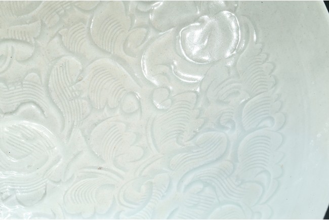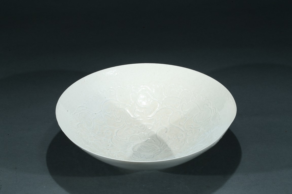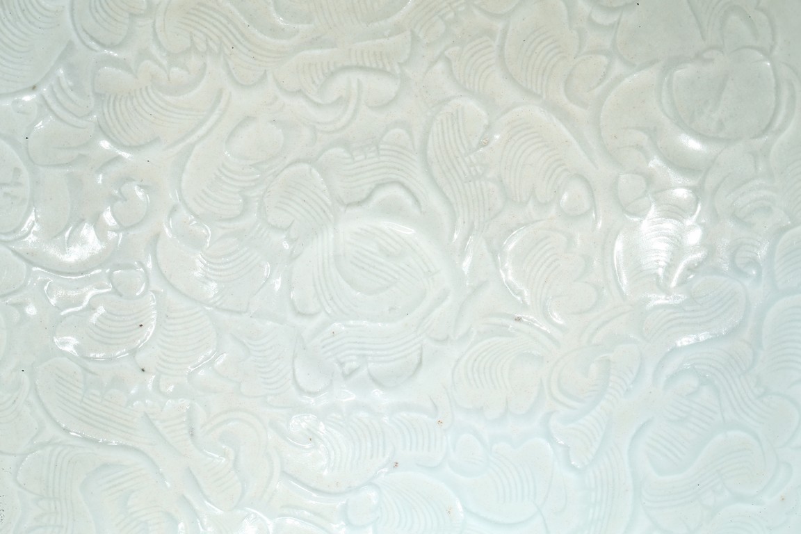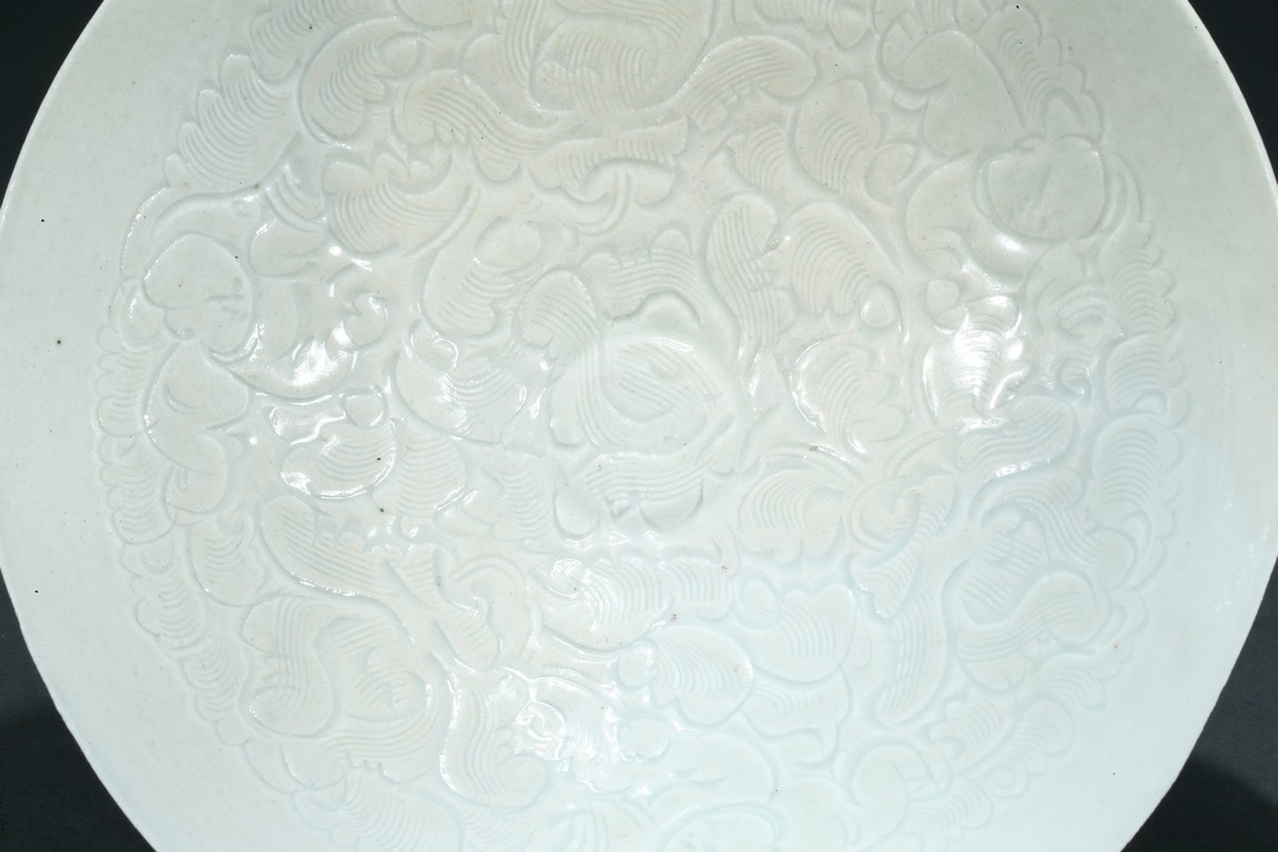 Of rounded sides rising from circular foot, the interior carved with dense peony scrolls, overall covered with a pale blue-green glaze. Yuan Dynasty period.