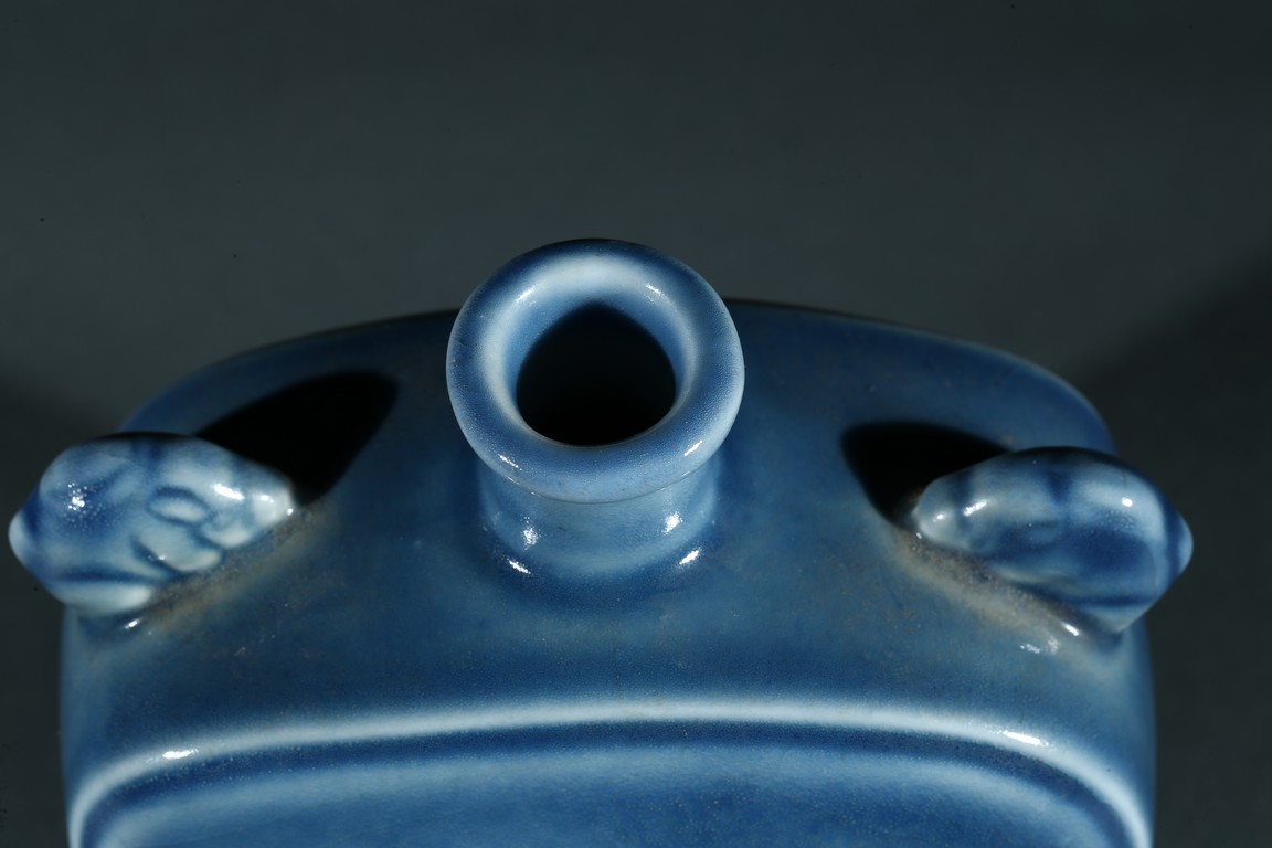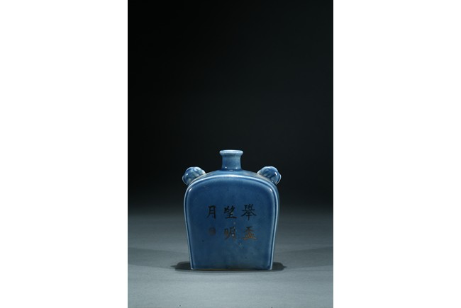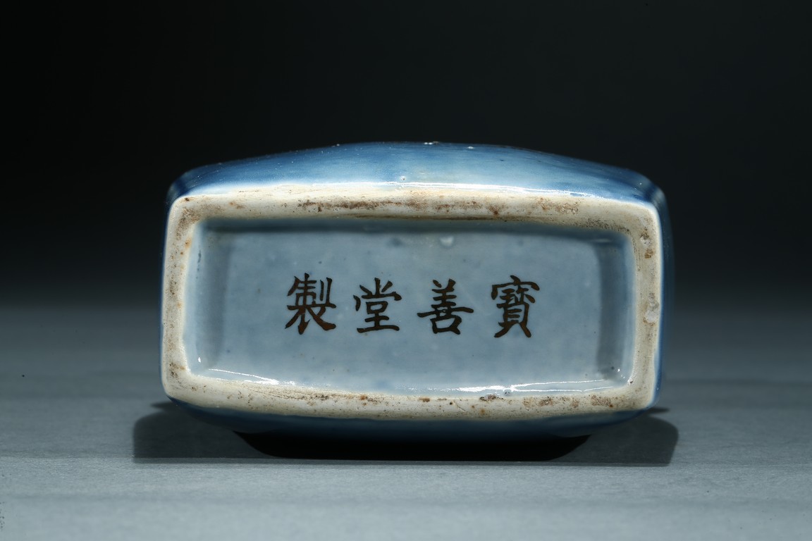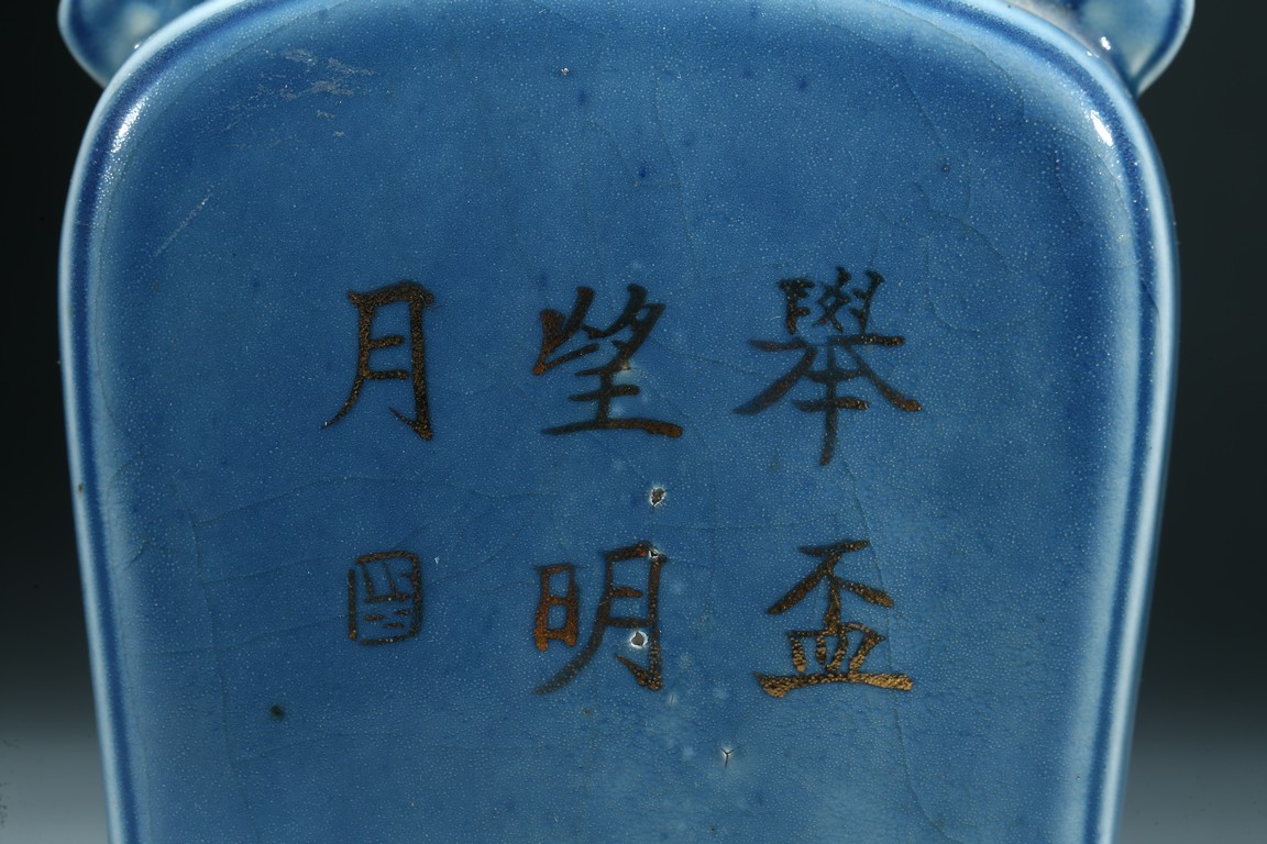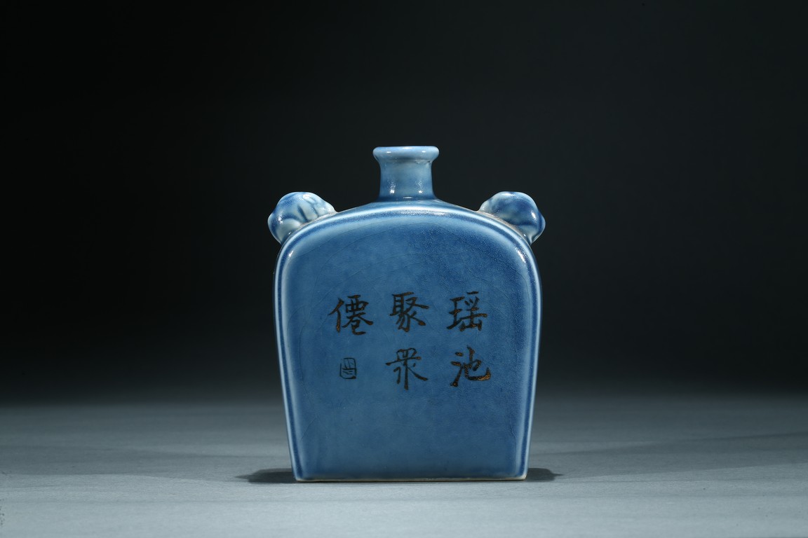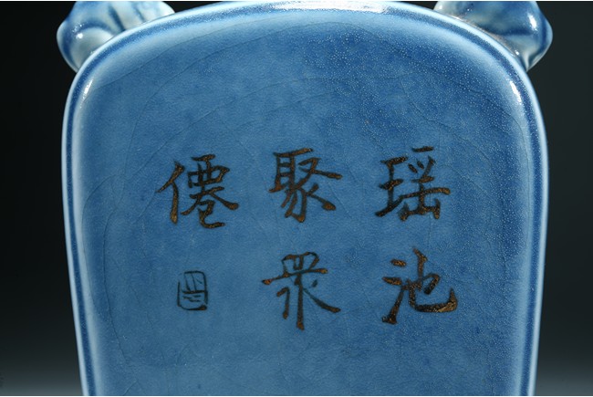Of flattened rounded rectangular form, with a small cylindrical neck rising to a slightly everted rim, on the curving shoulder surmounted by a pair of prostrated rabbits, the front and reverse body with poem inscription in gilt, the base with a mark of 'Bao Shan Tang Zhi'. Late Qing Dynasty period.
