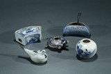 A SET OF FIVE BLUE AND WHITE CERAMIC OBJECTS