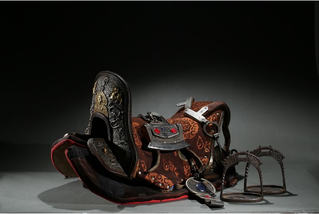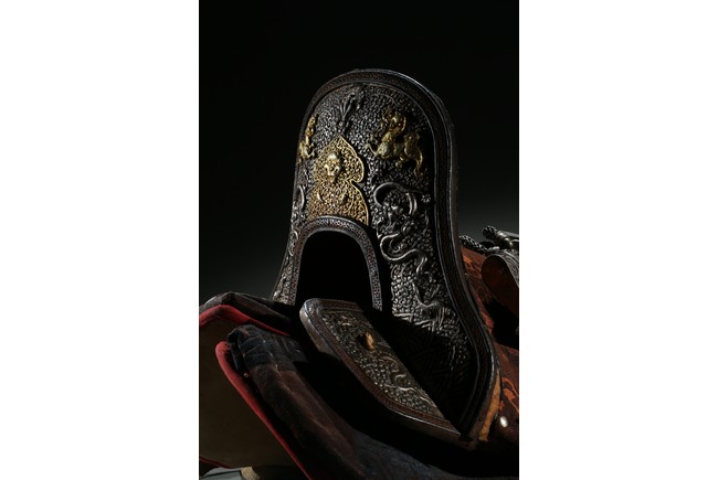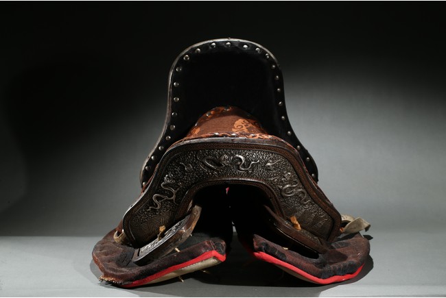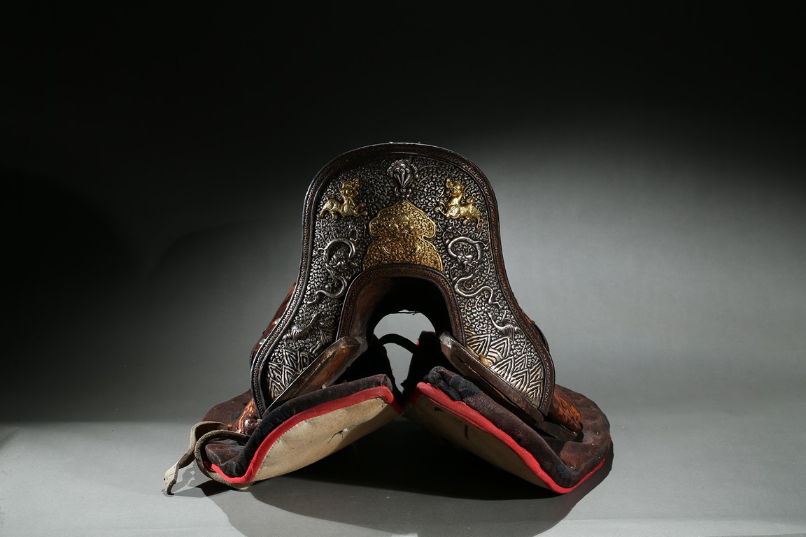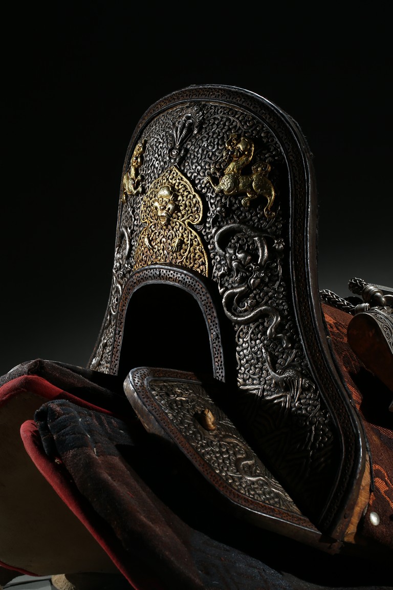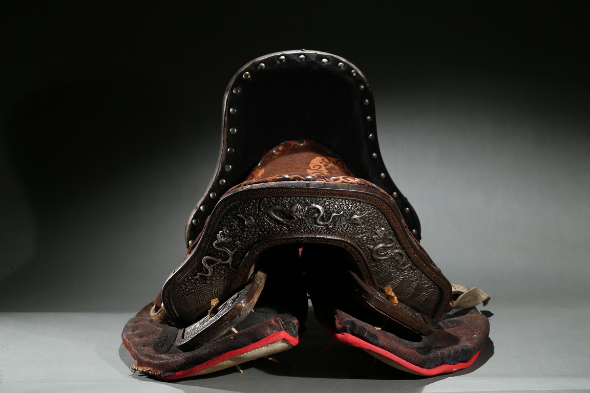 The horse saddle is covered on top with cloth, the front depicts mythical birds, beasts, and dragons surrounding beast mask amidst vine and ocean wave patterns in gilt silver, the back depicts two flying dragons confronting each other amidst similar patterns. Straps and two buckles. Qing Dynasty period.