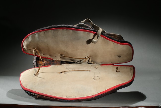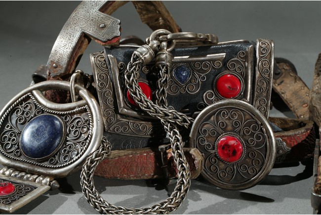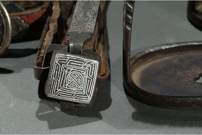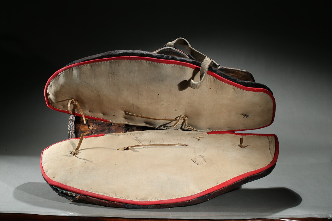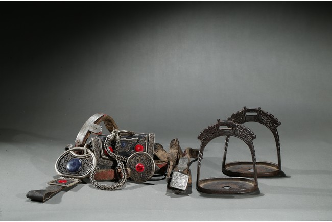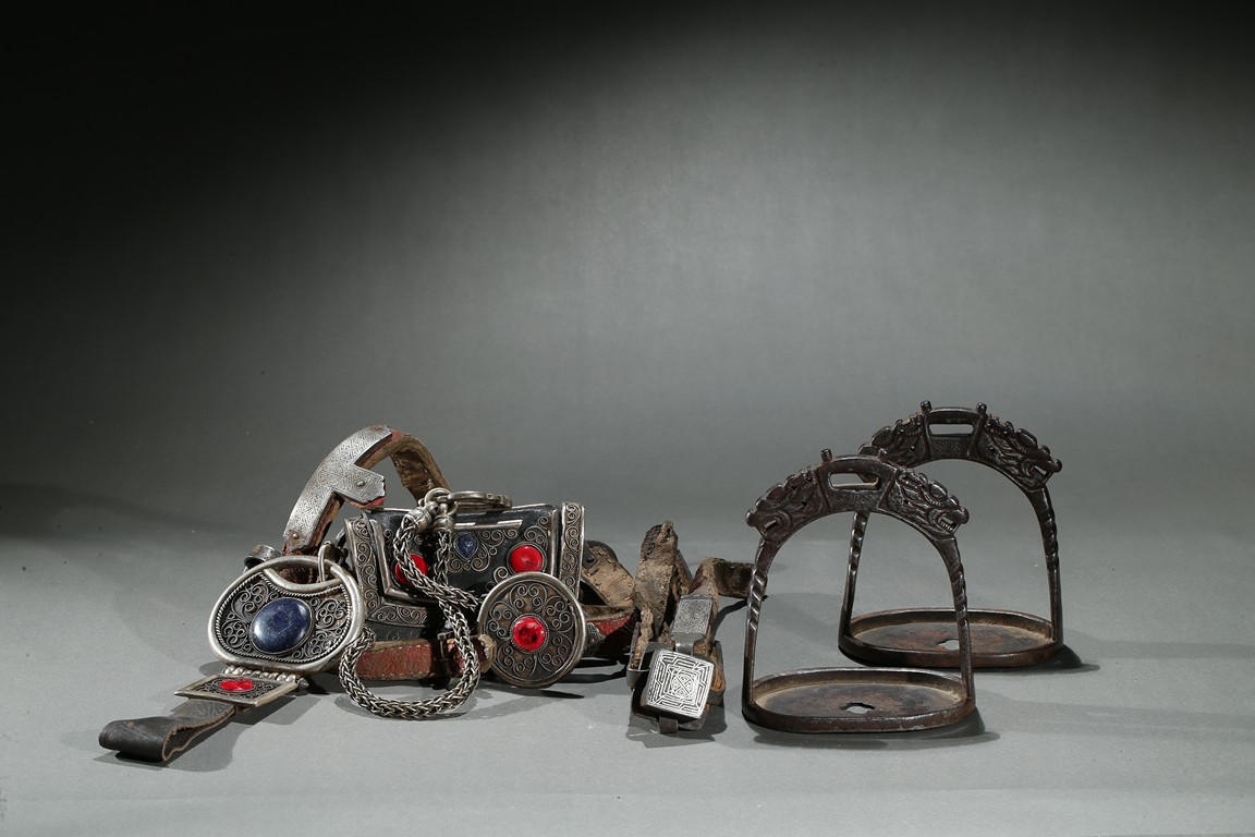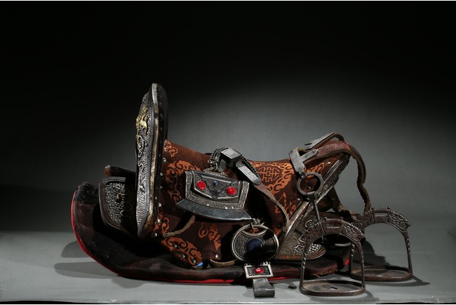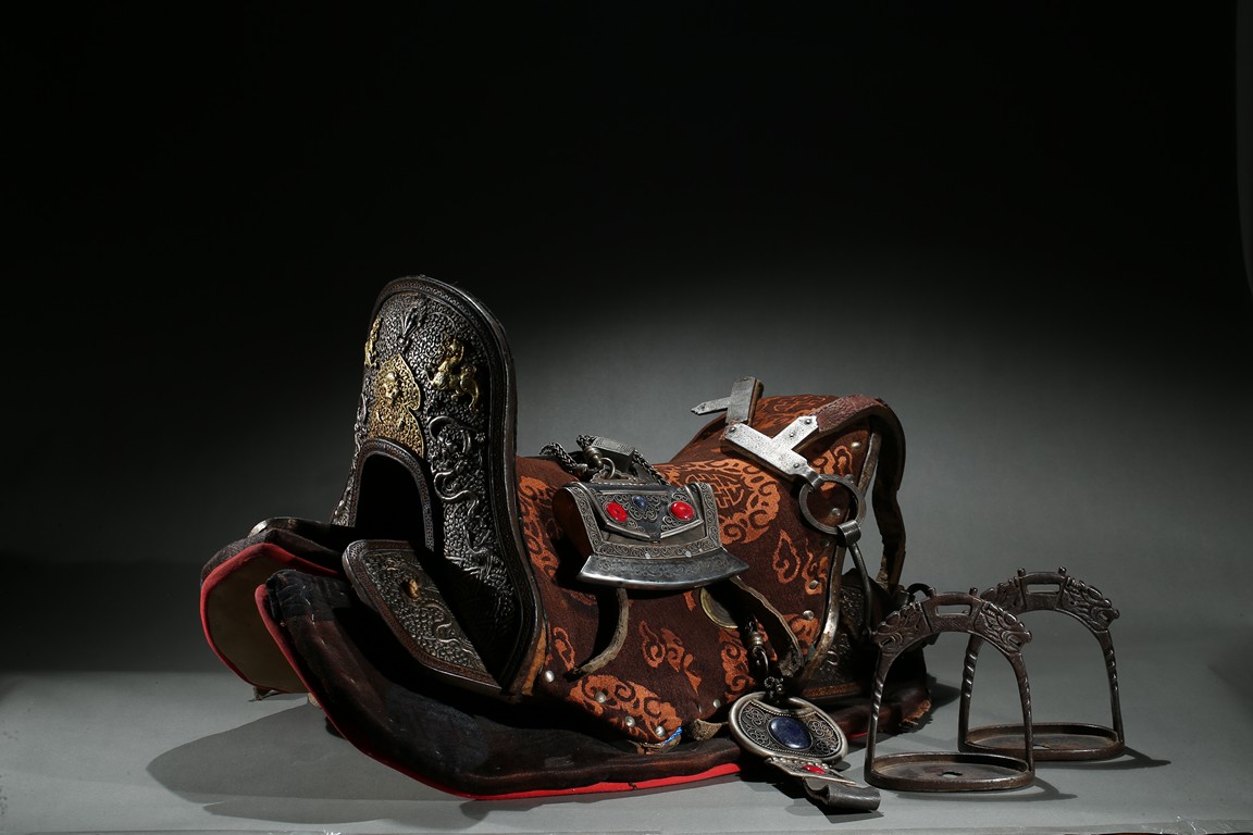 The horse saddle is covered on top with cloth, the front depicts mythical birds, beasts, and dragons surrounding beast mask amidst vine and ocean wave patterns in gilt silver, the back depicts two flying dragons confronting each other amidst similar patterns. Straps and two buckles. Qing Dynasty period.