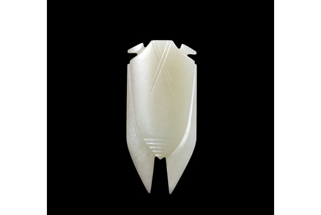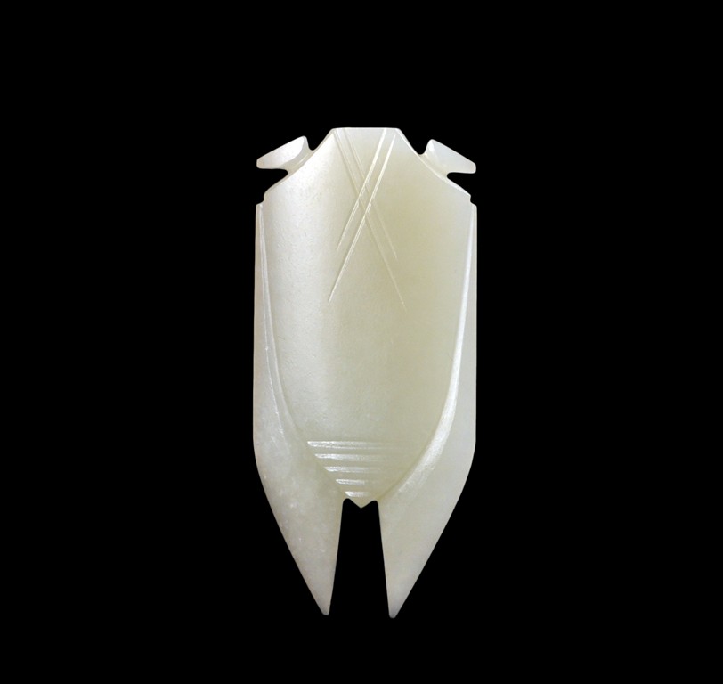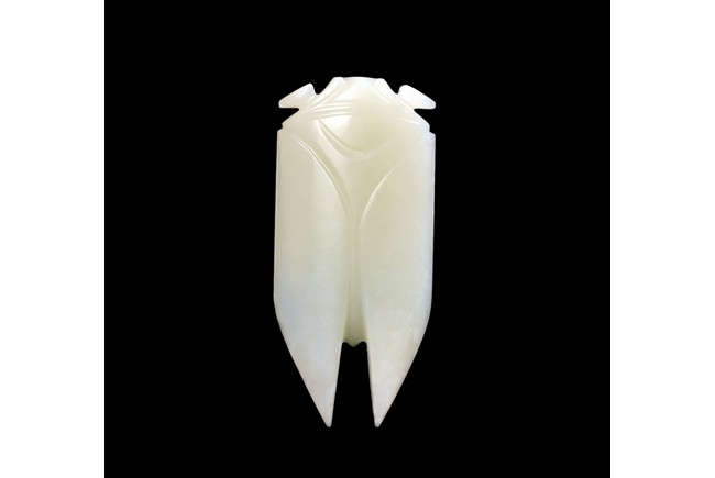 The cicada carved with protruding eyes and folded pointed wings, the stone is of even smooth white tone. Qing Dynasty period.