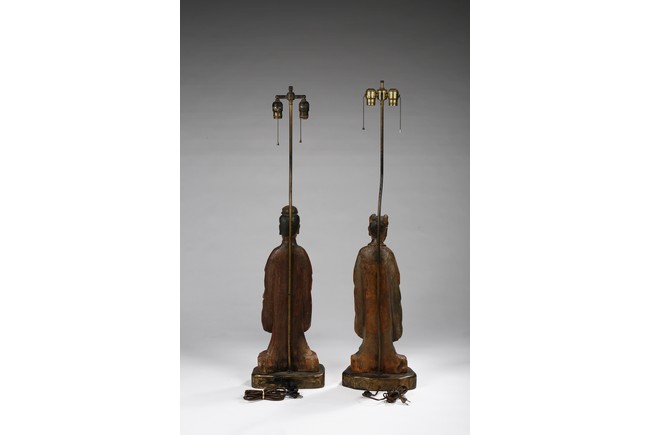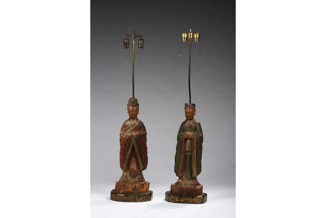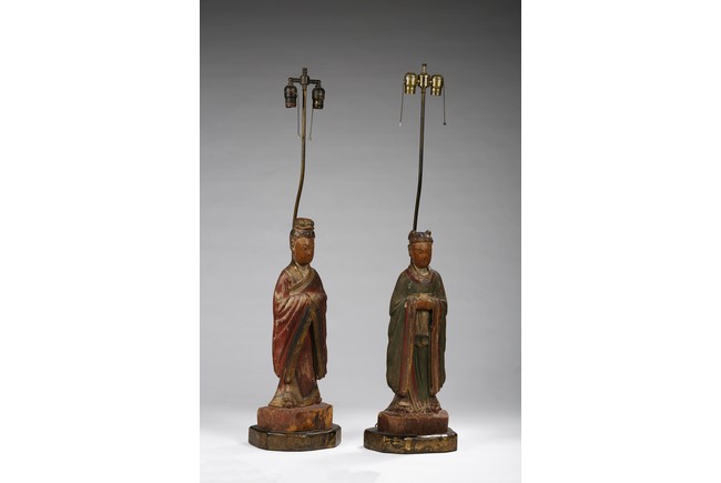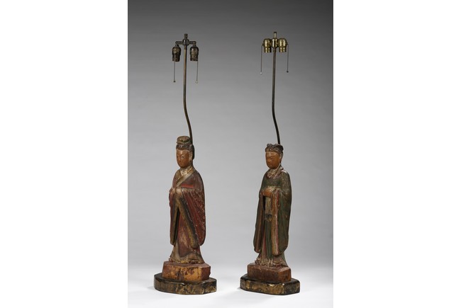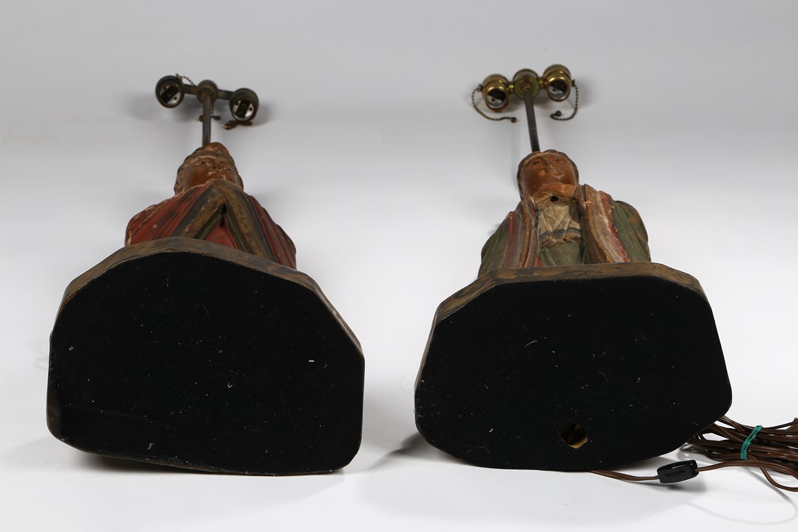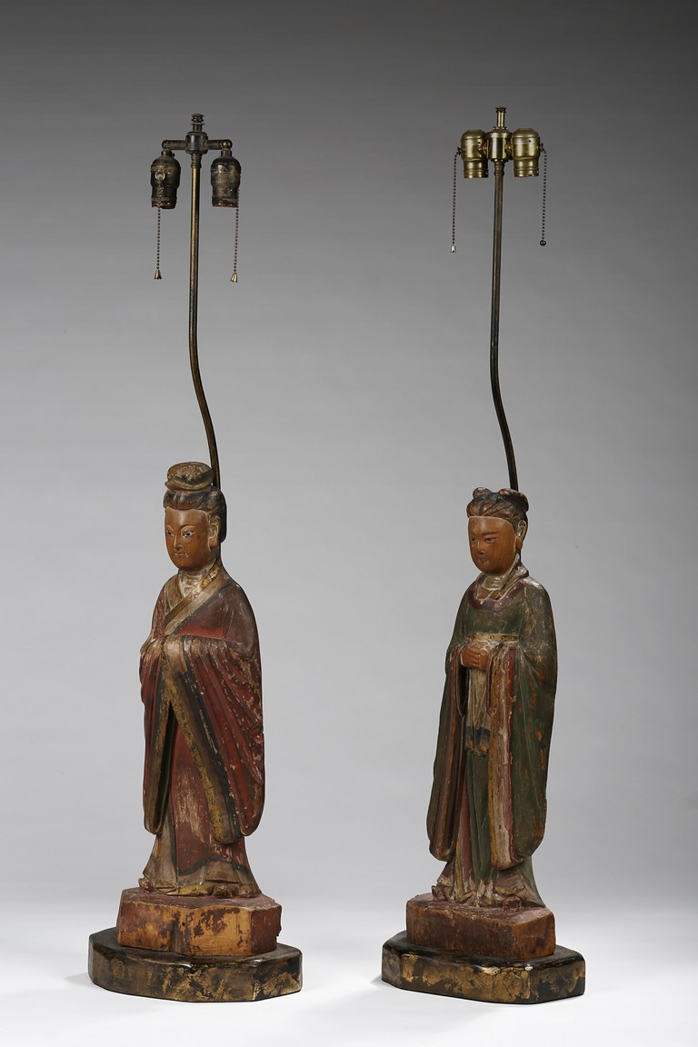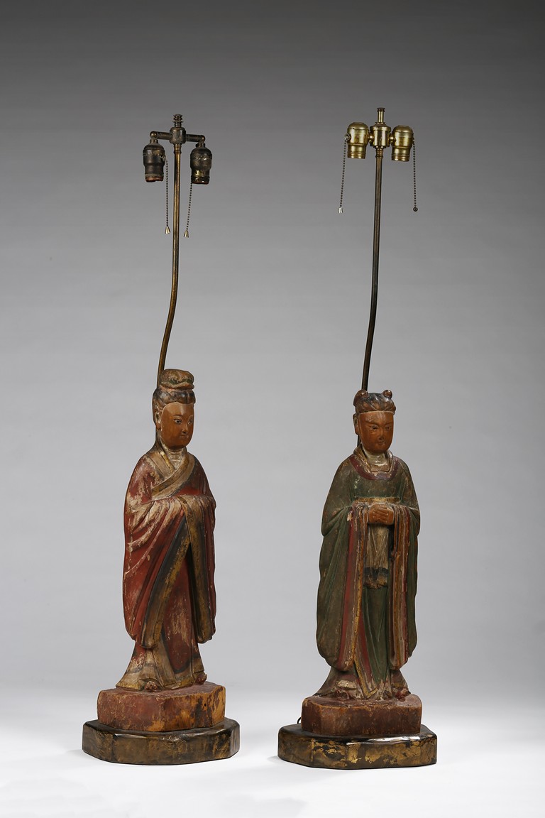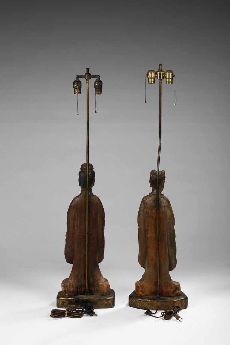 Each carved standing with black-inlaid eyes, dressed in layered garments, the bright colors and gilt paint applied primarily to the front of each figure; now attached to metal and painted wood table lamp bases. Ming Dynasty period.