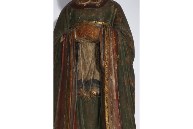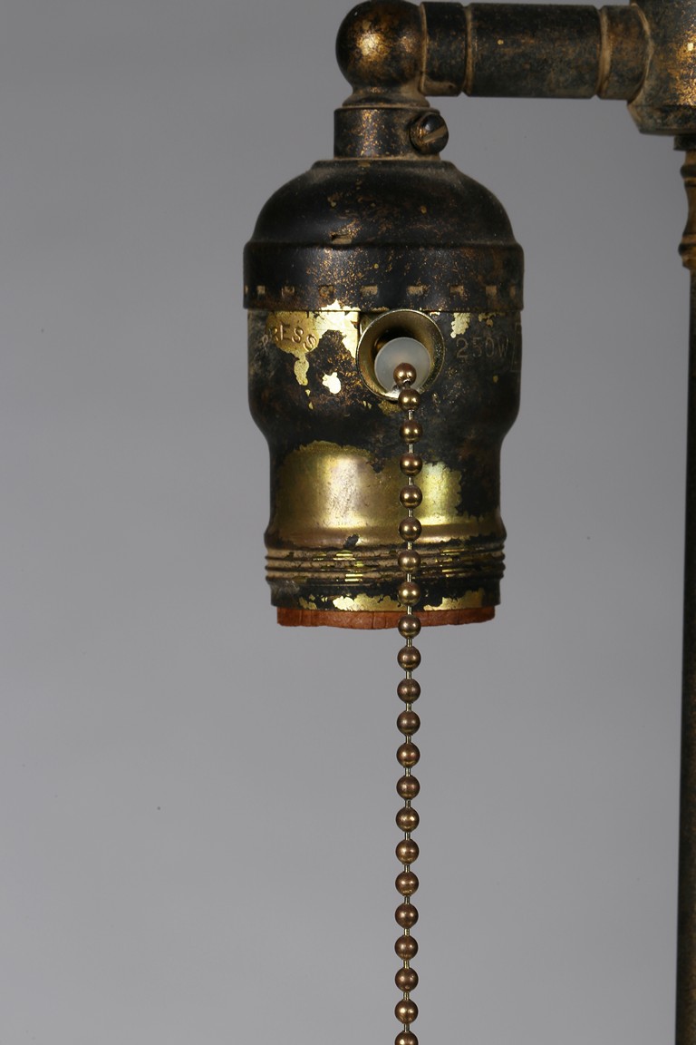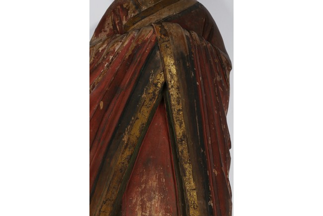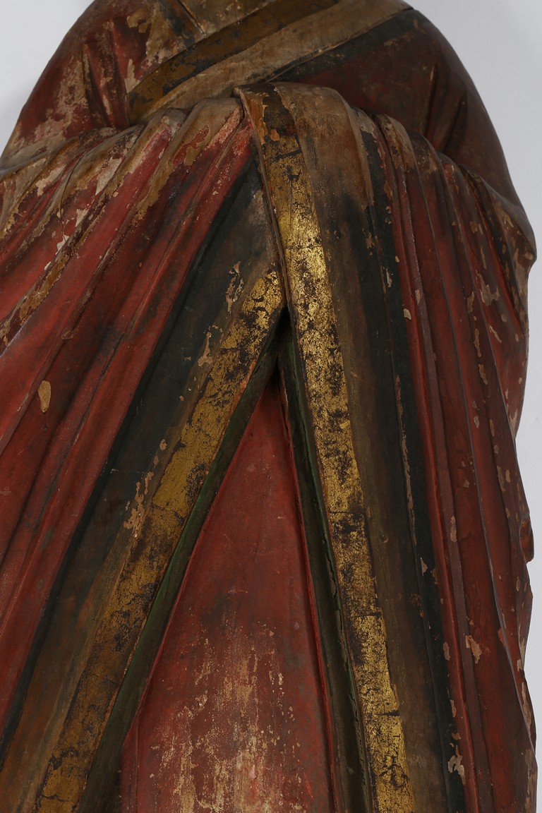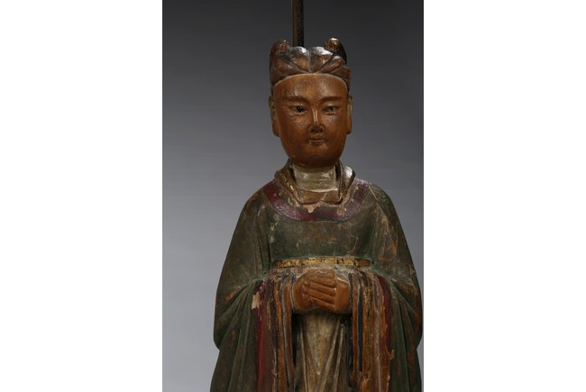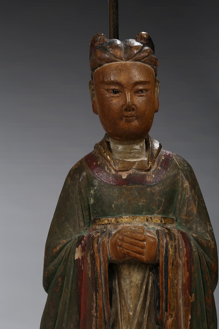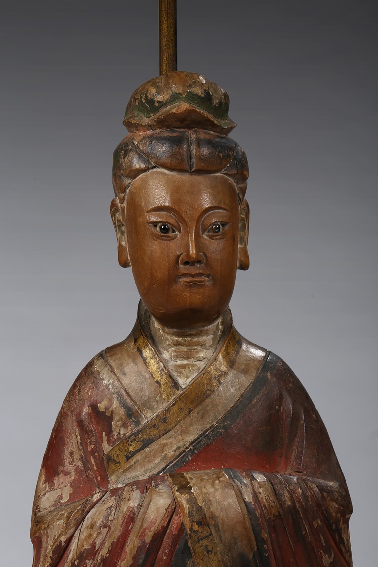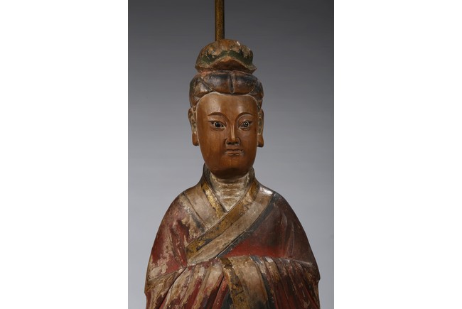 Each carved standing with black-inlaid eyes, dressed in layered garments, the bright colors and gilt paint applied primarily to the front of each figure; now attached to metal and painted wood table lamp bases. Ming Dynasty period.