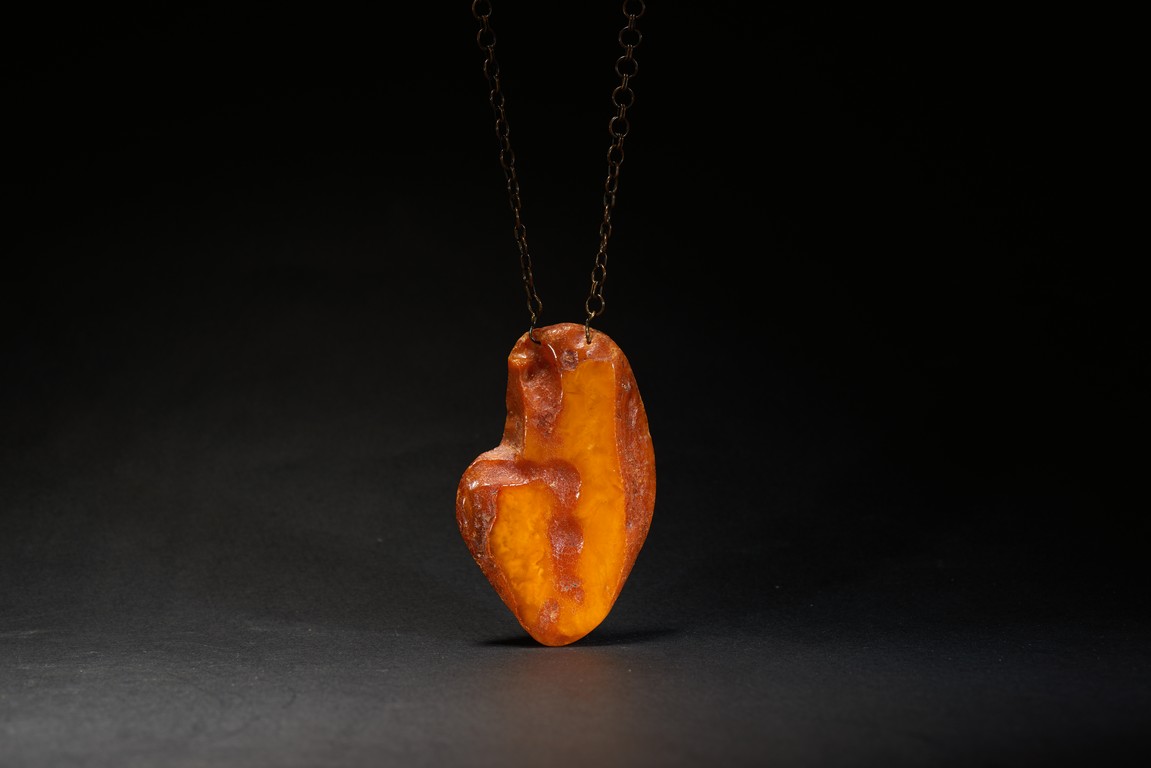 Of naturalistic shape, the amber pendant is of translucent rich caramel tone. Total weight is 52 g.