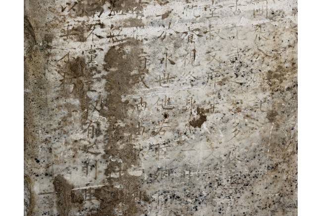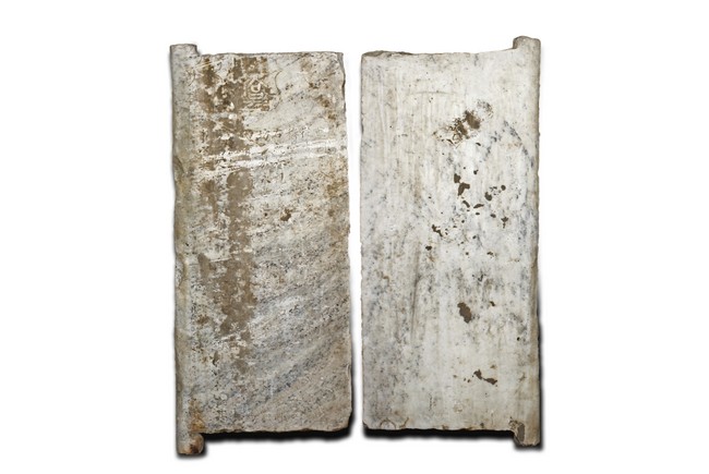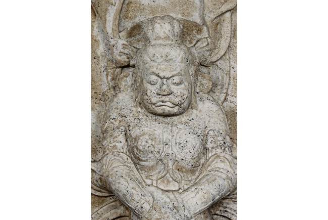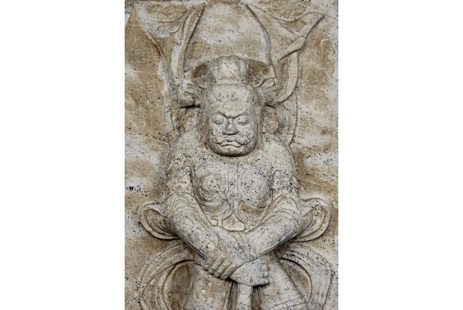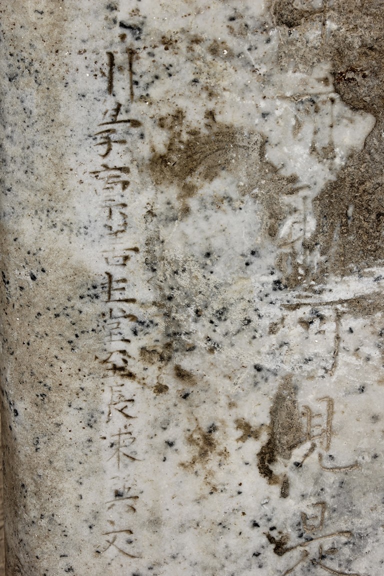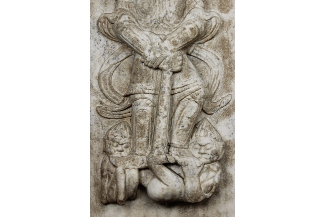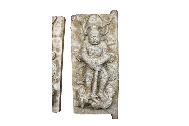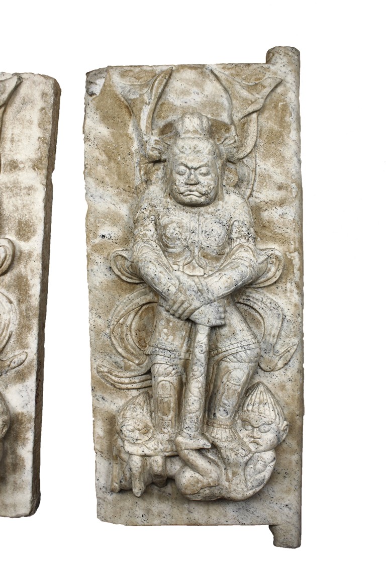 Each marble stele is carved with a standing guardian in relief, supported by two attendants, while holding a sword with both hands clasped together, face depicted with a stern expression and wearing armor with flowing sashes, the head backed by a halo. One stele's back carved with inscriptions.