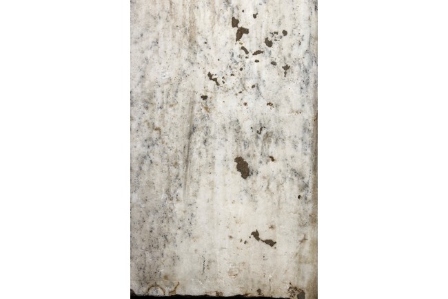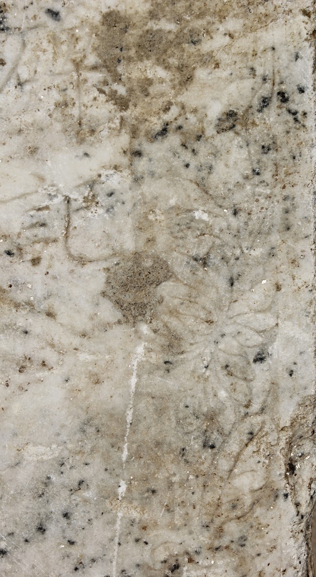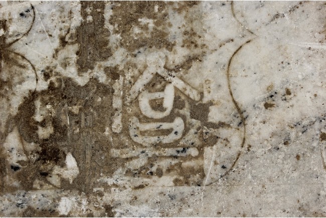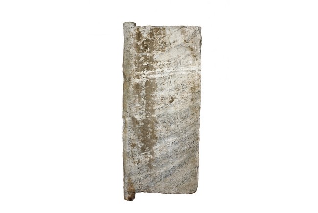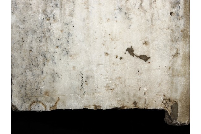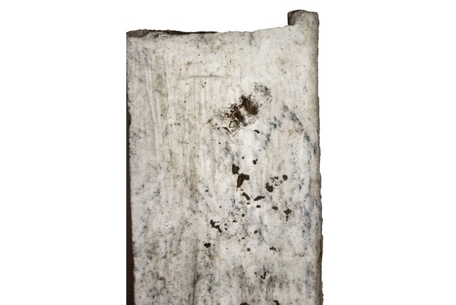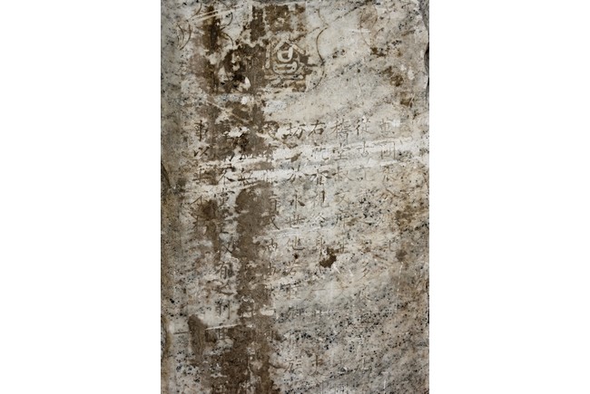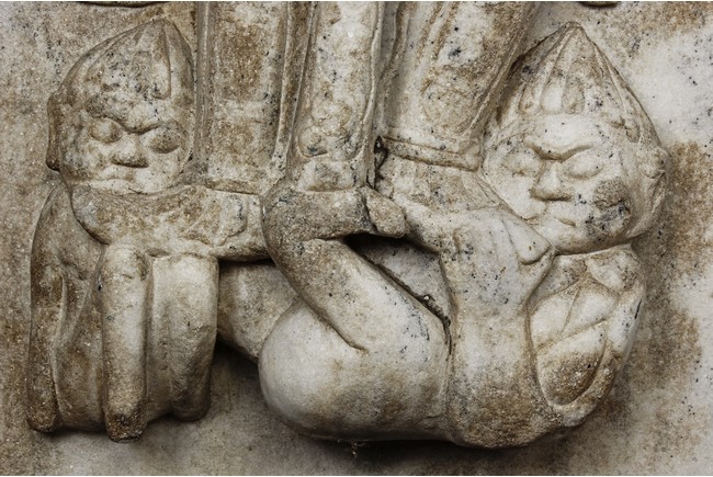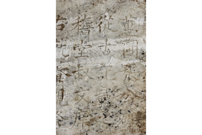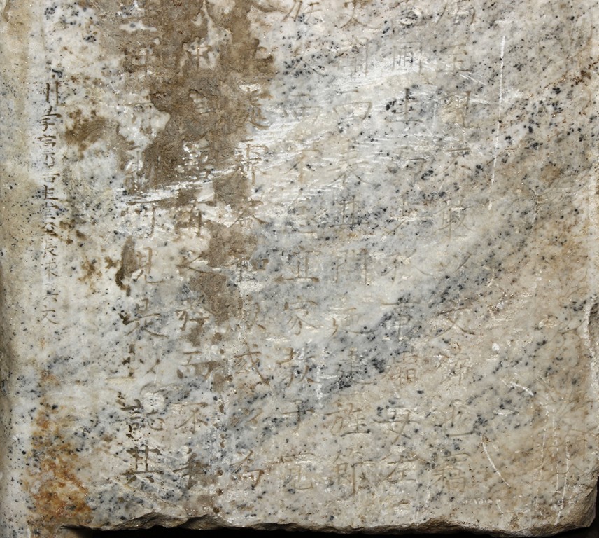 Each marble stele is carved with a standing guardian in relief, supported by two attendants, while holding a sword with both hands clasped together, face depicted with a stern expression and wearing armor with flowing sashes, the head backed by a halo. One stele's back carved with inscriptions.
