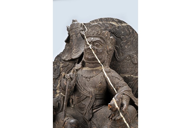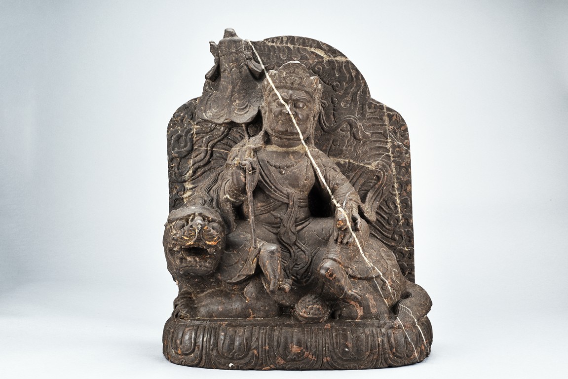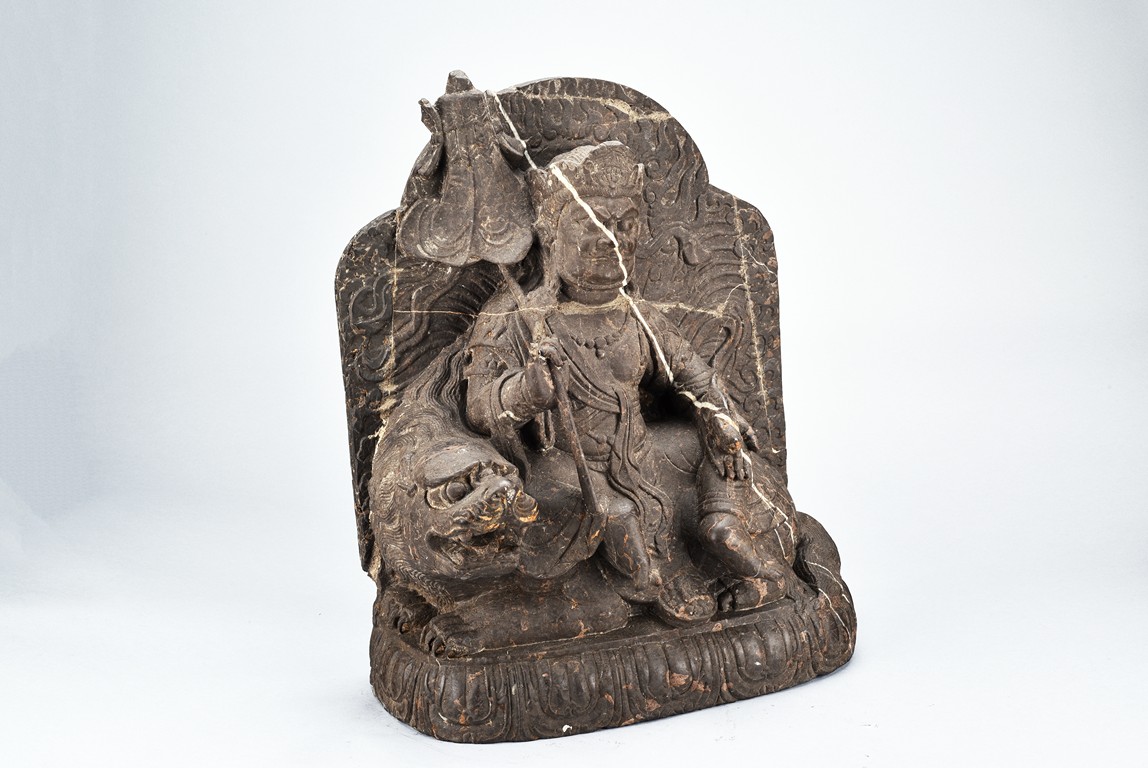 Shown seated on a lion over a lotus base, his left hand holding a mongoose, right hand holding a staff, dressed in a robe and adorned with flowing ribbons, the face with stern expression and wearing a crown. Ming Dynasty period.