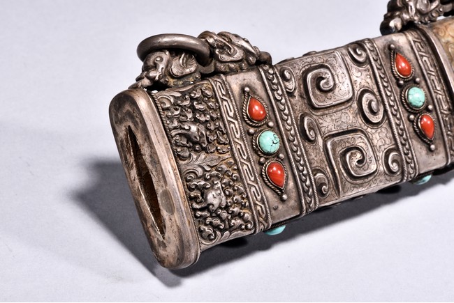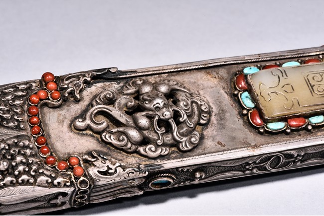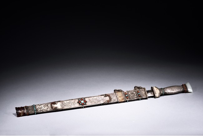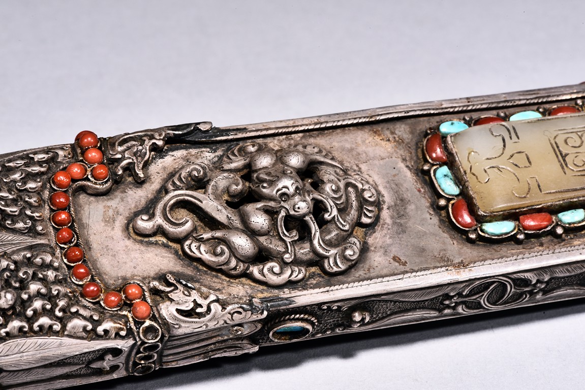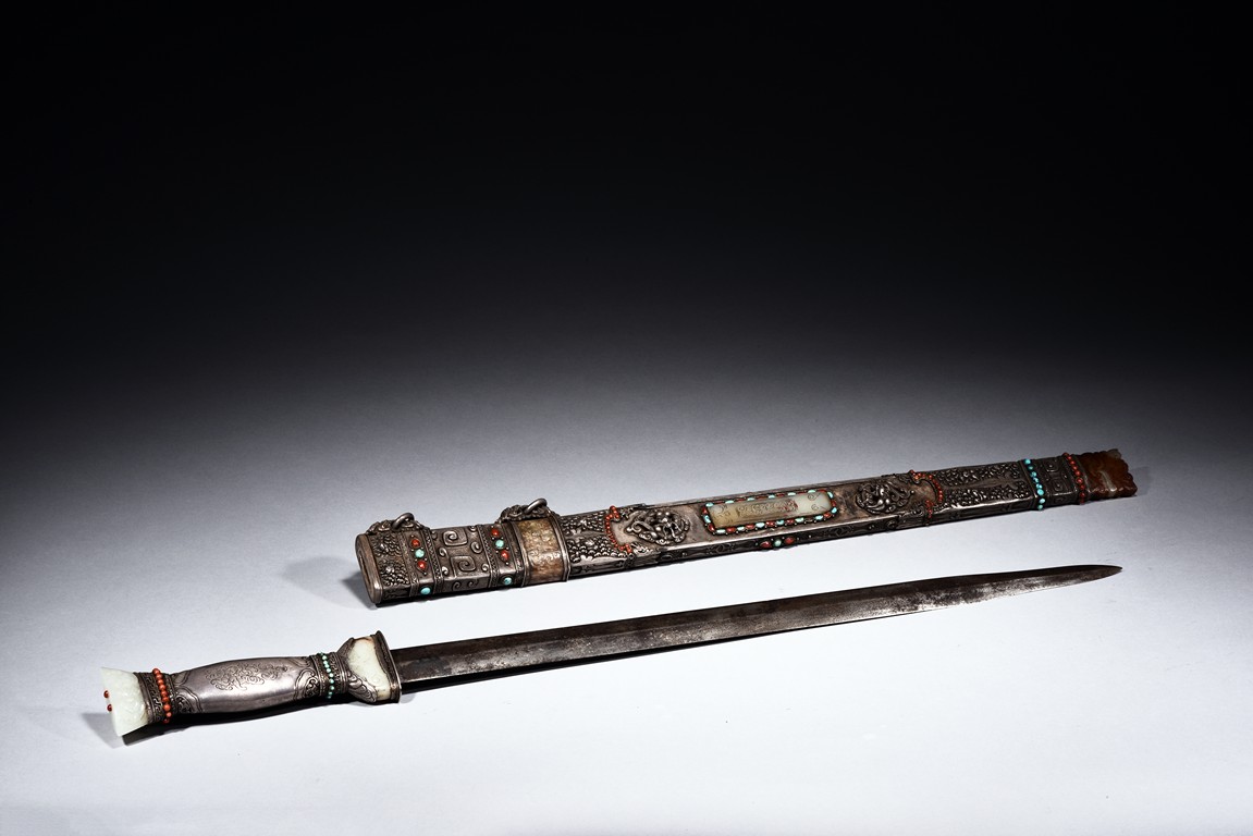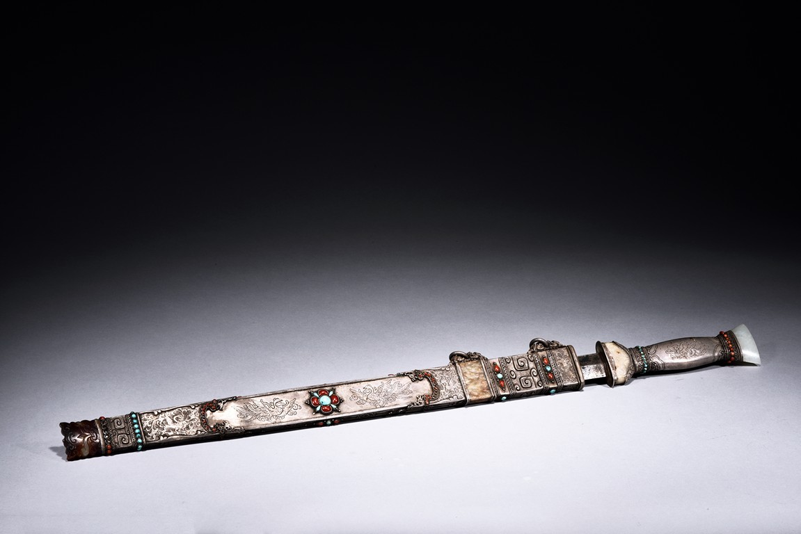 The silver handle of the sword of is attached with white jade pommel and inset with coral turquoise beads, the sheath with raised stylized dragon medallions and scrolling decoration in relief, and further inset with rectangular white jade plaque at center and turquoise, coral beads on both ends, accompanied with a hardwood stand. Qing Dynasty period.