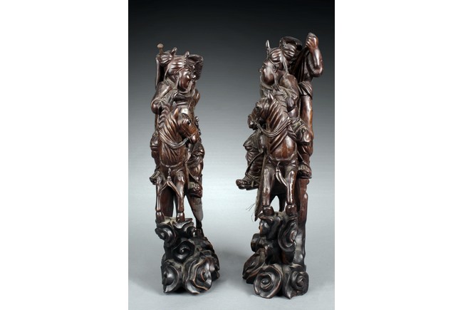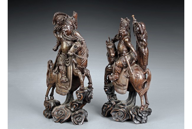 The figure depicts Guanyu, wearing armor with cloth on top, is mounted on a horse on top of clouds, while a bearded man with a machete is seen standing on the clouds behind Guanyu; silver lines inset into wood to create delicate patterns. Qing Dynasty period.