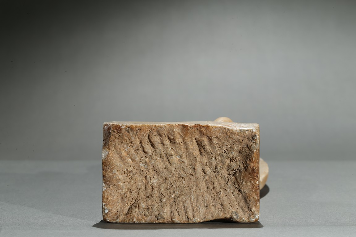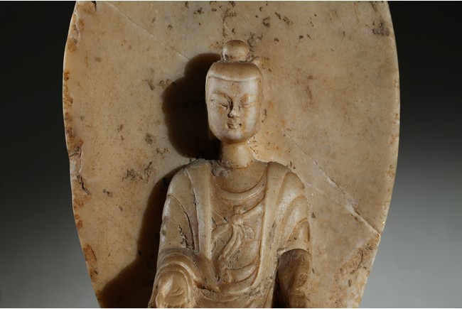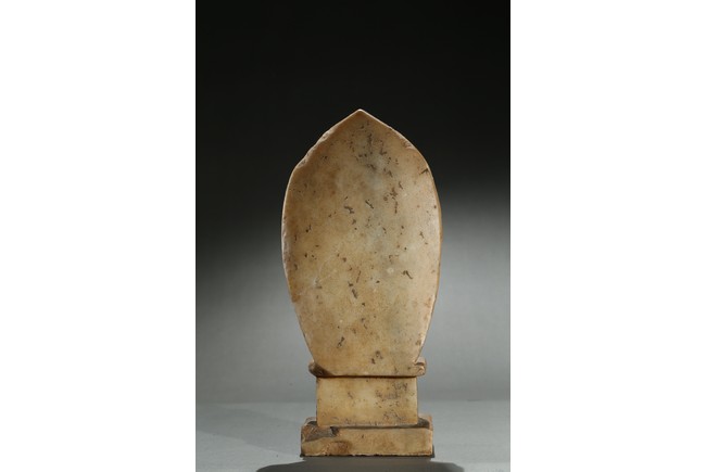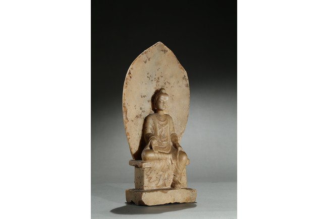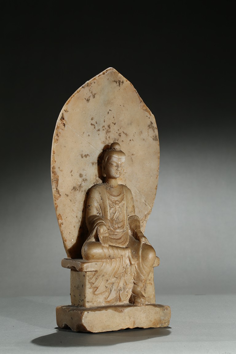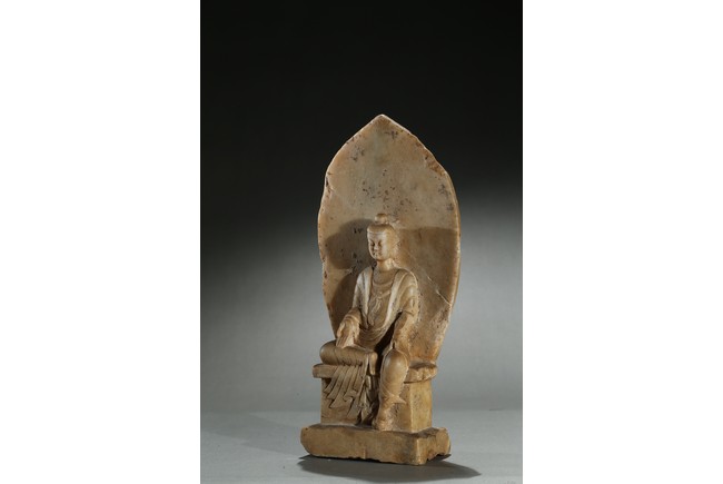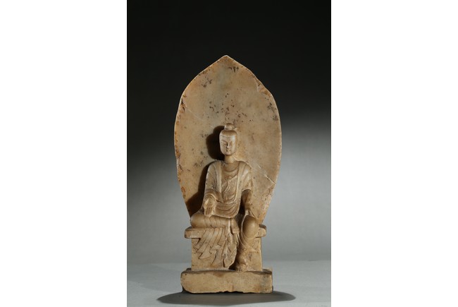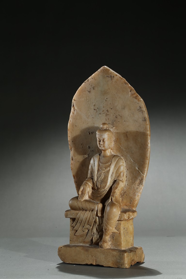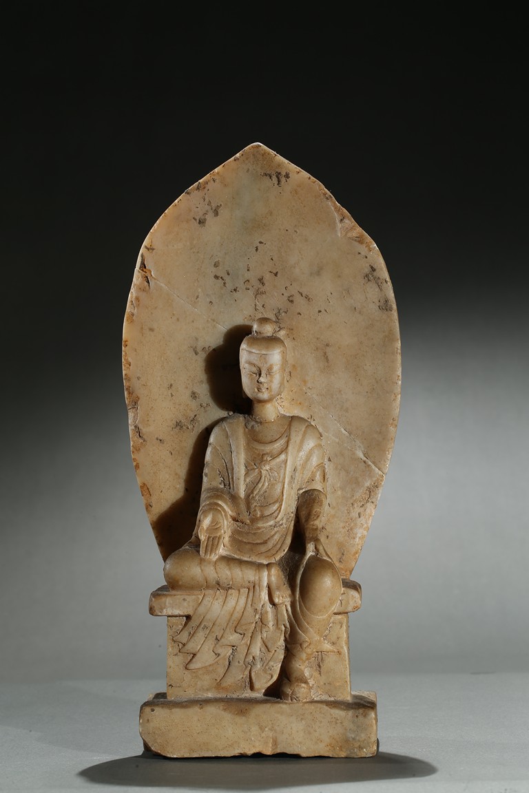 Carved in high relief supported on a rectangular plinth and against a pointed, petal-shaped halo with a central figure of bodhisattva seated in the posture of royal ease, dressed in long robes falling in graceful folds, face with meditative expression, hair tied into chignon, the right hand in varada mudra, all raised on a wider rectangular plinth. Northern Qi Dynasty period.