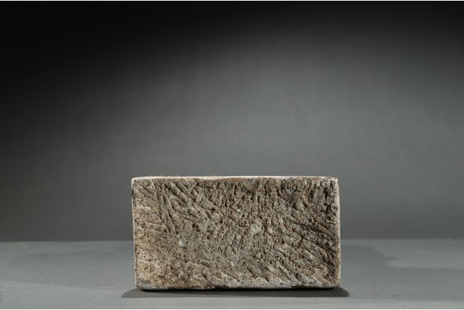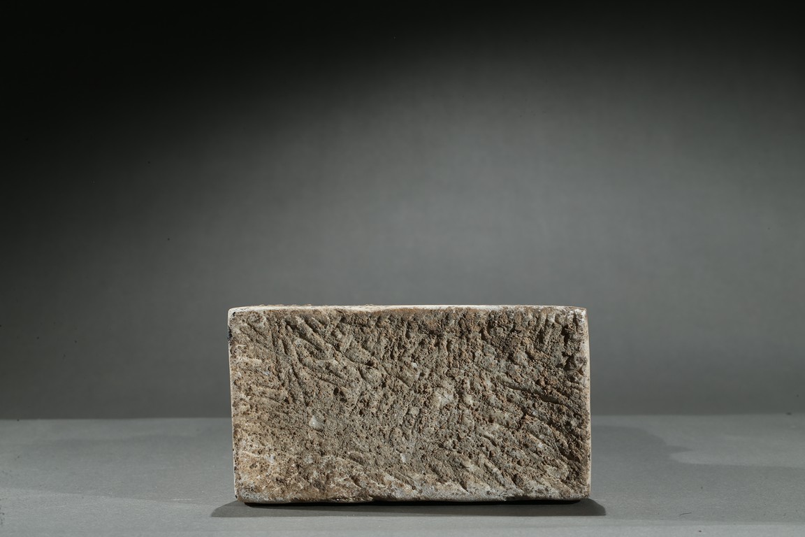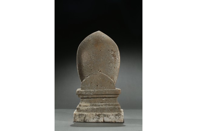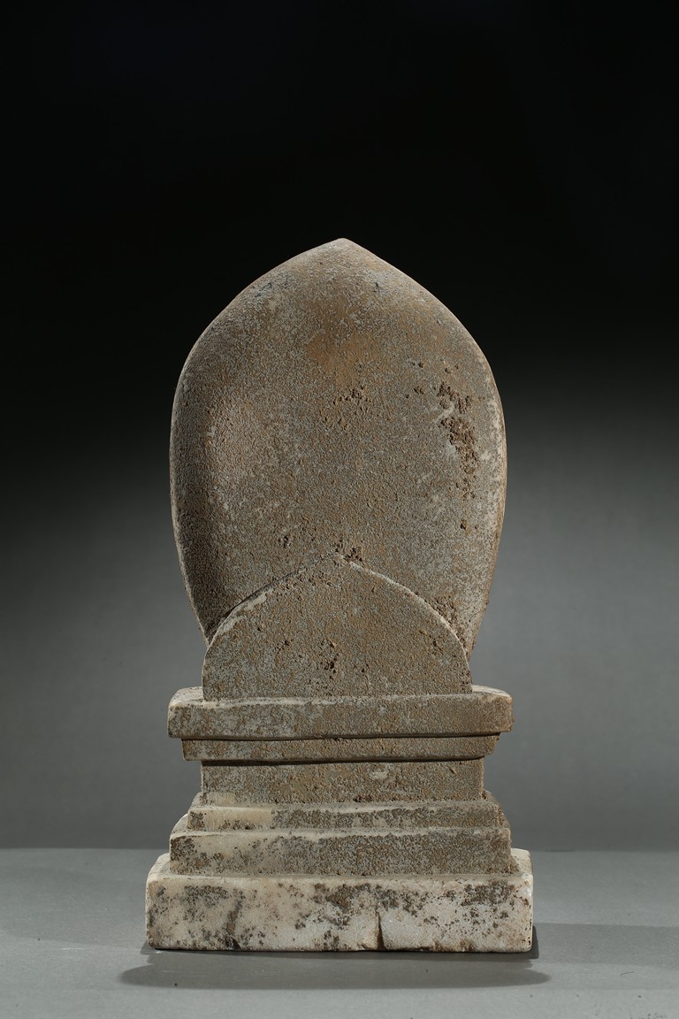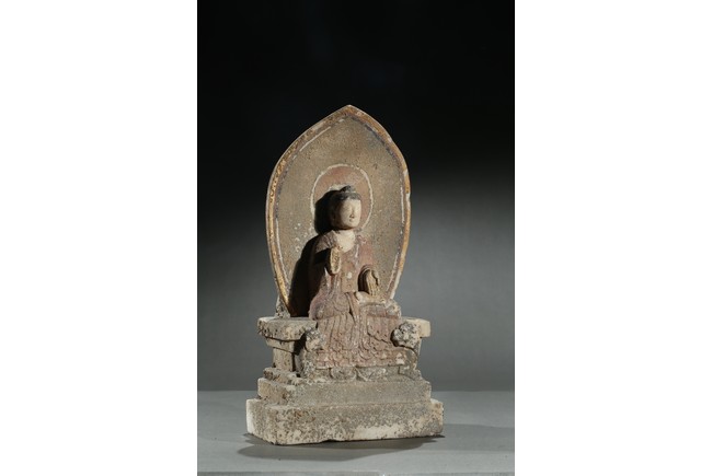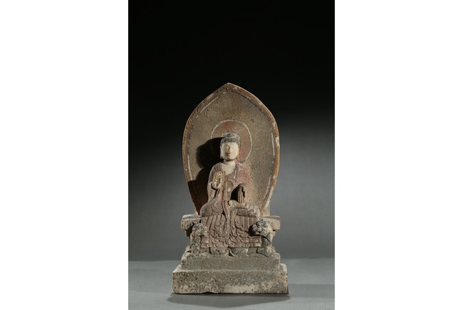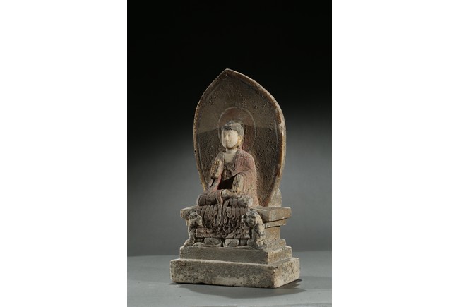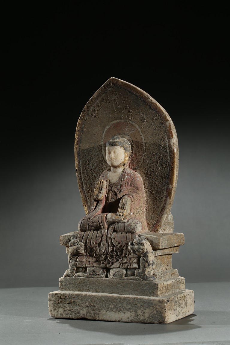 Carved with a buddha seated in dhyanasana on a rectangular plinth above two buddhist lions sitting opposite with head turned back, his hands in abhaya mudra, wearing long robe tied at chest, face with serene expression, backed by a pointed petal-like mandorla, with traces of pigments on the robe and hands. Northern Wei Dynasty period.
