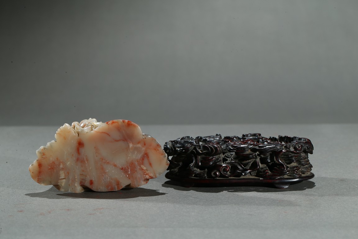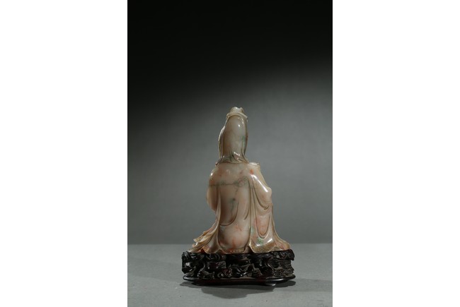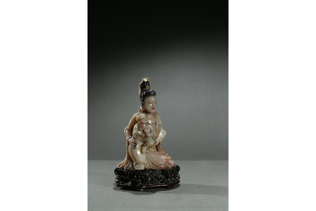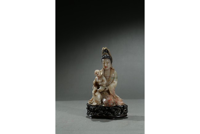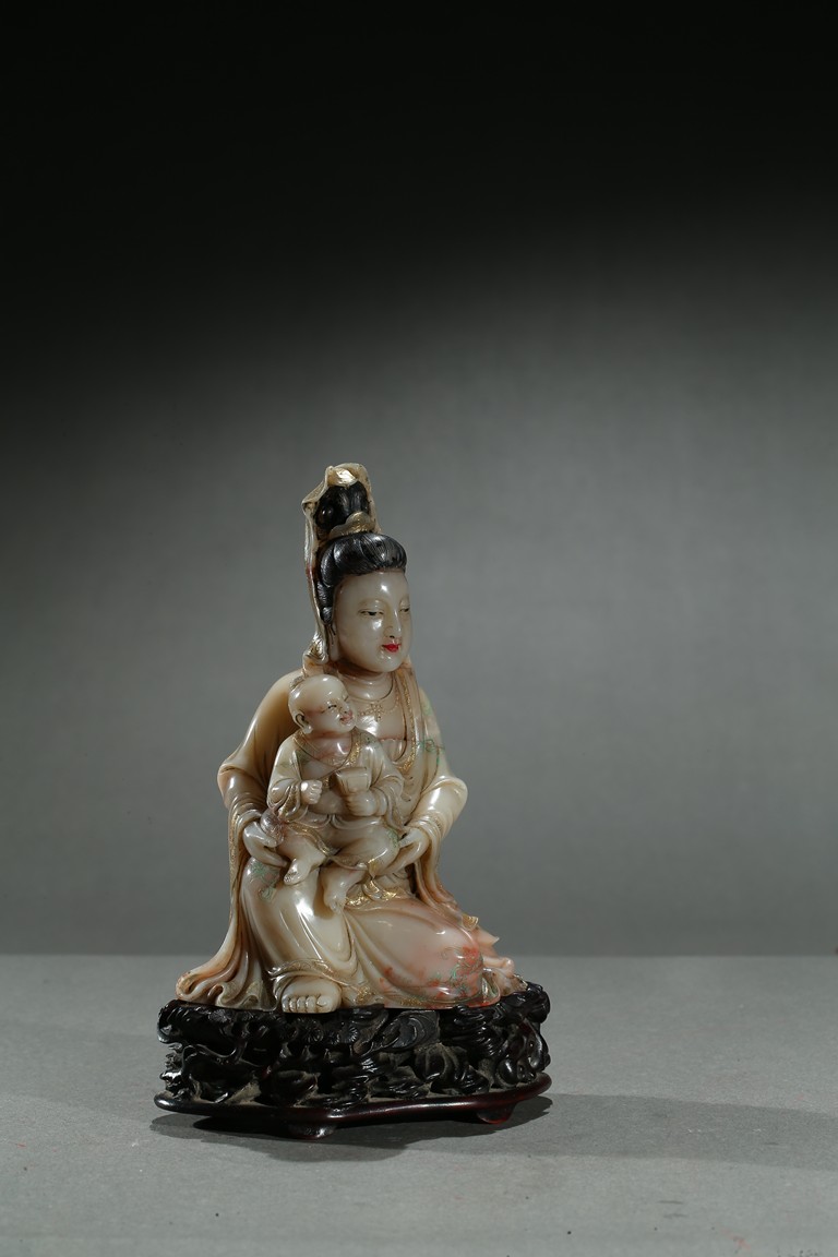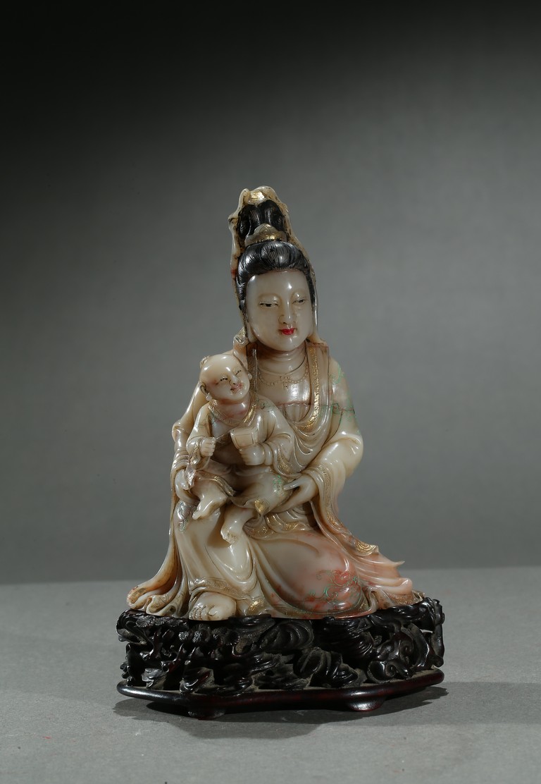 The elegant goddess seated in long robes falling in elegant folds, hems finely gilt-painted with foliate scrolls, wearing a cowl over her high topknot, carrying a young boy around her arms, the stone of a beige tone, with traces pigments left, all supported on a hardwood stand. Qing Dynasty period.
