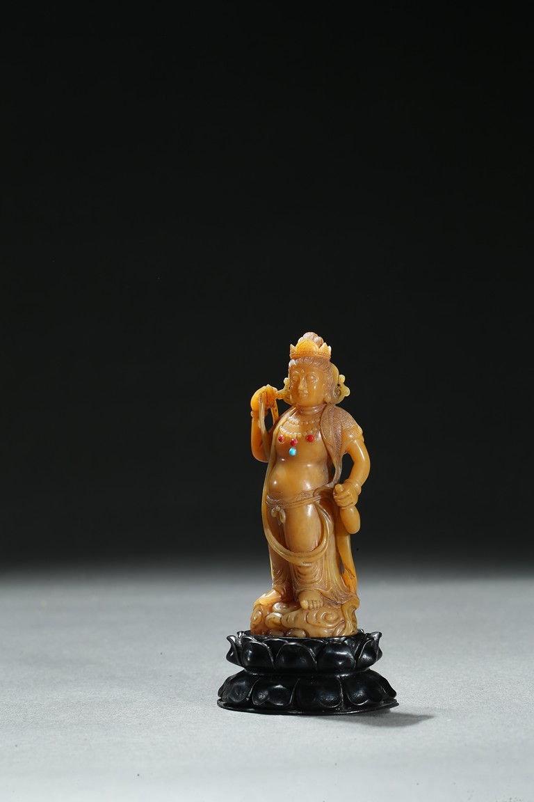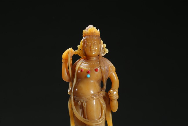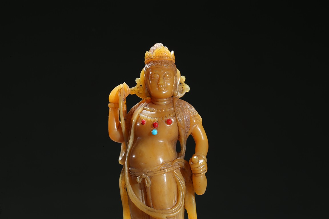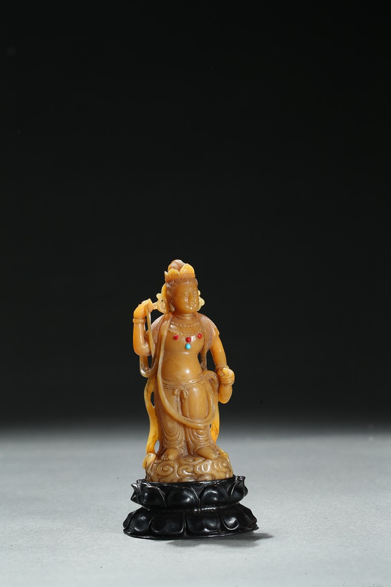 Standing upright upon a cloud stand, the bodhisattva shown wearing dhoti revealing bare chest and adorned with beaded necklace inlaid with coral and turquoise beads, face with serene expression, hair pulled into high chignon behind pointed crown, back finely carved with dense cloud pattern. Qing Dynasty period.