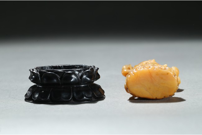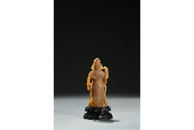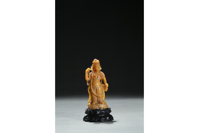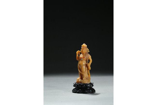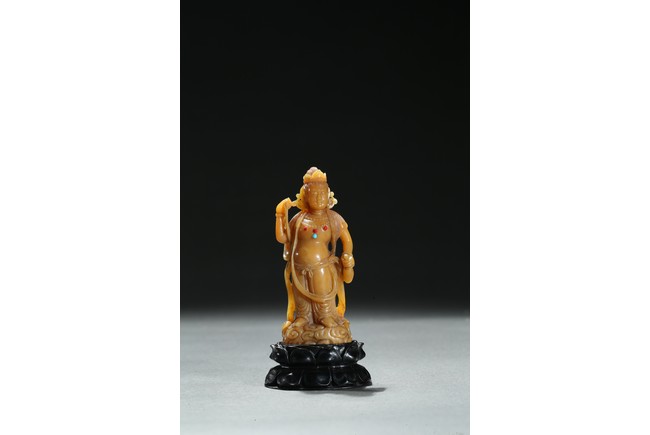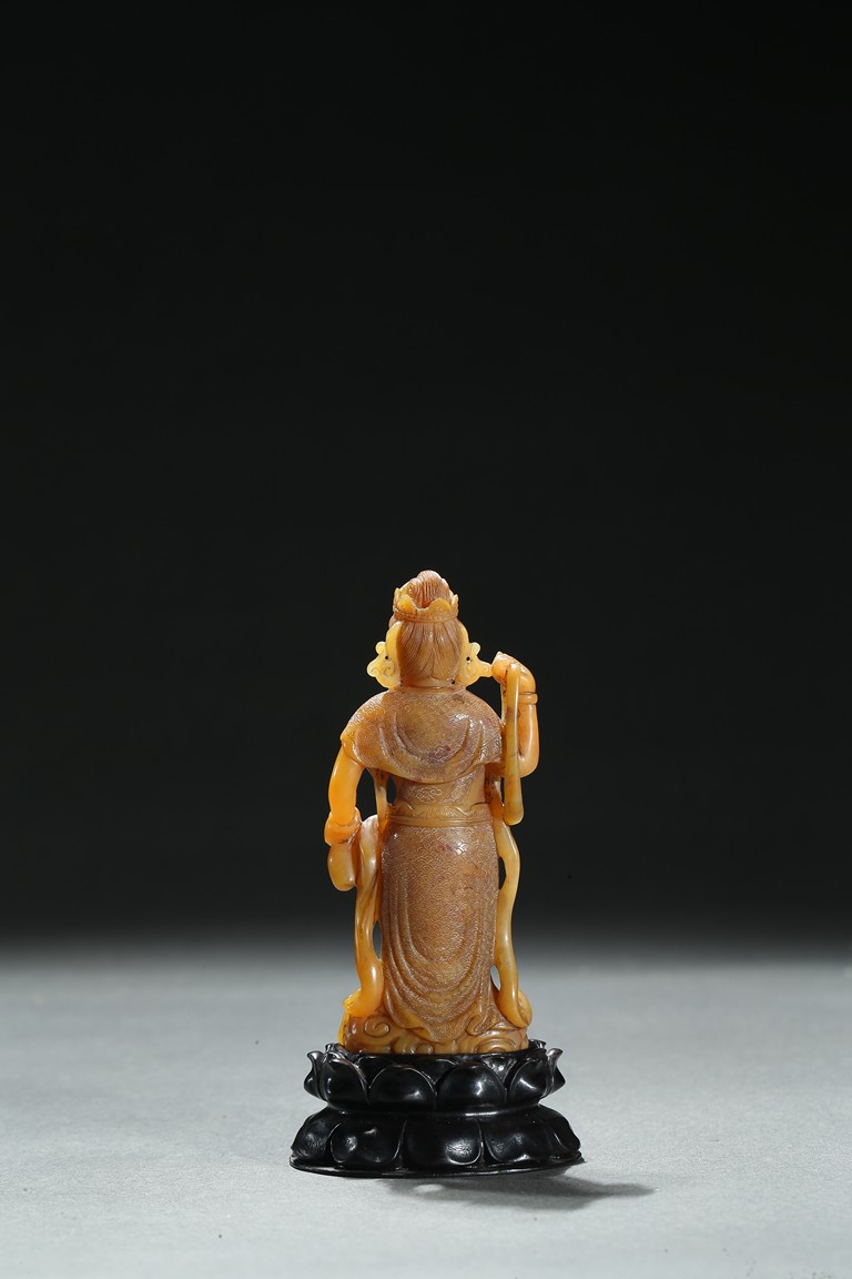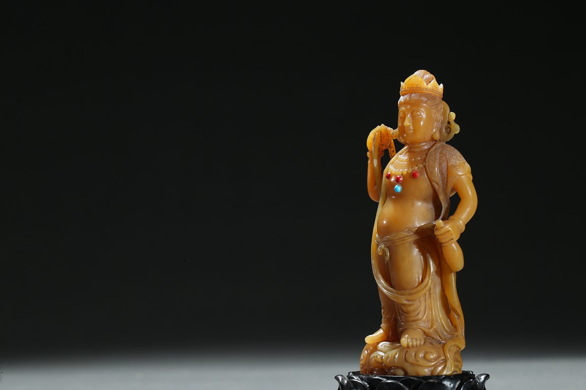 Standing upright upon a cloud stand, the bodhisattva shown wearing dhoti revealing bare chest and adorned with beaded necklace inlaid with coral and turquoise beads, face with serene expression, hair pulled into high chignon behind pointed crown, back finely carved with dense cloud pattern. Qing Dynasty period.