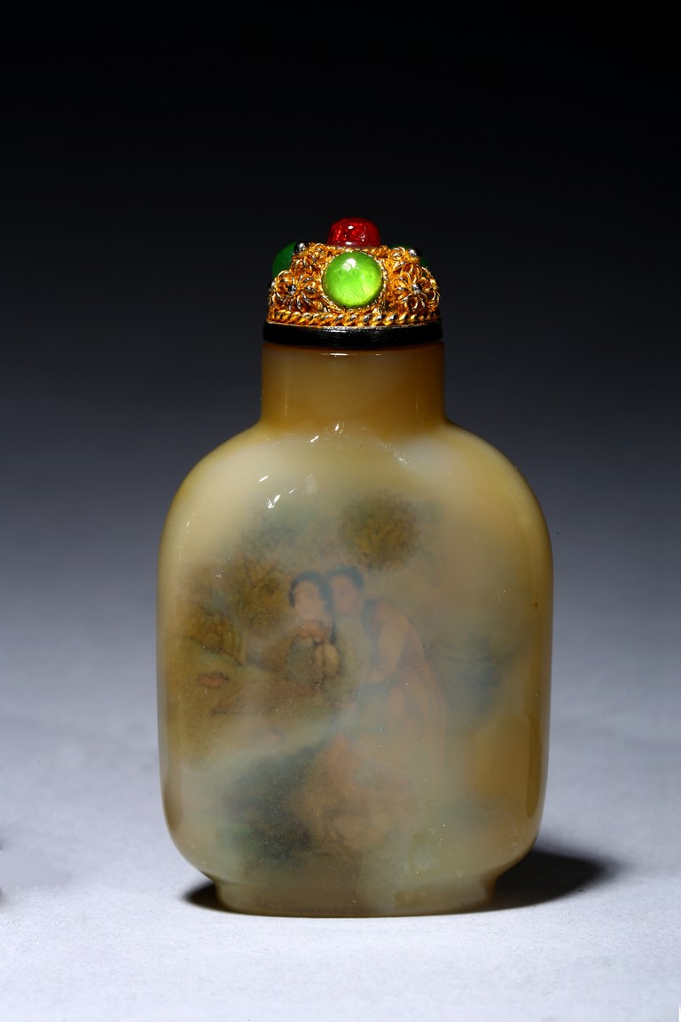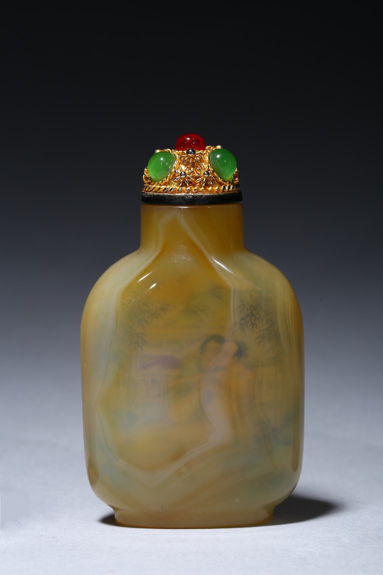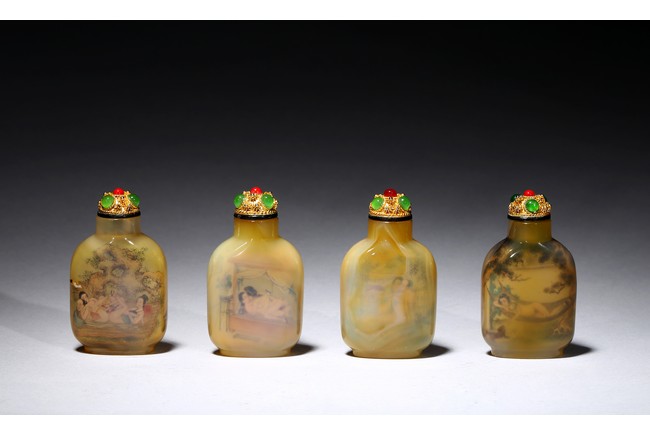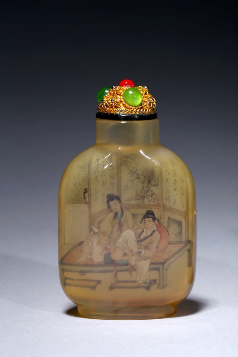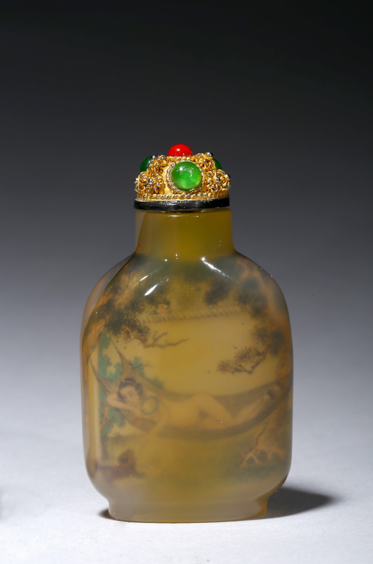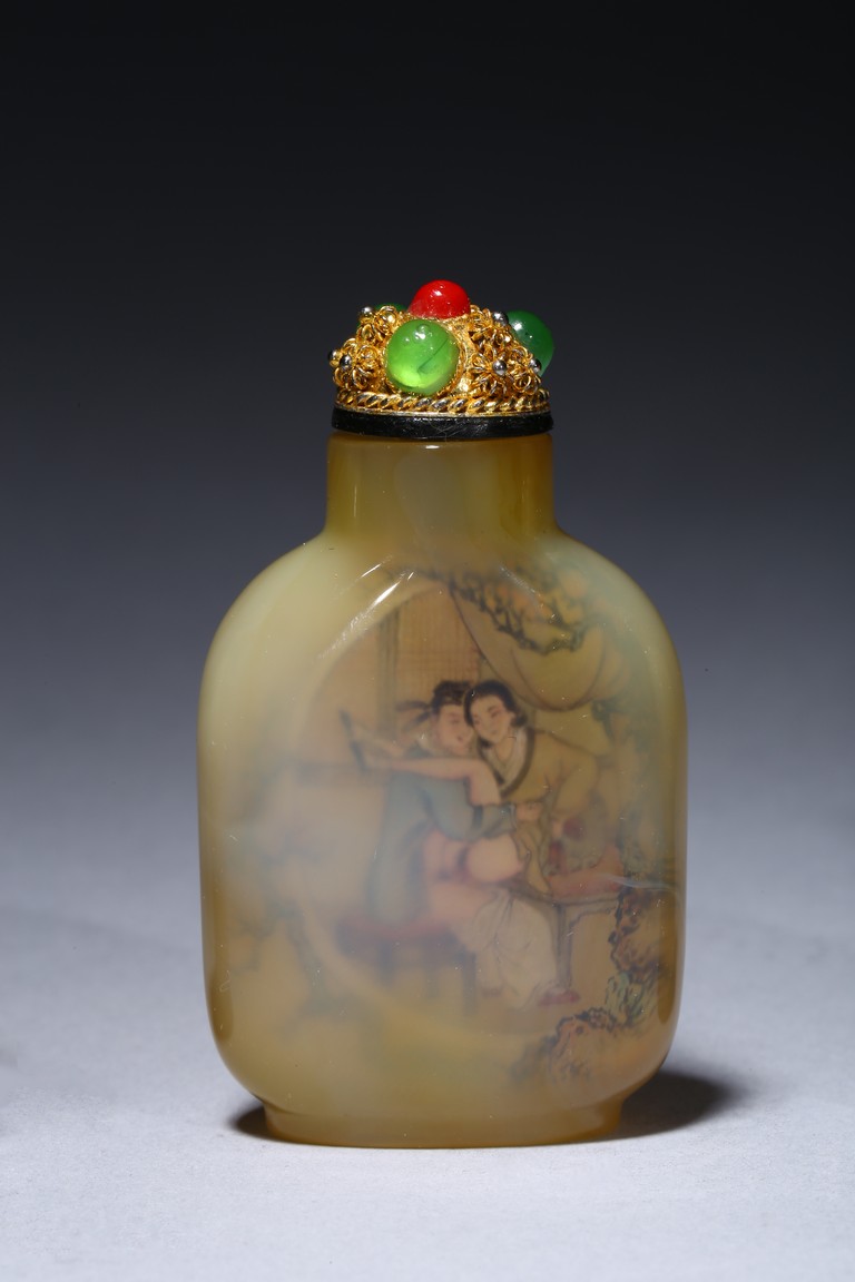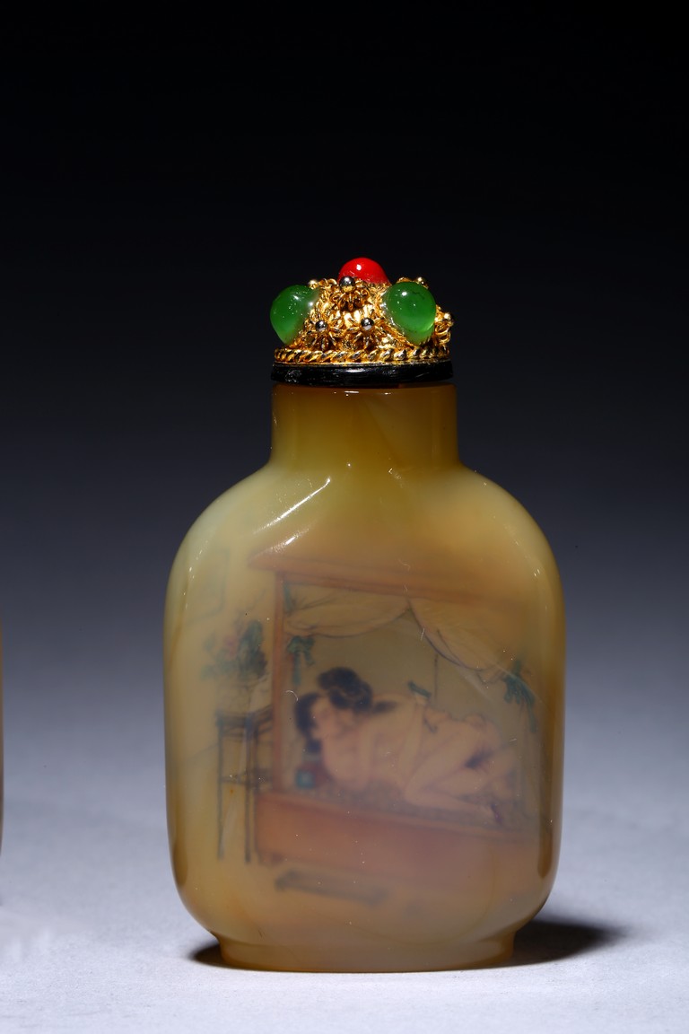 Each of rounded rectangular form sloping to a straight cylindrical neck, resting on an oval foot, finely painted inside with erotic scene, with fitted stopper inlaid with red and green gems.