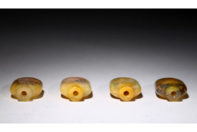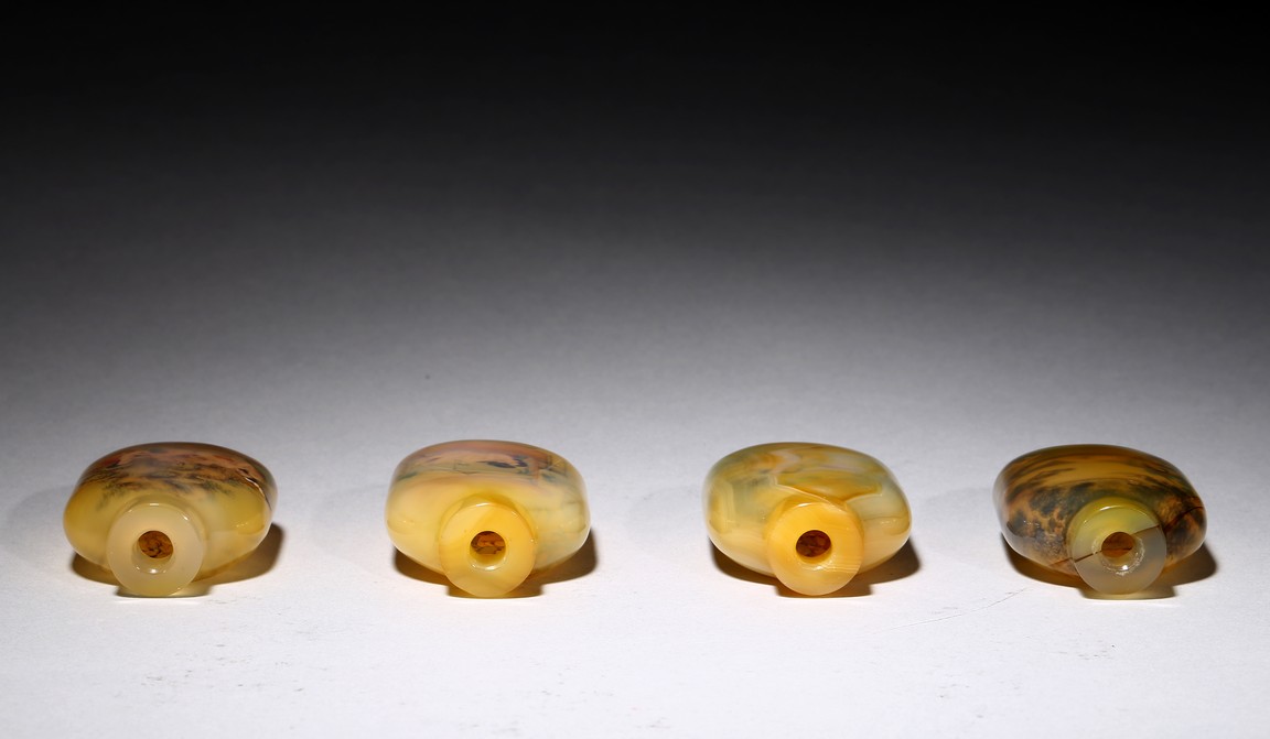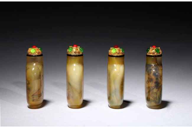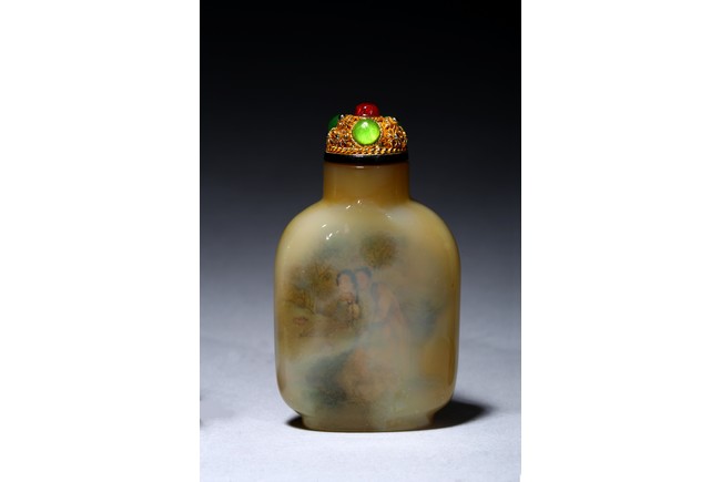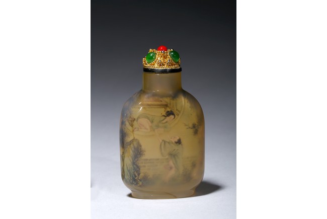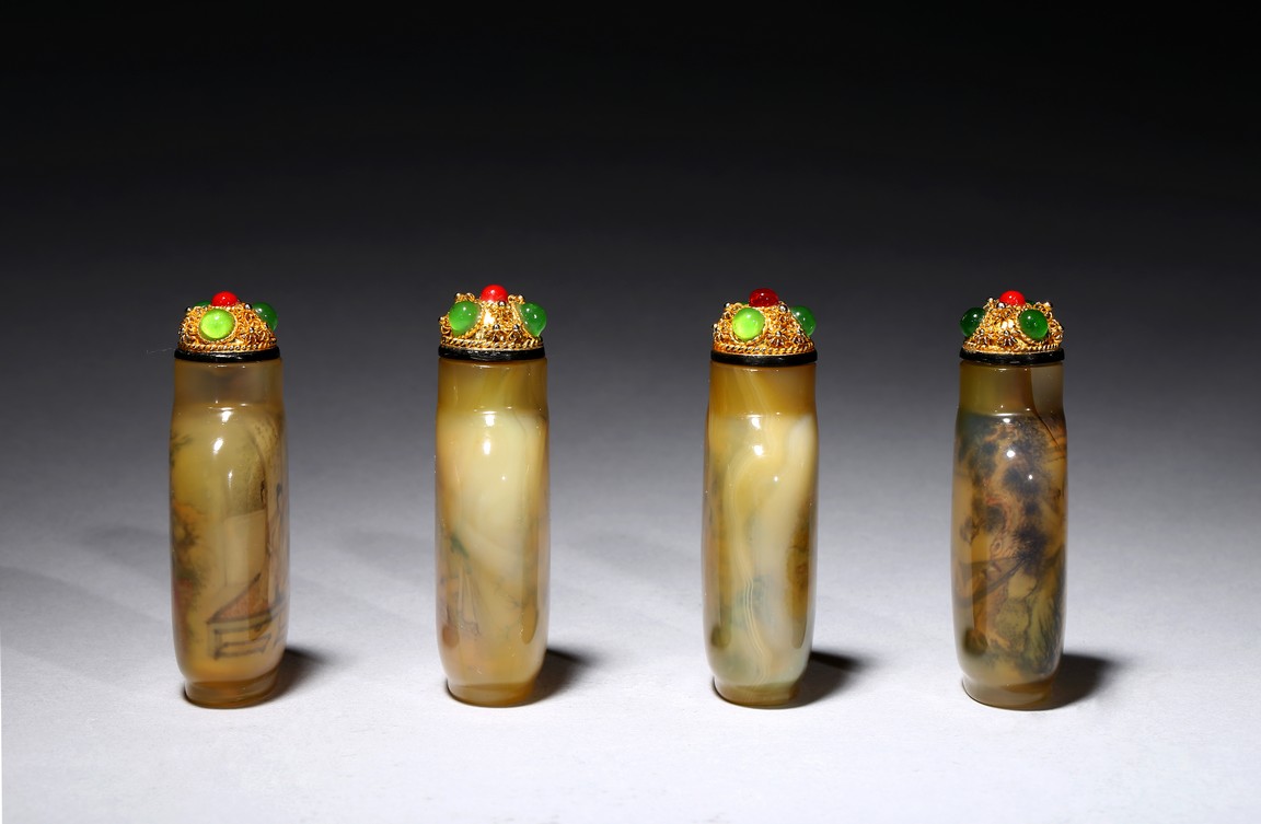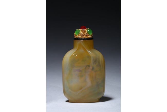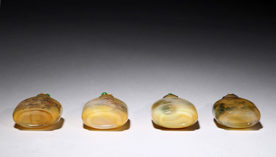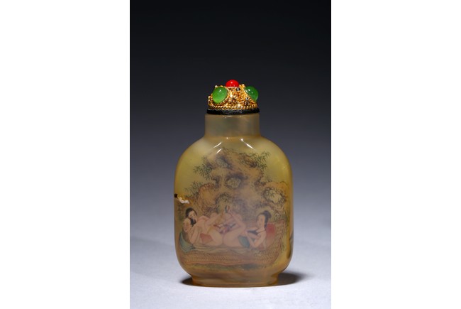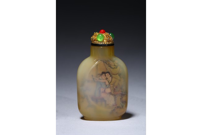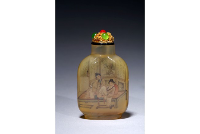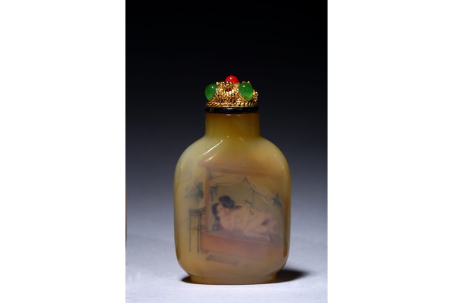 Each of rounded rectangular form sloping to a straight cylindrical neck, resting on an oval foot, finely painted inside with erotic scene, with fitted stopper inlaid with red and green gems.