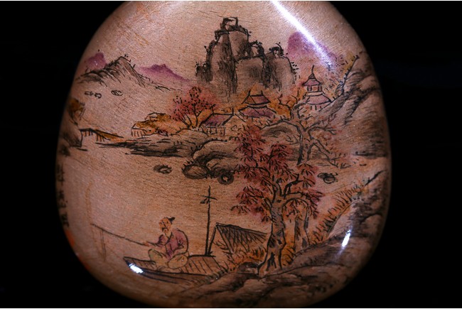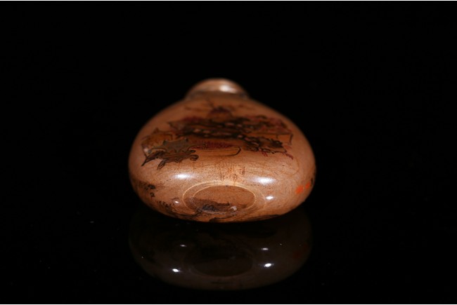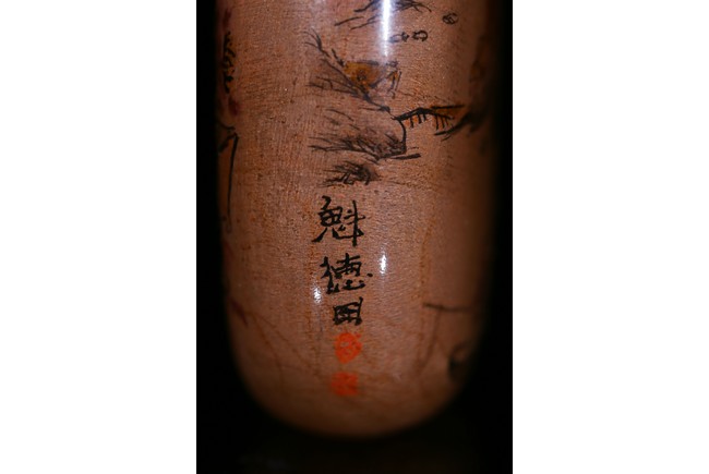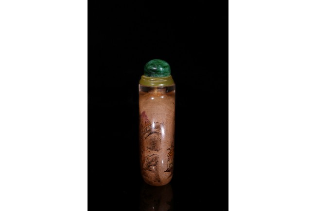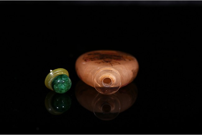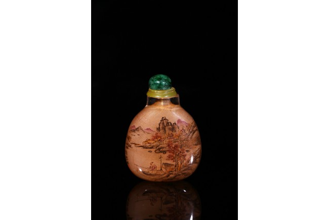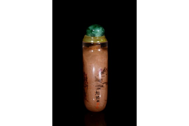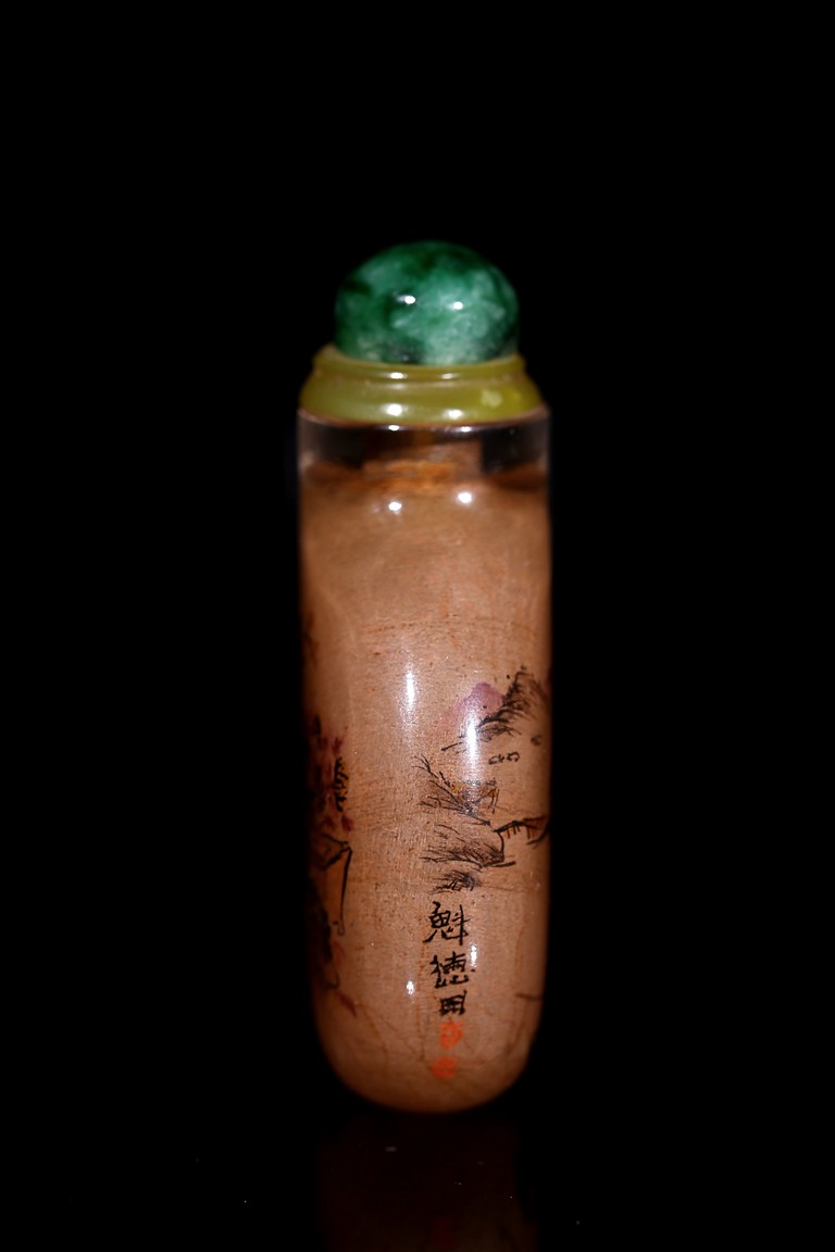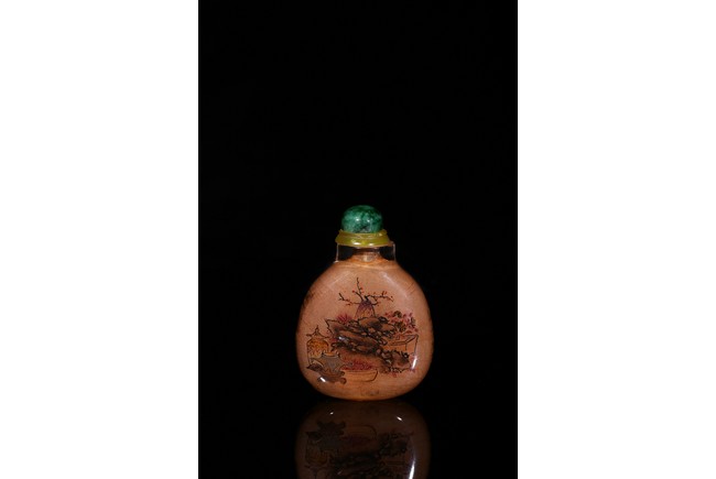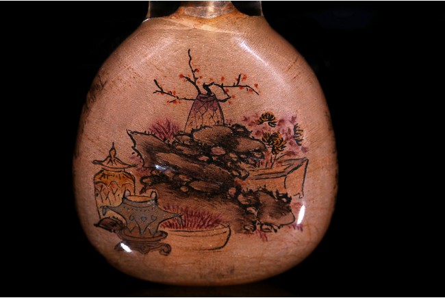 Of flattened circular form, rising from a short oval base, inside painted of a landscape scene on one side and bonsai groups on the other, bearing the signature of the artist Kui Detian. Qing Dynasty period.